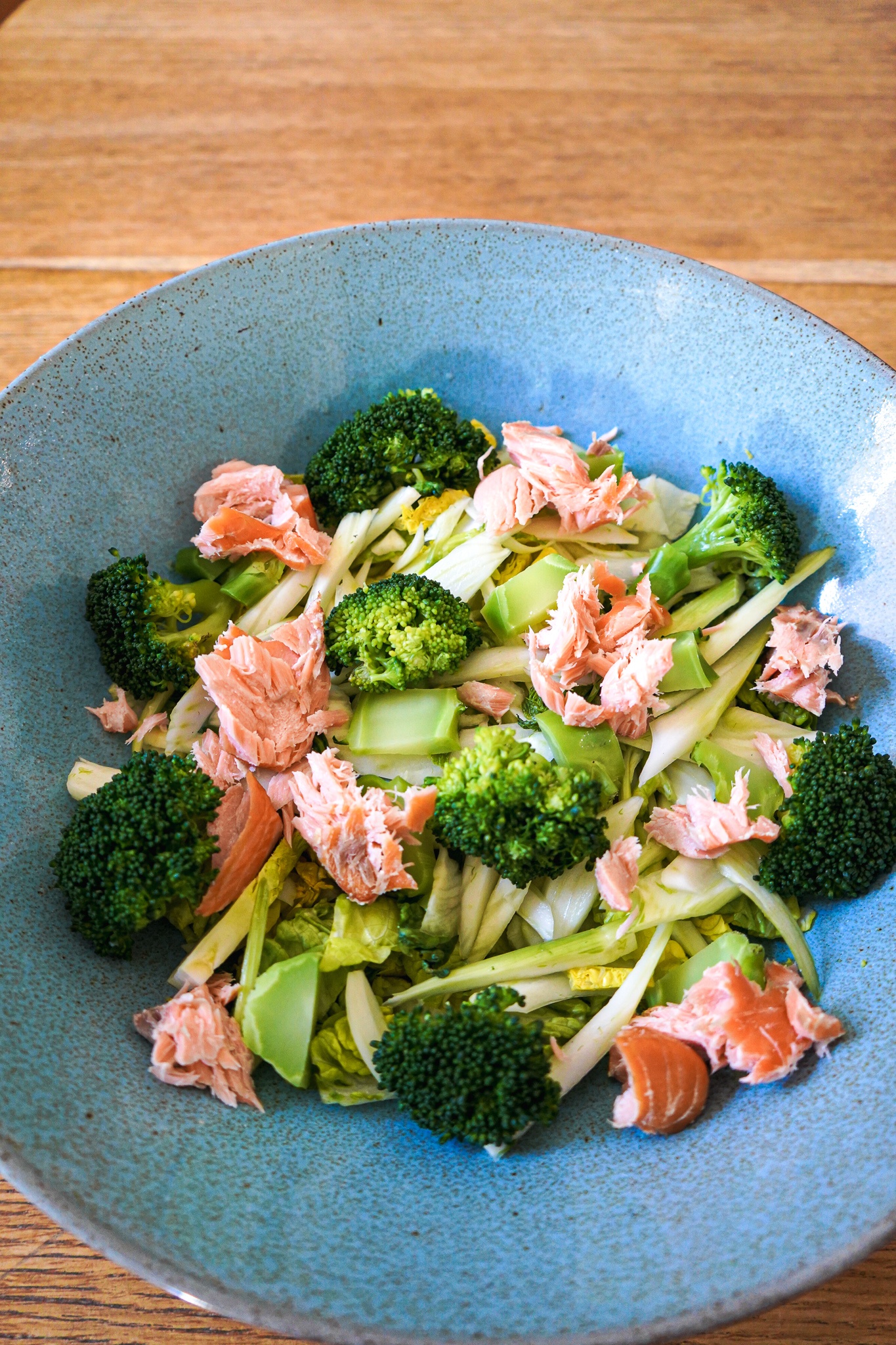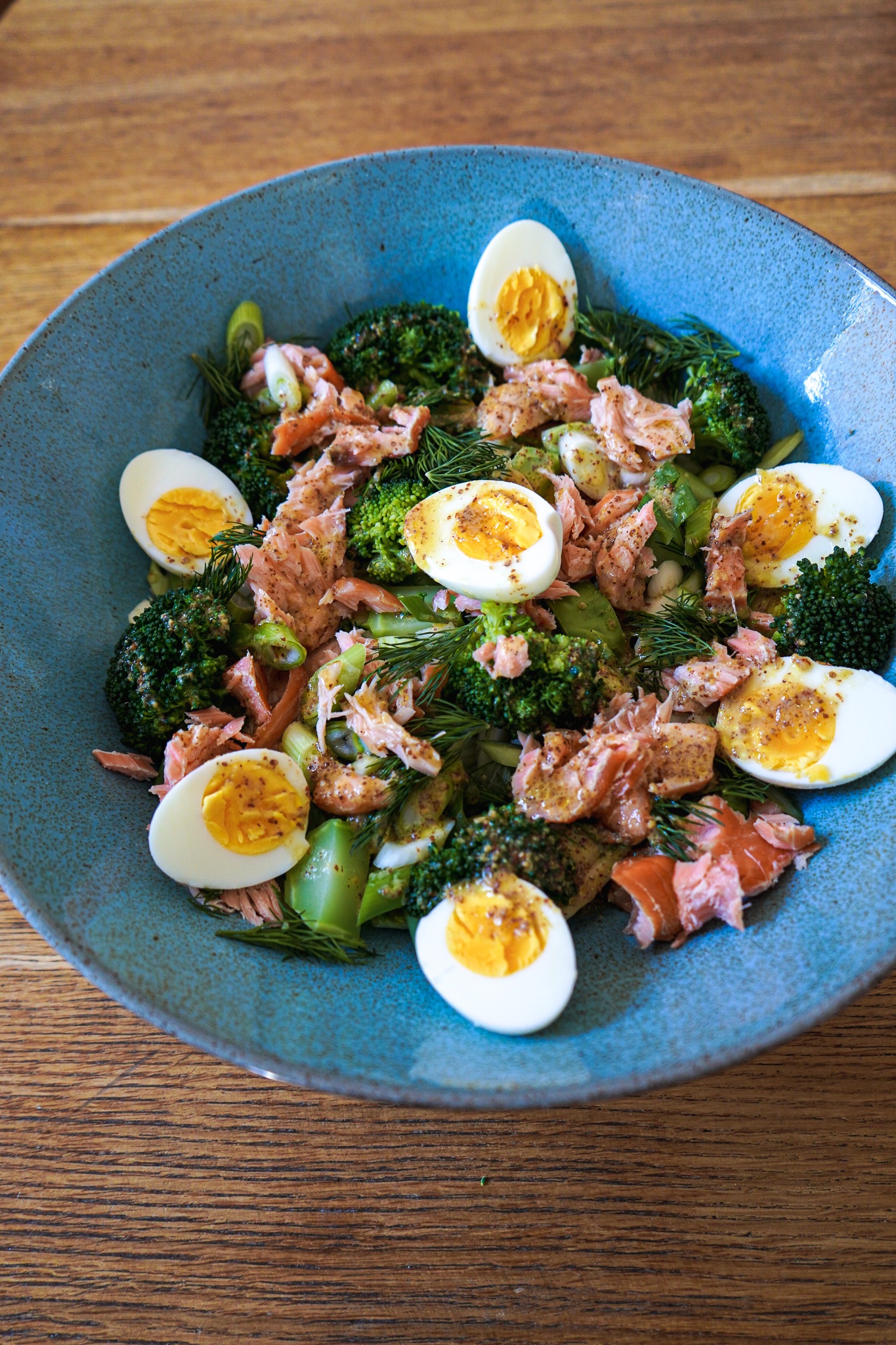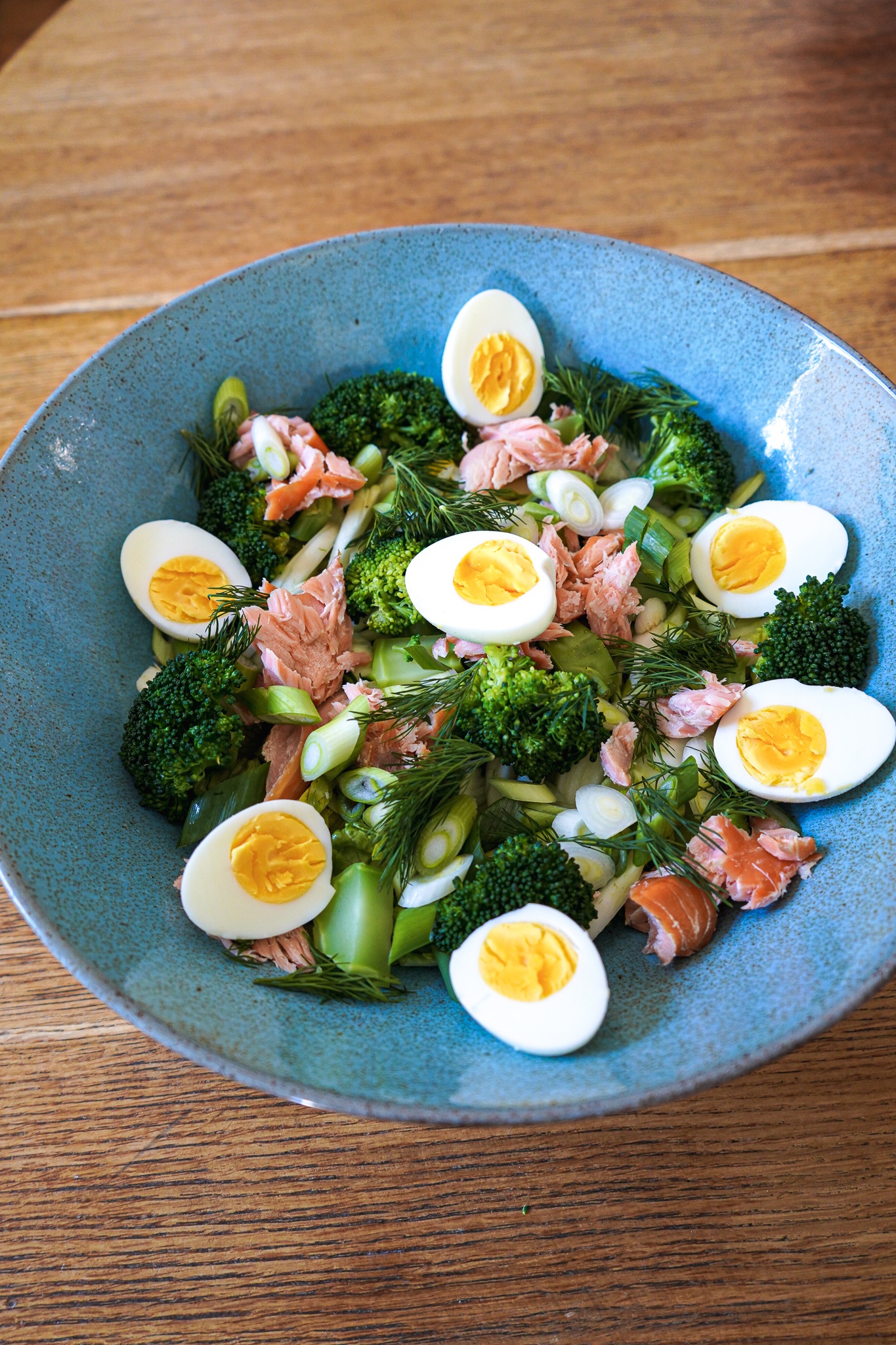 Römersalat in eine große Servierschale (die türkisfarbene ist von Motel a mio, aber leider schon älter) geben. Fenchel mit der Marinade hinzugeben. Brokkoli darüber verteilen. Lachs zupfen und ebenfalls darüber geben. Eier pellen und halbieren. Die Hälften rings in der Schüssel dekorieren. Dill zupfen und die Zweiglein zwischen die Goodies legen. Frühlingszwiebel in feine Streifen schneiden und etwas davon hinzugeben. Das Auge isst mit – macht einfach so, dass es hübsch aussieht.