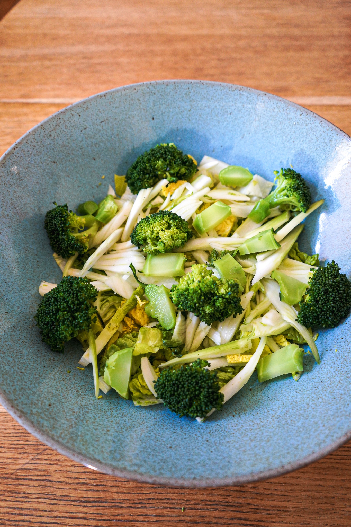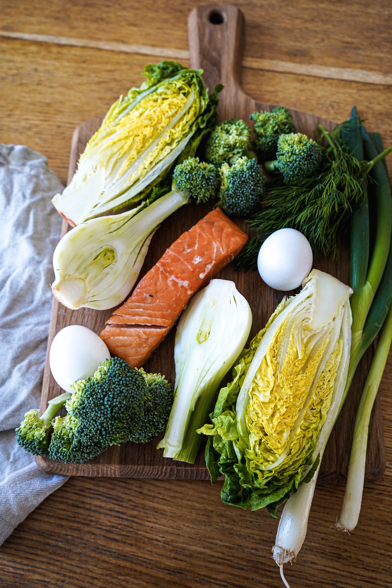 Lachs aus dem Kühlschrank nehmen. Stremel auf einem Küchenpapier abtropfen lassen. Brokkoli in Röschen schneiden, den Strunk in dünne Scheiben. Alles in kochendem Salzwasser blanchieren. Bio-Eier hart kochen (dauert ca. 9-10 Minuten), kalt abschrecken und auskühlen lassen. Frühlingszwiebel waschen und beiseitelegen. Fenchel waschen, halbieren, in dünne Streifen schneiden. In einer Schüssel mit 2 EL Apfelessig, 1/2 TL Salz und 1 TL Agavensirup mischen. Ziehen lassen. Römersalat waschen, trocknen, halbieren, Salatherzen entfernen. Die Salat-Hälften achteln und in kleine Stücke schneiden.