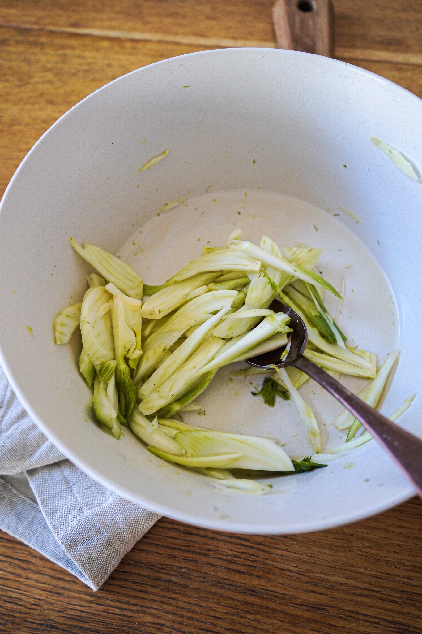 Beim Fenchel habe ich mir selber etwas ausgedacht, um dieses Gemüse als perfekte Salatzutat tauglich zu machen. Ich mag Fenchel aufgrund der anisähnlichen Geschmacks, aber roh muss man ihn lange kauen. Deshalb habe ich den Fenchel vorher dünn geschnitten und mit Essig, Salz und Agavensirup gepickled, also eingelegt. Das kann man auch mit roter Zwiebel machen, die ebenfalls gut in diesen Salat passen würden.