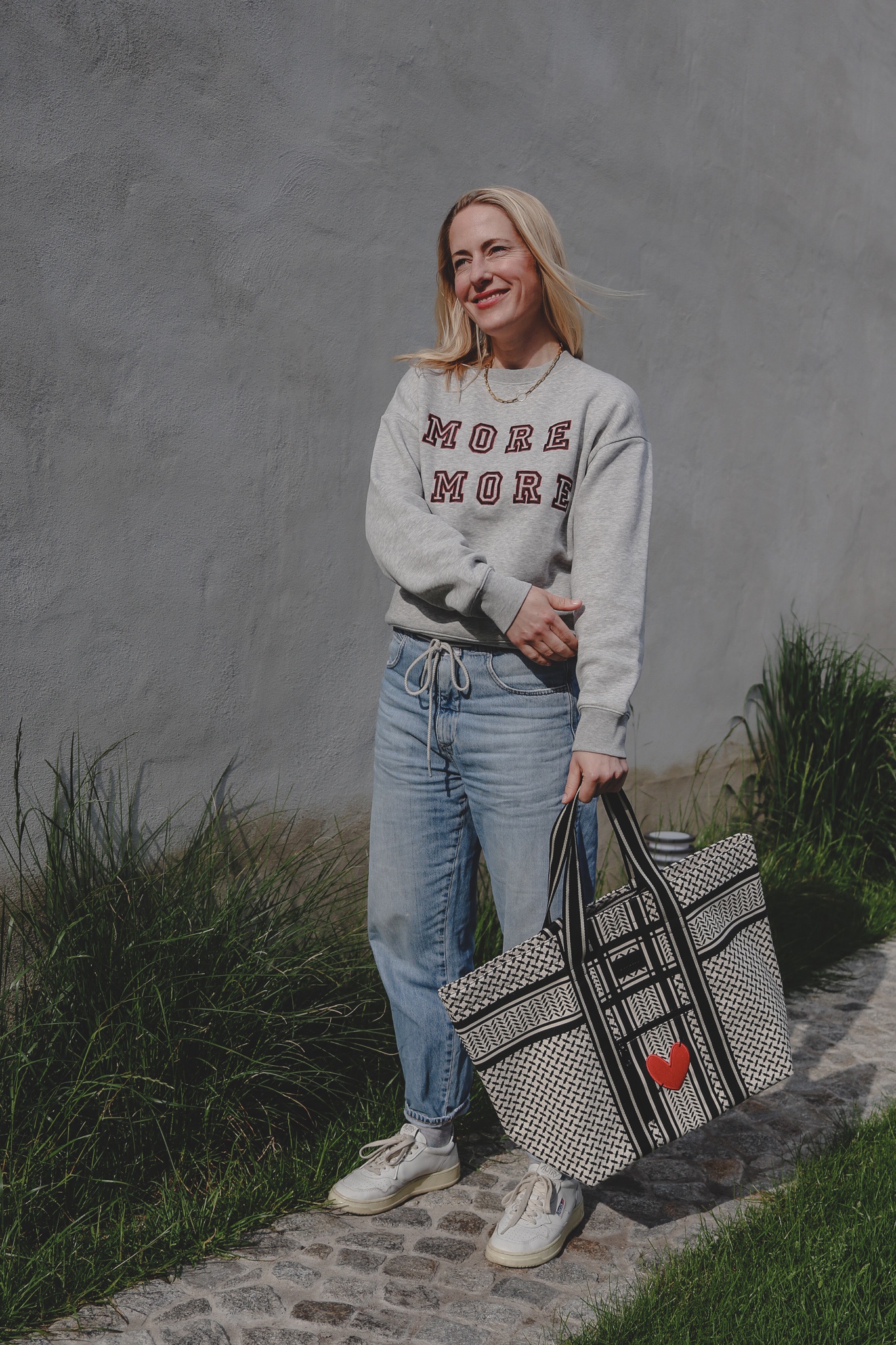 WERBUNG | Dieser Look ist ein typisches Lexi-Outfit: Sweater, Jeans, Sneaker und eine Tasche, in die der halbe Haushalt passt. Wobei ich, seitdem meine Tochter in die Kita geht, im Alltag immer einen großen Rucksack mit mir herumschleppe, in dem nicht nur Feuchttücher und Wechselwäsche, sondern auch Dinkelbrezeln und Mais Pufuletis herumfliegen.