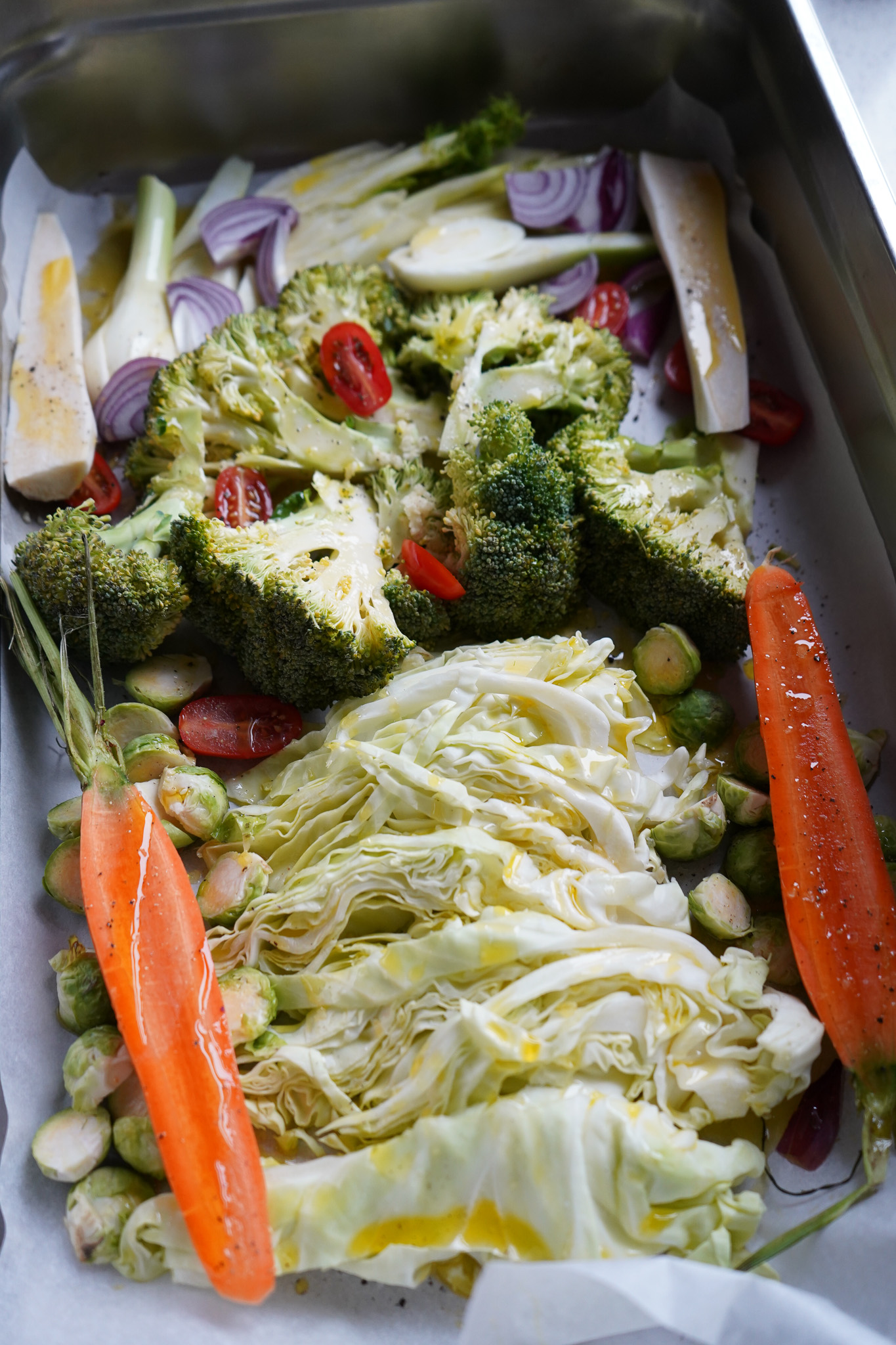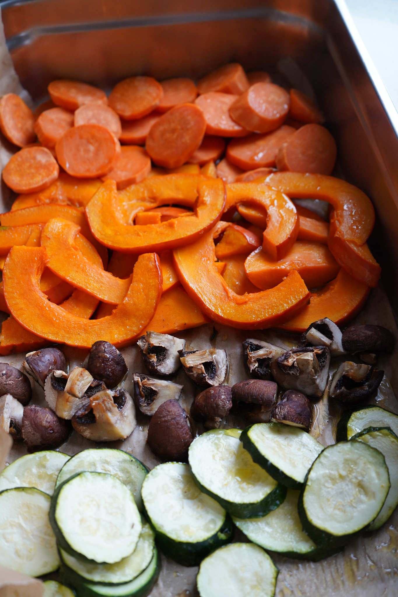 Ich schnippel jede Art von Gemüse, das ich im Kühlschrank finden kann, klein und mariniere es rundherum mit Meersalz, Pfeffer, Knoblauch, Thymian oder Rosmarin und reichlich Rapsöl.