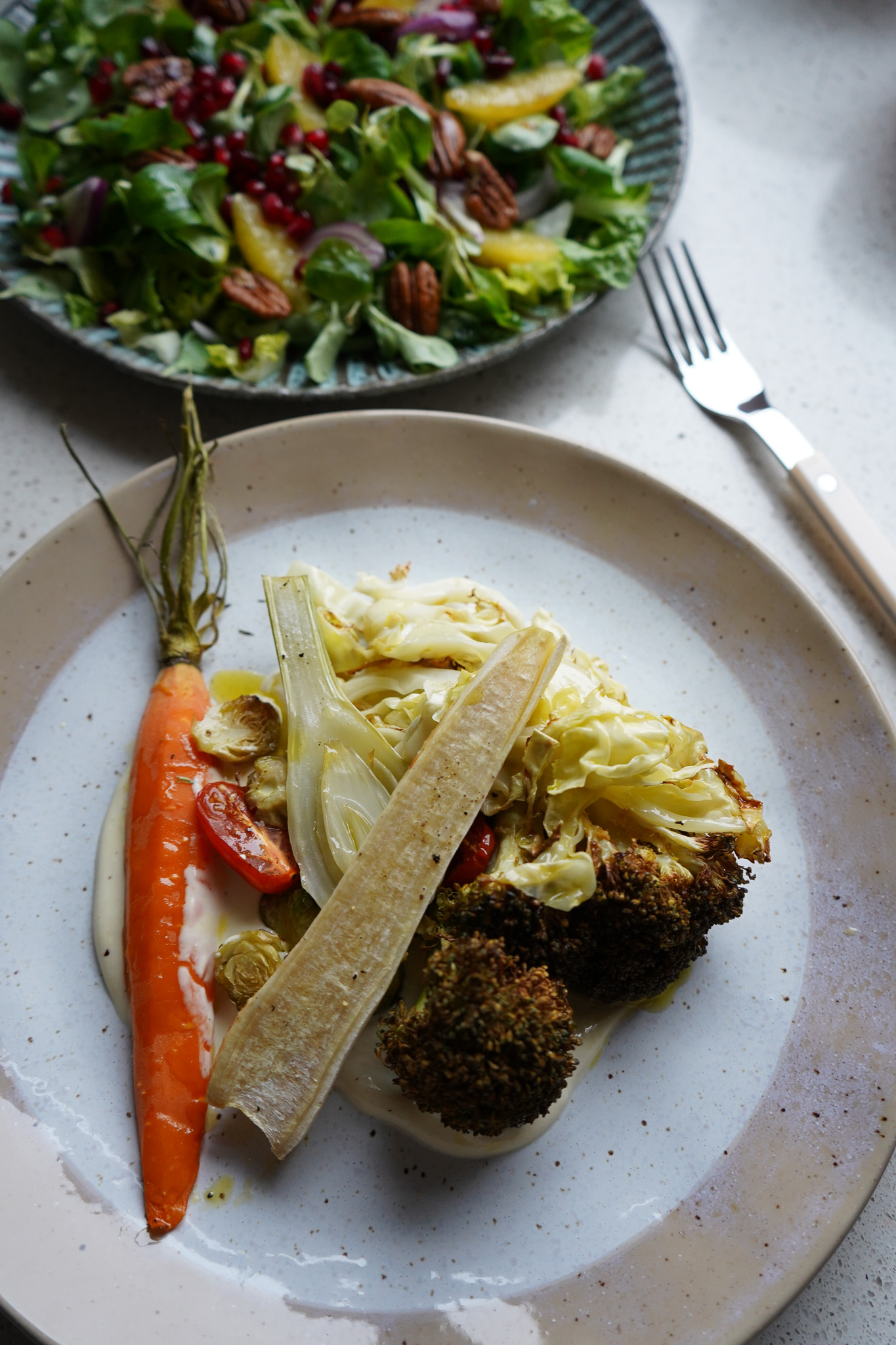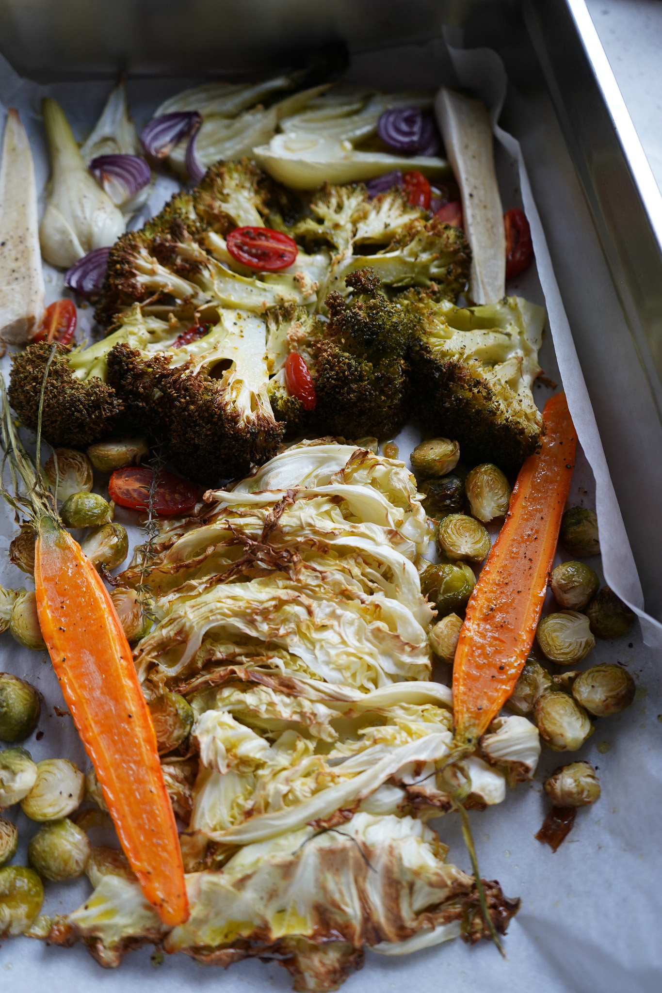 Neun Monate bin ich jetzt wieder Vegetarierin, wobei eigentlich: Pescetarierin. Ich esse kein Fleisch, aber manchmal Fisch, sehr gerne Eier und Käse. Vor allem aber esse ich Berge von Gemüse. Von heißen Suppen und Eintöpfen bekomme ich schnell Flushs, deshalb schiebe ich alles in den Ofen. Spitzkohl, Fenchel, Pastinaken, Rosenkohl, Brokkoli, Tomaten, Rotkohl: