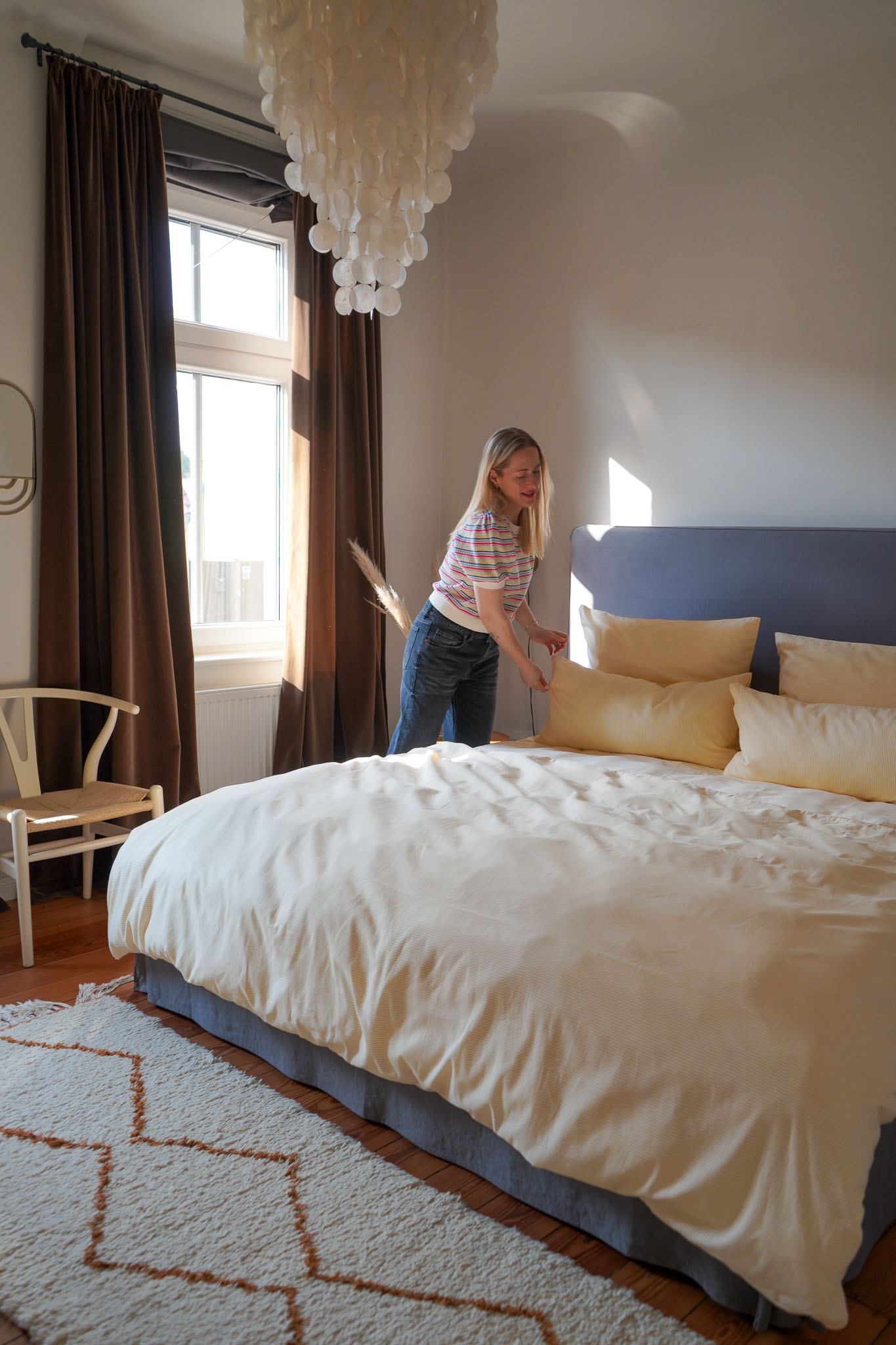 Hallo liebe Alexa, danke für den schönen Beitrag. Ich habe eine Frage bezüglich des Bettes – was ist das für eine Marke? Ist das ein Blaugrau? Danke für die Info und ich wünsche dir einen schönen Tag!