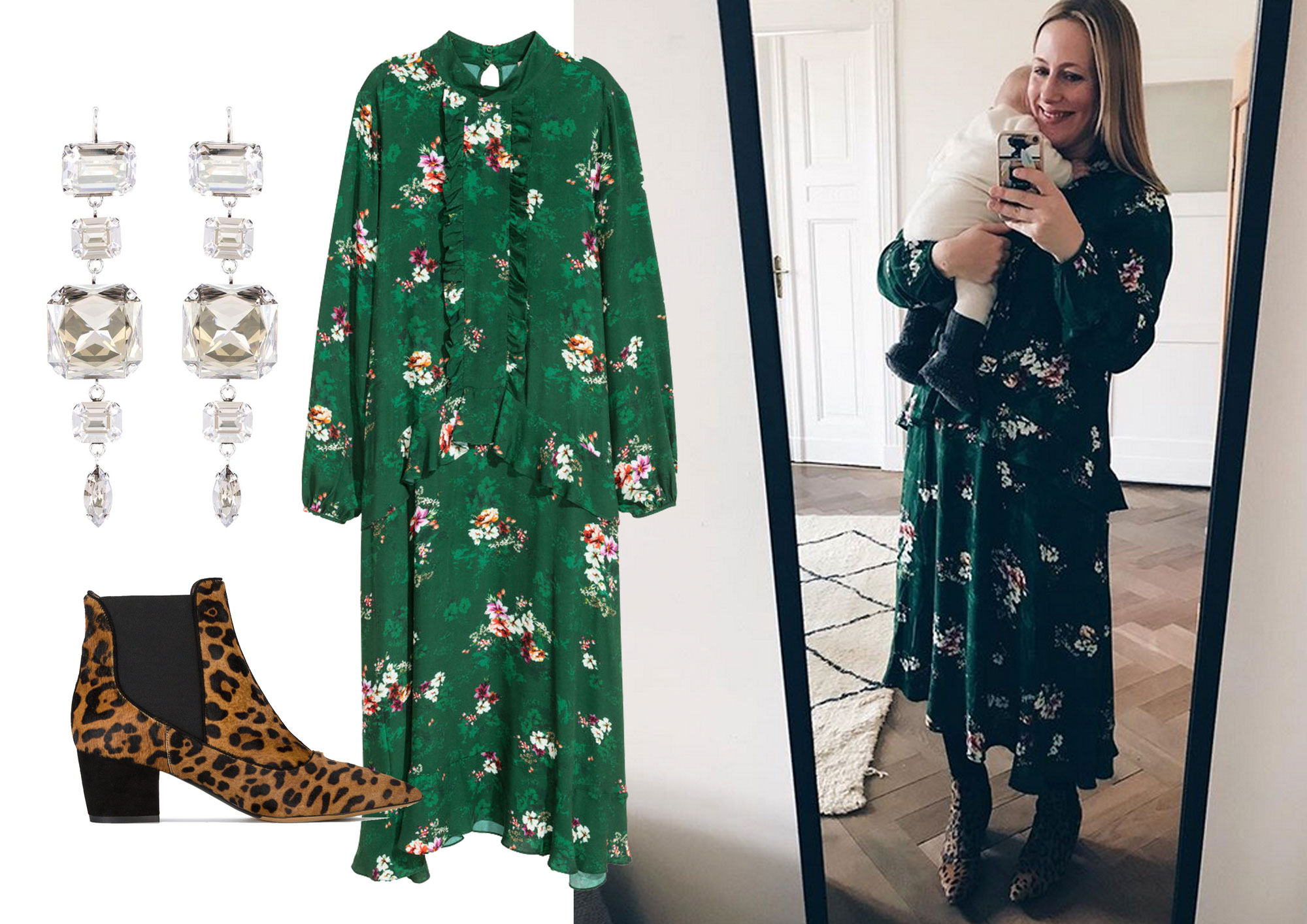 Kleid: H&M, Schuhe: Tabitha Simmons, Ohrringe: Isabel Marant, Teppich: Trendcarpet, Babyoutfit: Babybox by Winzig & Klein