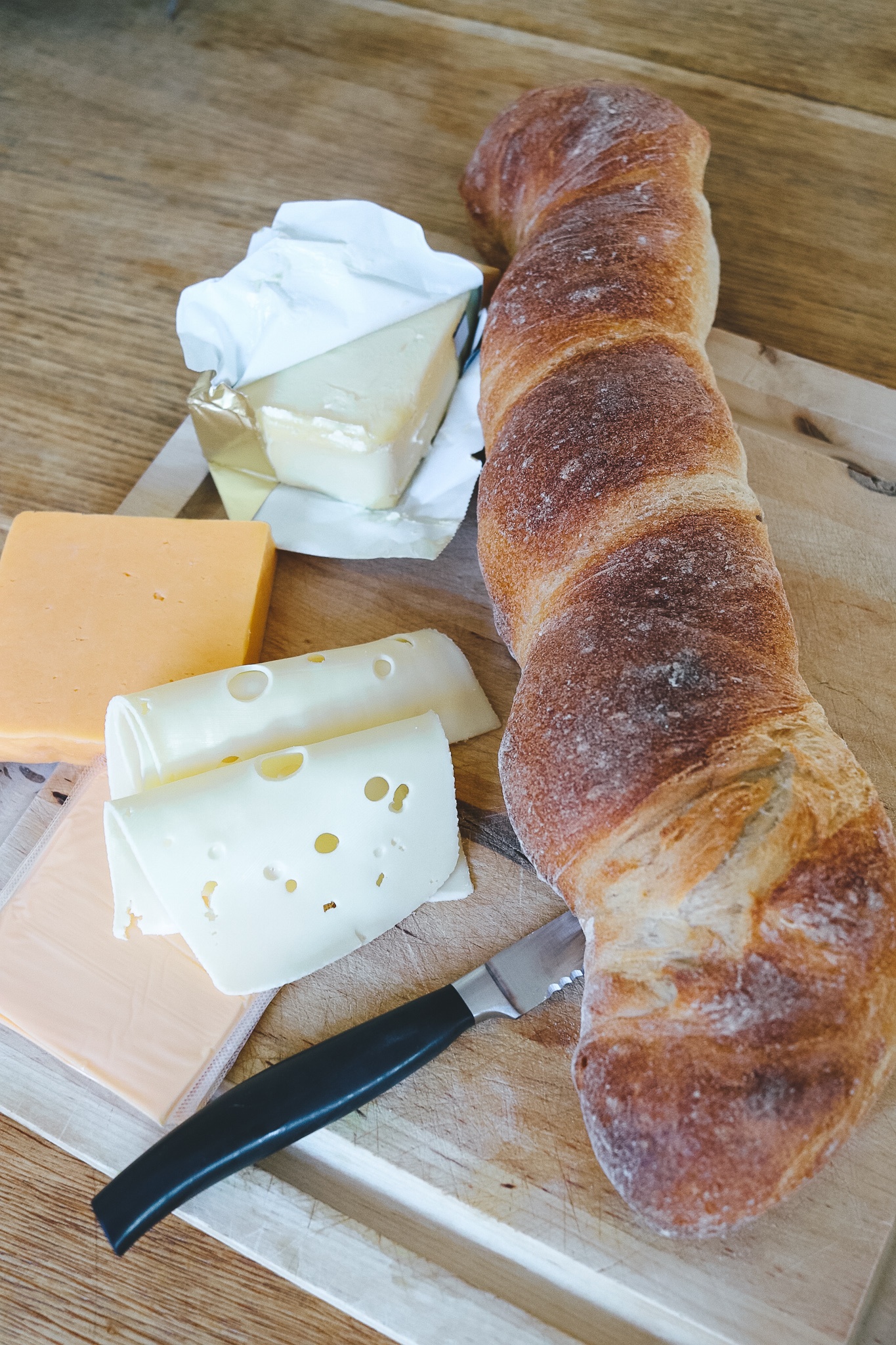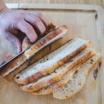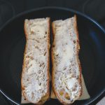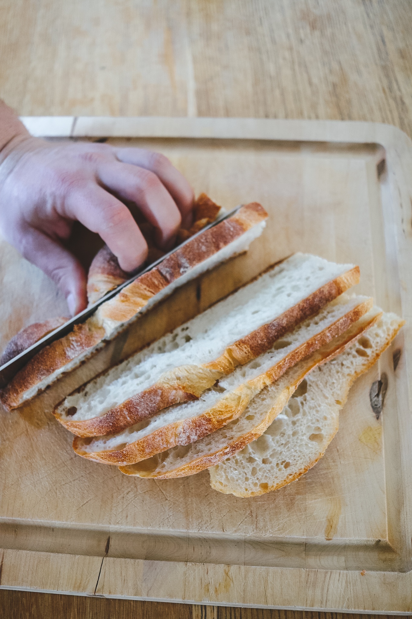 Baguette mit einem Brotmesser längst – nicht wie üblich quer – in möglichst grade, nicht zu dicke Scheiben schneiden. Das ist der erste Hack. Es ist wichtig, dass die Scheiben nicht wellig geschnitten sind, weil sie sonst später in der Pfanne nicht gleichmäßig bräunen können. Wenn ihr einen Sandwich-Maker habt, dann könnt ihr die Brote darin natürlich zusammenquetschen, aber in der Pfanne gebraten sieht ein Grilled Cheese Sandwich um ein vielfaches geiler aus und schmeckt fluffiger!