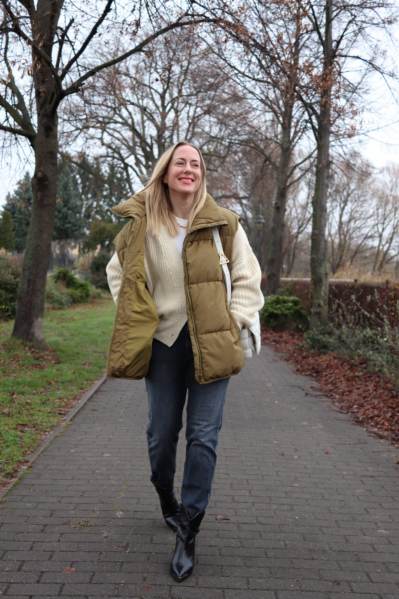 Weste: H&M, Cardigan: Yes My Love, Jeans: Pedal Pusher in Dark Grey von Closed, Stiefel: Yes My Love, Tasche: Bottega Veneta Padded Cassette Bag über Fobe Abo