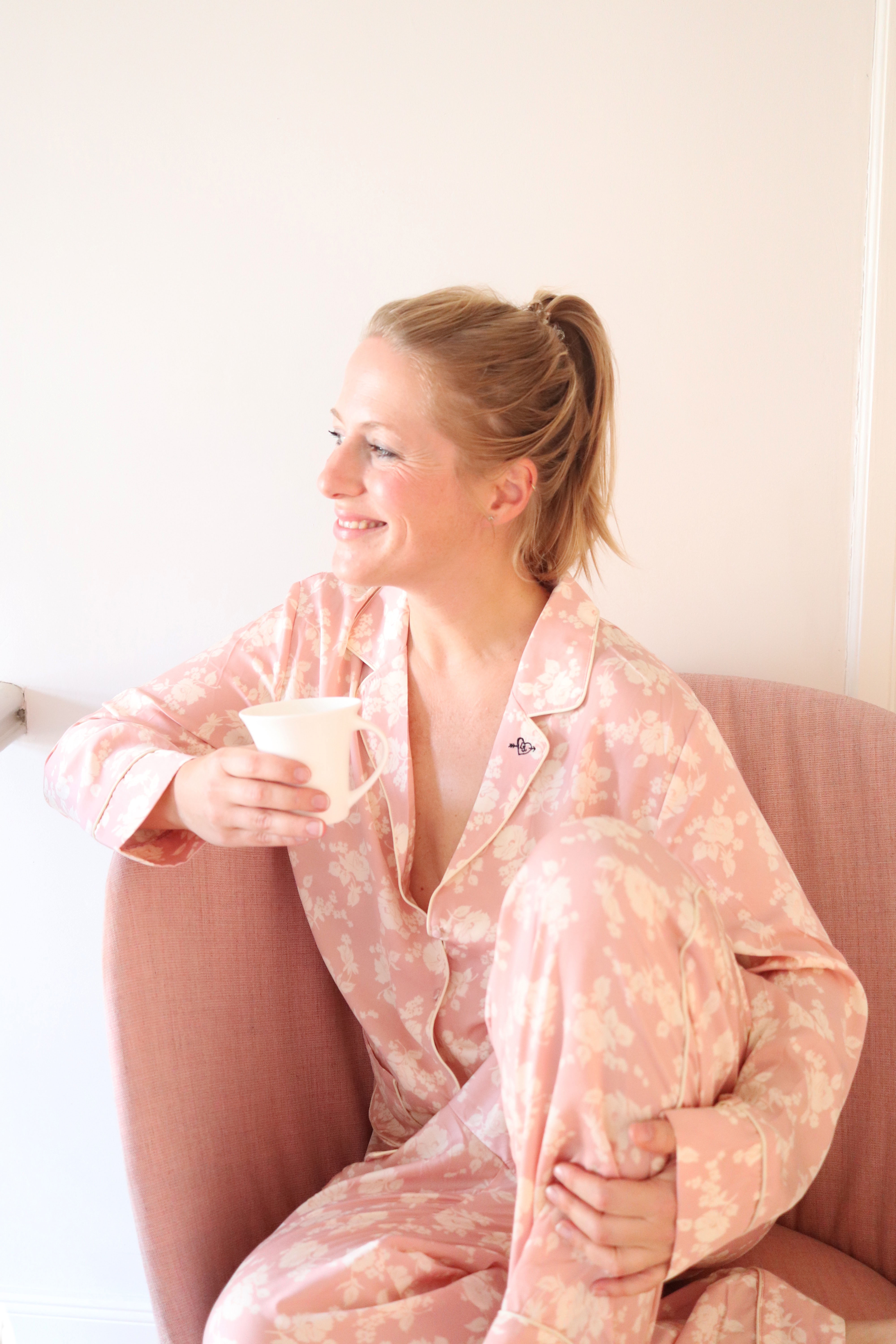 Der Pyjama auf dem Foto ist von H&M x Love Stories. Der Stuhl ist von Freifrau Sitzmöbelmanufaktur.