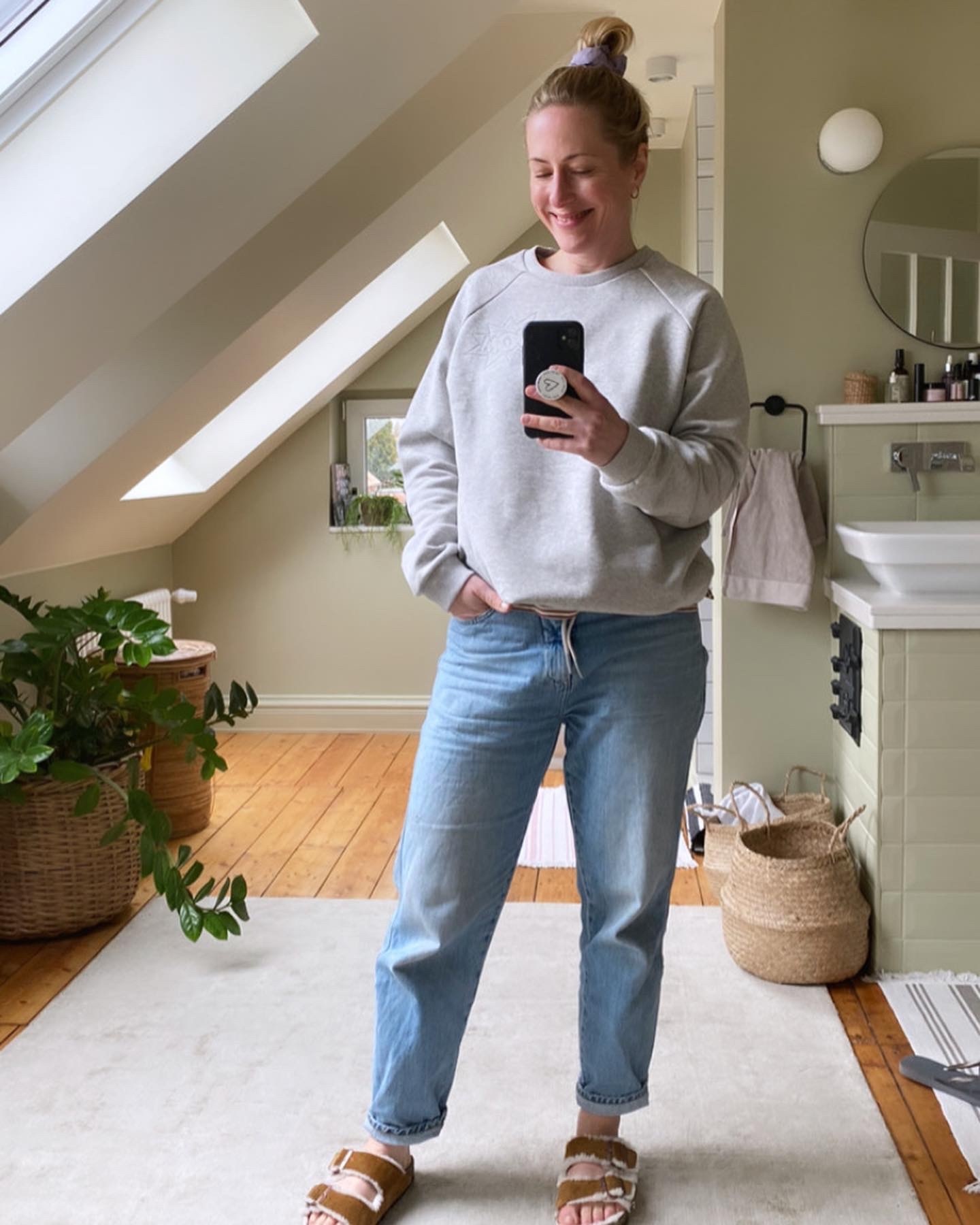 4. Sweater: Zwergenkleid (so ähnlich hier), Jeans: „Lexi“ von Closed (so ähnlich hier), Sandalen: Birkenstock