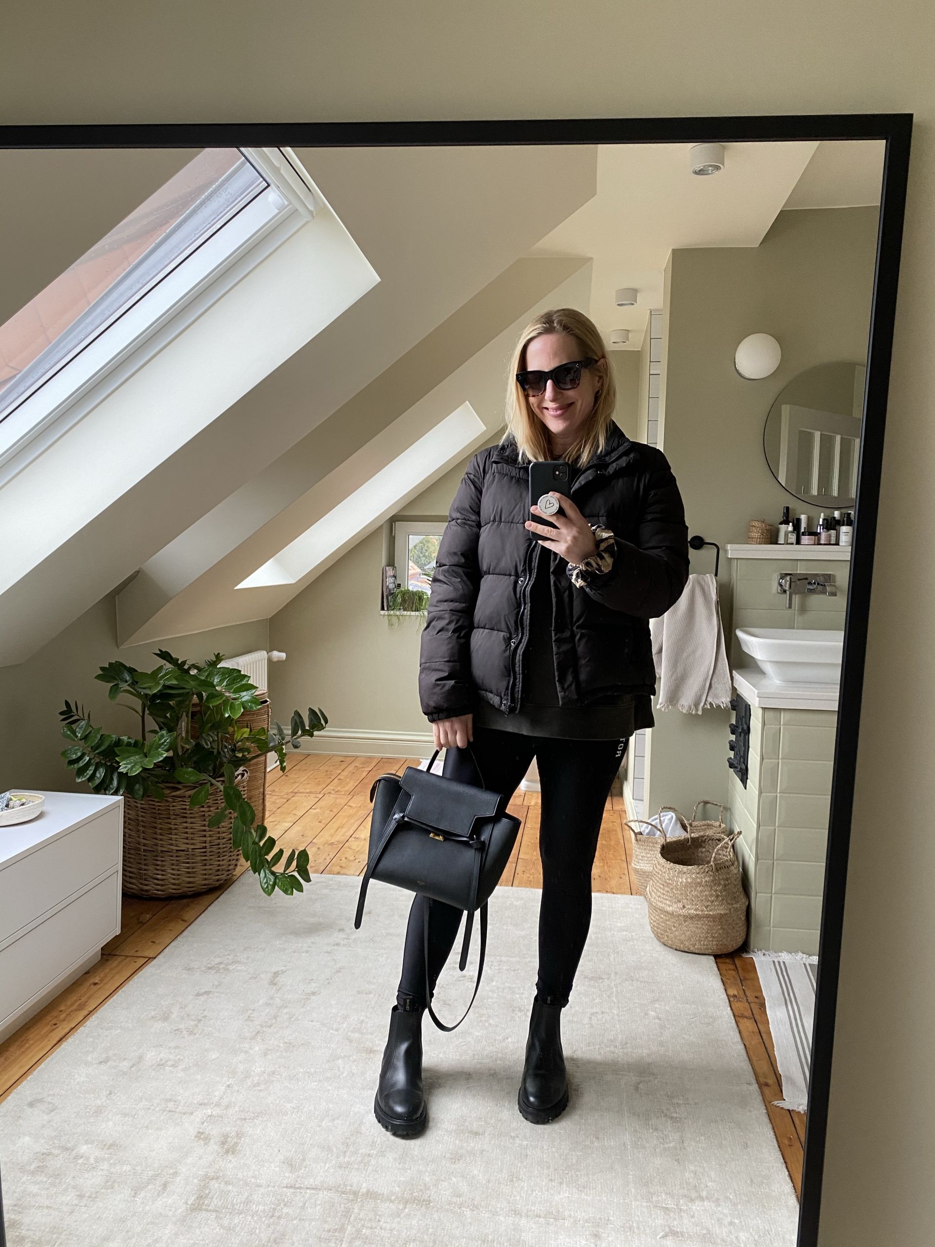 6. Sonnenbrillen: Celine, Jacke: Samsoe & Samsoe, Sweater: Sunday By Rotate, Leggings: Sunday by Rotate, Chelsea Boots: Celine, Tasche: „Nano Belt Bag“ von Celine, Scrunchie: Ganni