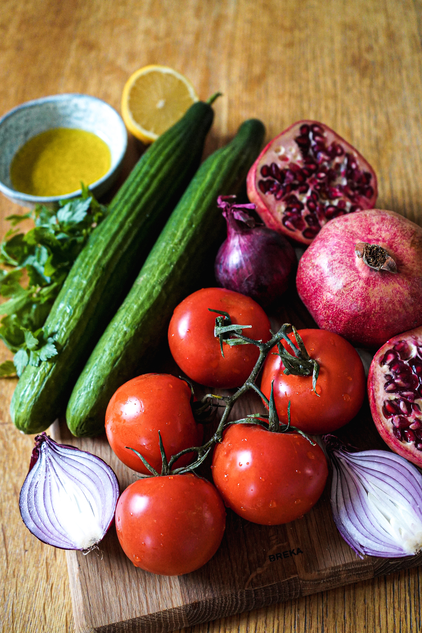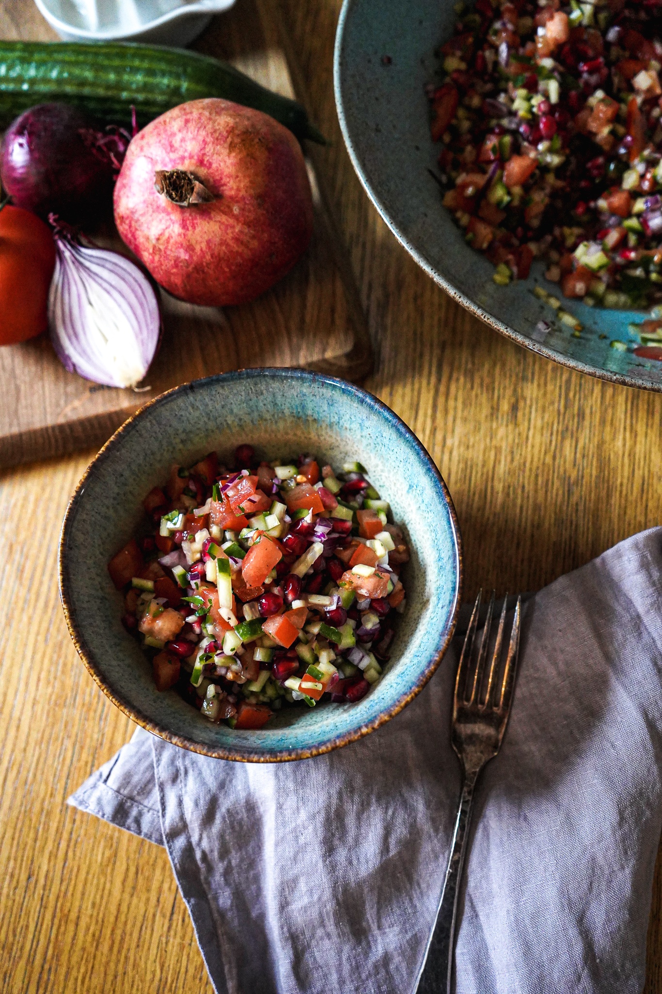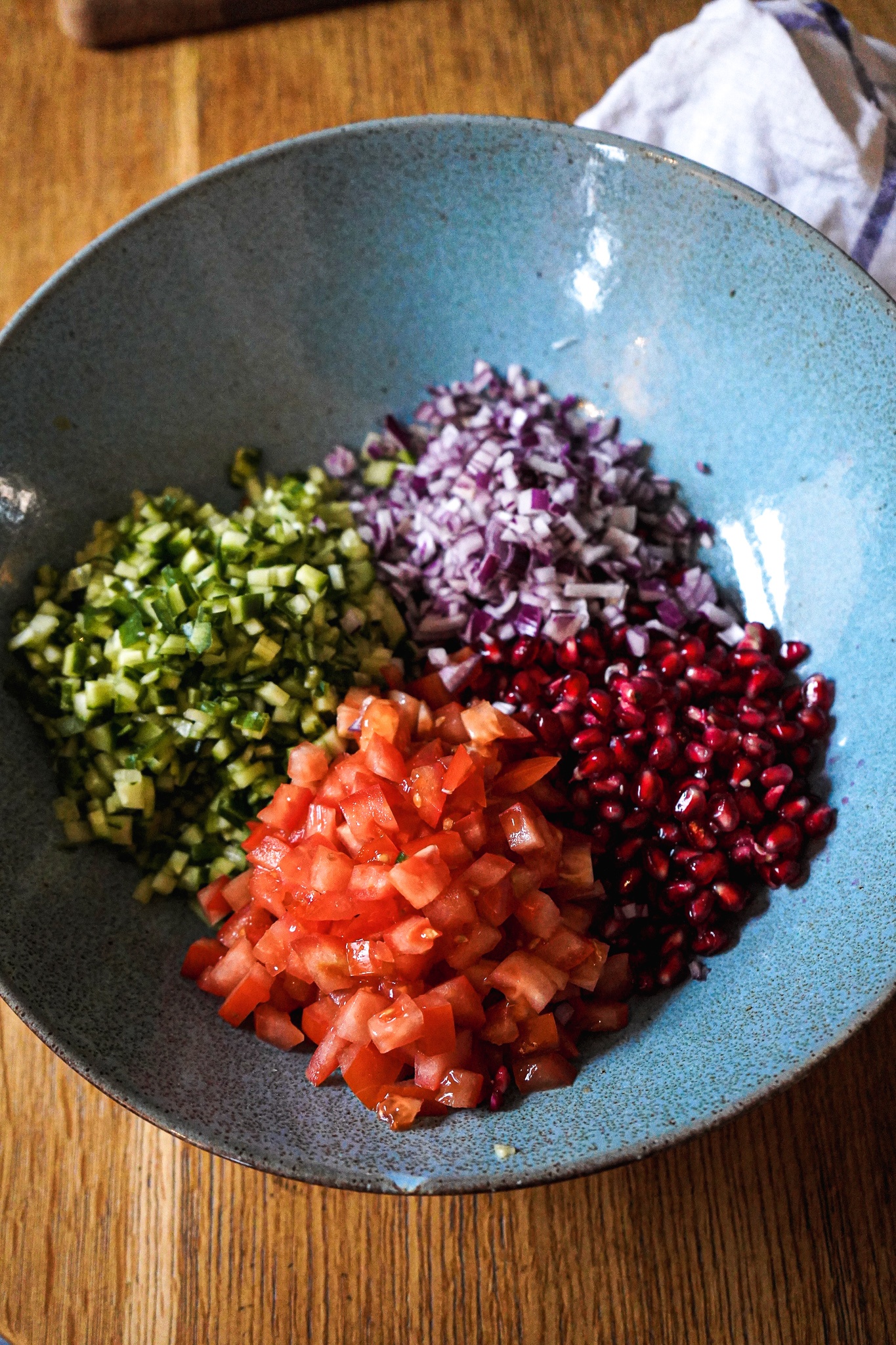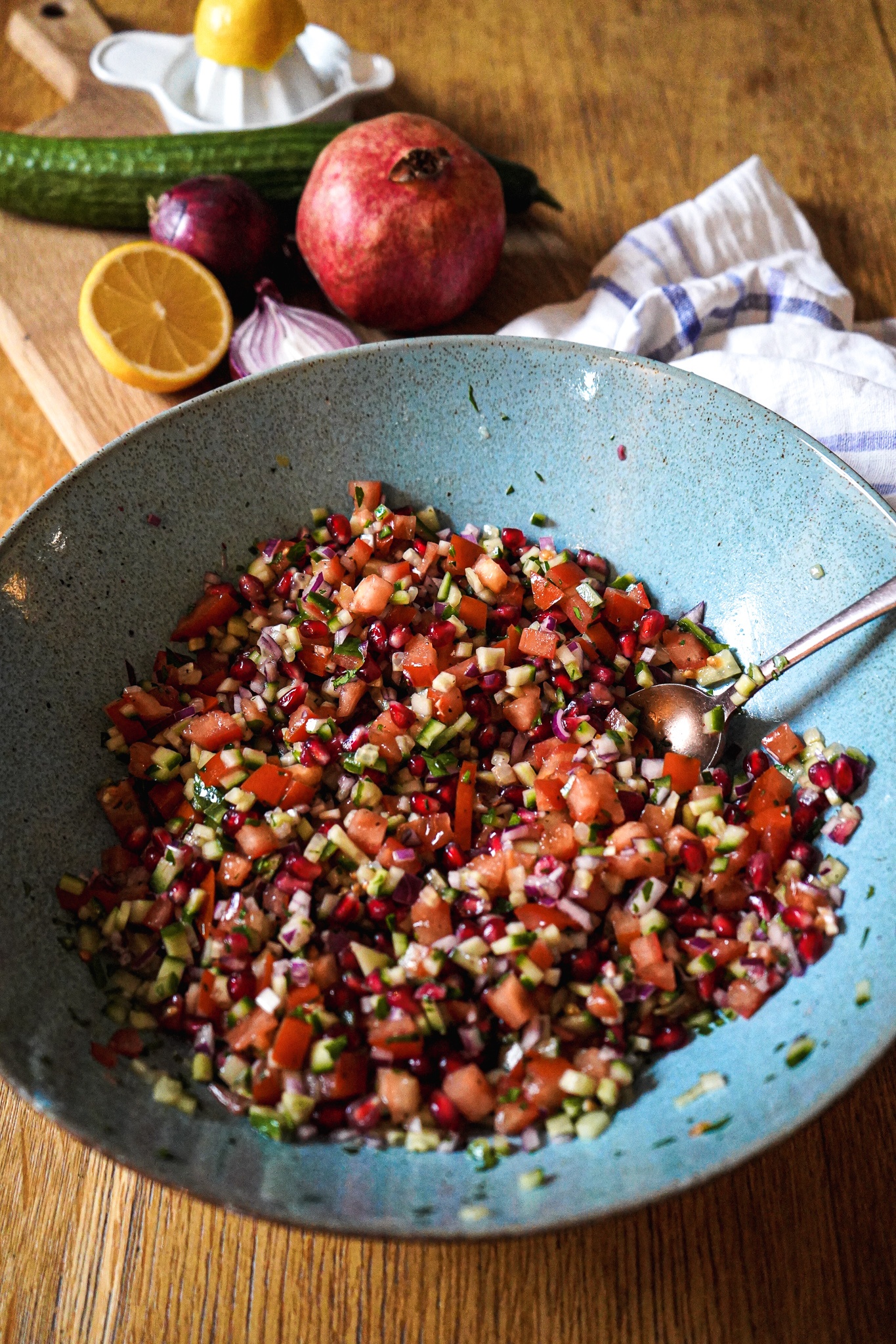 Dieser Salat ist auch als „Jerusalem Salat“ bekannt. Er sieht nicht nur bunt und hübsch aus, sondern ist sowohl familien- als auch partyfreundlich. Das bedeutet sogar Kinder mögen diesen Salat, zumindest meine Tochter, die auch gerne bei der Zubereitung hilft. Ich habe ihn mit Hummus und Pitabrot früher gerne bei einem Imbiss namens Sababa auf der Kastanienallee in Berlin bestellt. Er ist wirklich einfach nachzumachen und eignet sich mit entsprechenden Toppings als Hauptmahlzeit oder Beilagensalat zu Fisch, Fleisch, Kartoffelgratin, Pasta, Omelette, …