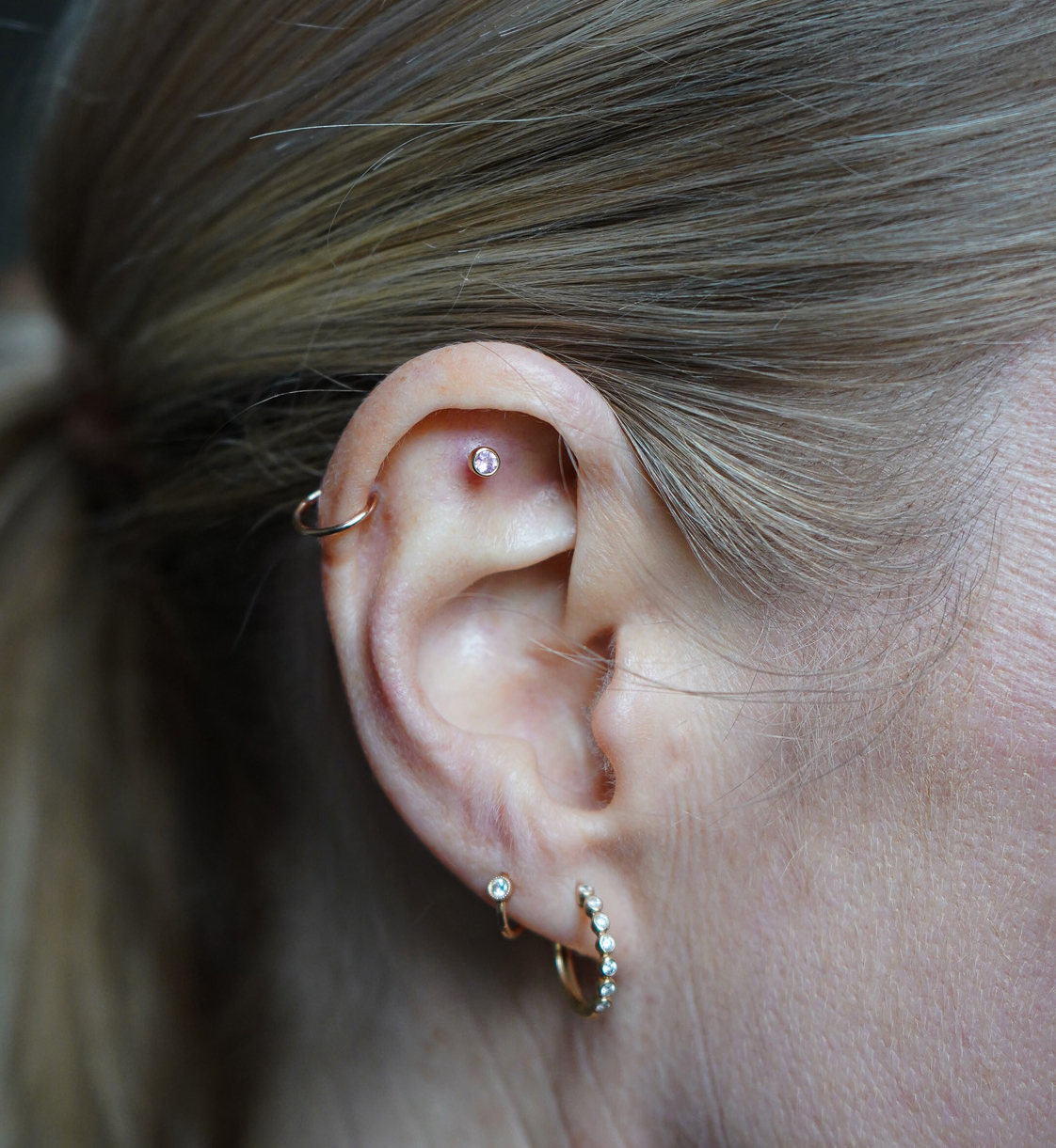 Diese Piercings habe ich jetzt: 2x Helix, 1x Flat, 1x Orbital, 4x Lobe Piercing. Meine Ohrringe sind immer Echtschmuck, weil ich sie jeden Tag trage und selten abnehme. Die Piercings bestehen aus Gold- oder Roségold, sind mit Diamanten, Topas oder Saphiren besetzt. Damit trage ich meine Altersvorsorge am Ohr.