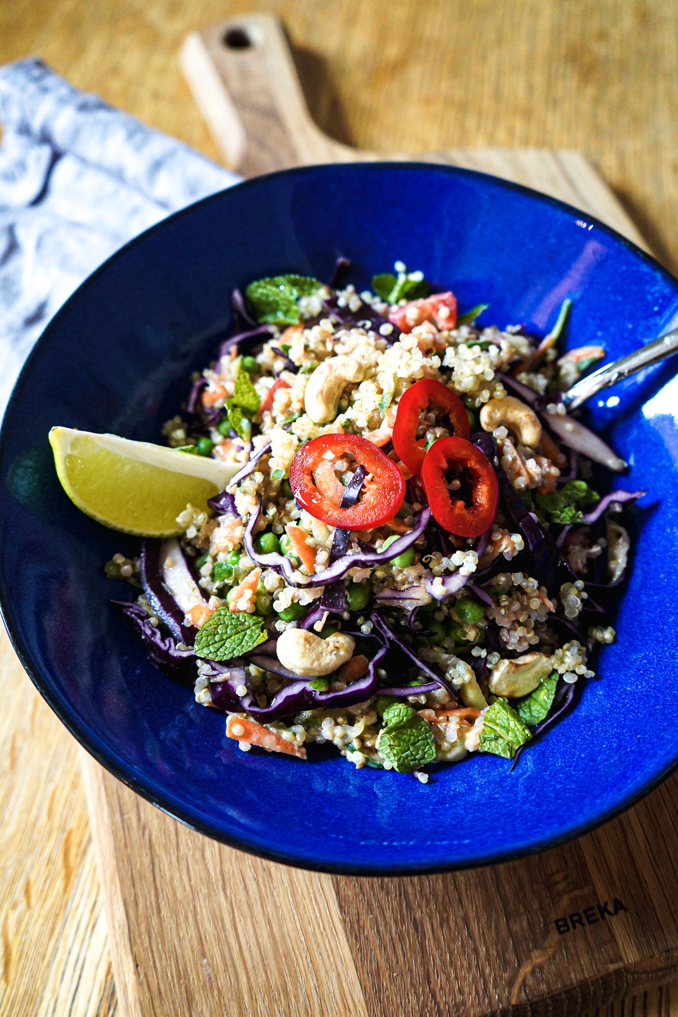 Rotkohl kennt man im Döner, mir schmeckt er besonders gut in Kombination mit Quinoa, dem nach wie vor sehr angesagten Pseudogetreide, welches durch die Zugabe des Rotkohls mehr Biss bekommt. Ich ernähre mich vorrangig nach dem Low Carb Prinzip, deshalb ist Quinoa für mich ein Grundnahrungsmittel. Pur schmeckt Quinoa eher fad. Dieser Salat ist nicht nur lecker und macht satt, sondern eignet sich hervorragend zum Vorkochen („Meal Prep“).