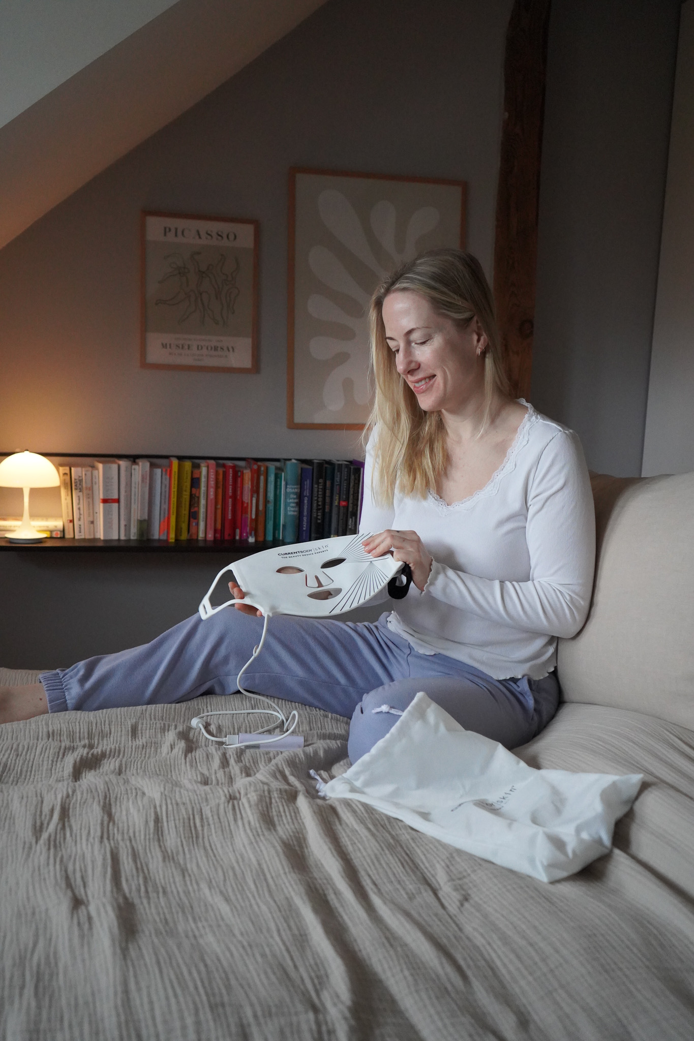 Die CurrentBody Skin LED Lichttherapie Maske gleicht professionellen Salon-Geräten und bietet 100 % sichere und schmerzfreie Ergebnisse. Am besten funktioniert für mich die Anwendung im Liegen. Ich verwende die Maske 2-3x die Woche für 10 Minuten, zum Beispiel im Shavasana nach meiner Yoga-Praxis oder abends zum Entspannen im Bett. Vorher trage ich ein Hyaluron- oder Collagen-Serum auf. Meine Tages- oder Nachtpflege verwende ich erst danach, weil die Haut nach der Lichttherapie aufnahmefähiger ist. Meine Haut sieht nach der Anwendung immer frischer und gleichmäßiger aus.