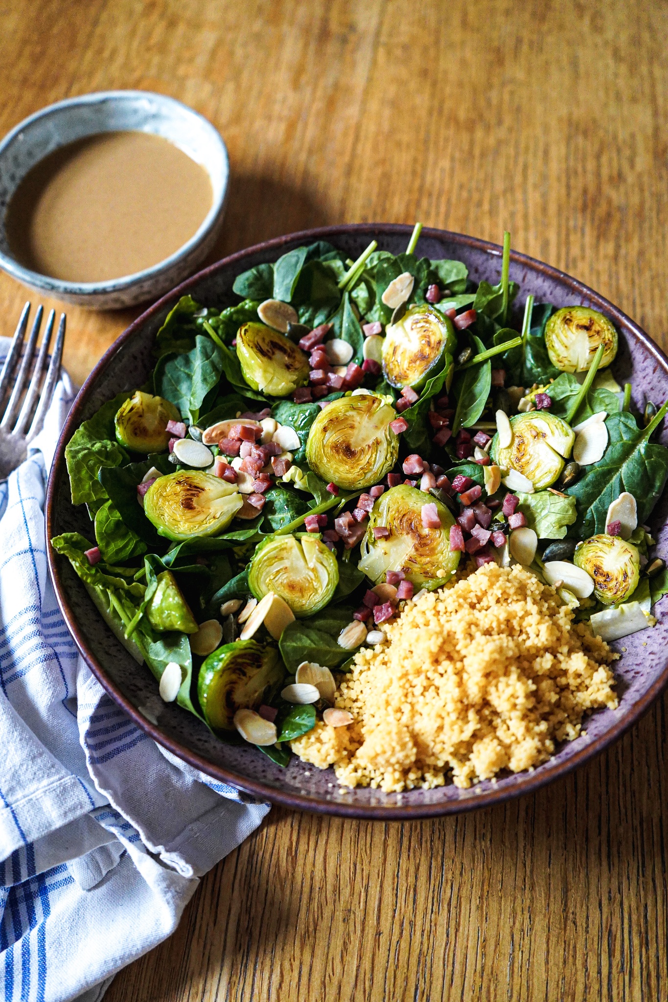 Wie viele Kinder habe ich Rosenkohl früher gehasst. Heute könnte ich mich reinlegen. Klar, dass es auf meinem Blog einen schönen Salat mit dem winterlichen Grünzeug geben muss! Aber nicht grau und matschig zerkocht, sondern knackig grün blanchiert und dann kurz in der Pfanne geröstet. Das lohnt sich nicht nur geschmacklich. Rosenkohl hat jetzt Saison und enthält Vitamine wie A und C sowie Mineralstoffe wie Magnesium. In Kombination mit knusprigem Speck (oder Räuchertofu) und einem cremig-nussigen Miso-Sesam-Dressing wird der Rosenkohl zum Umami-Feuerwerk auf eurem Teller, versprochen.