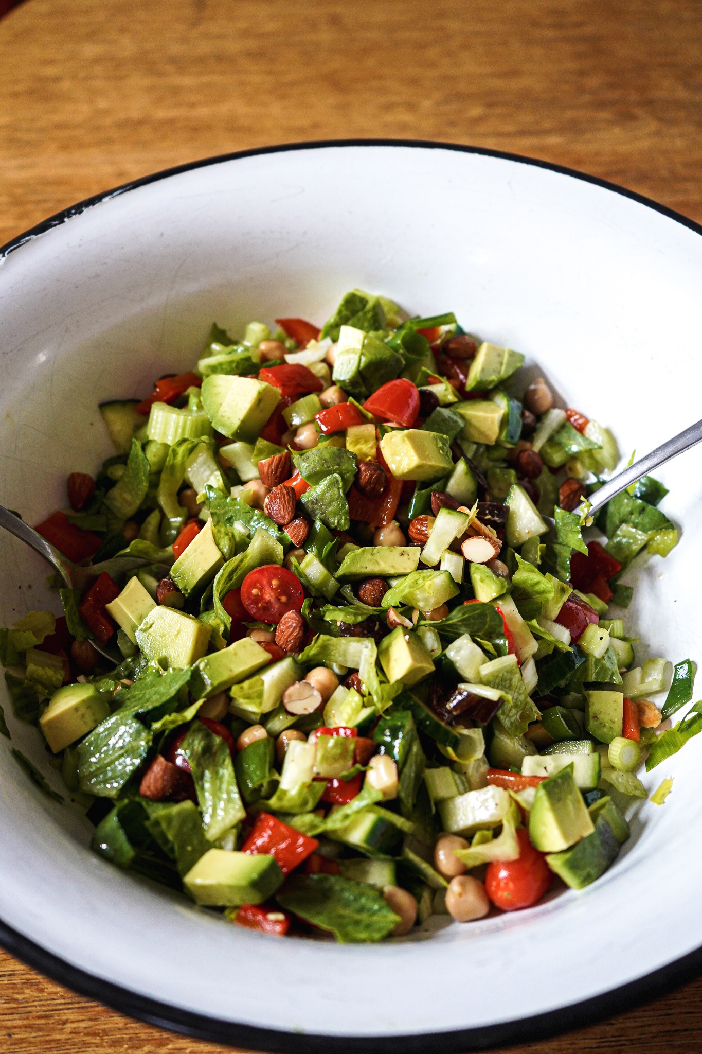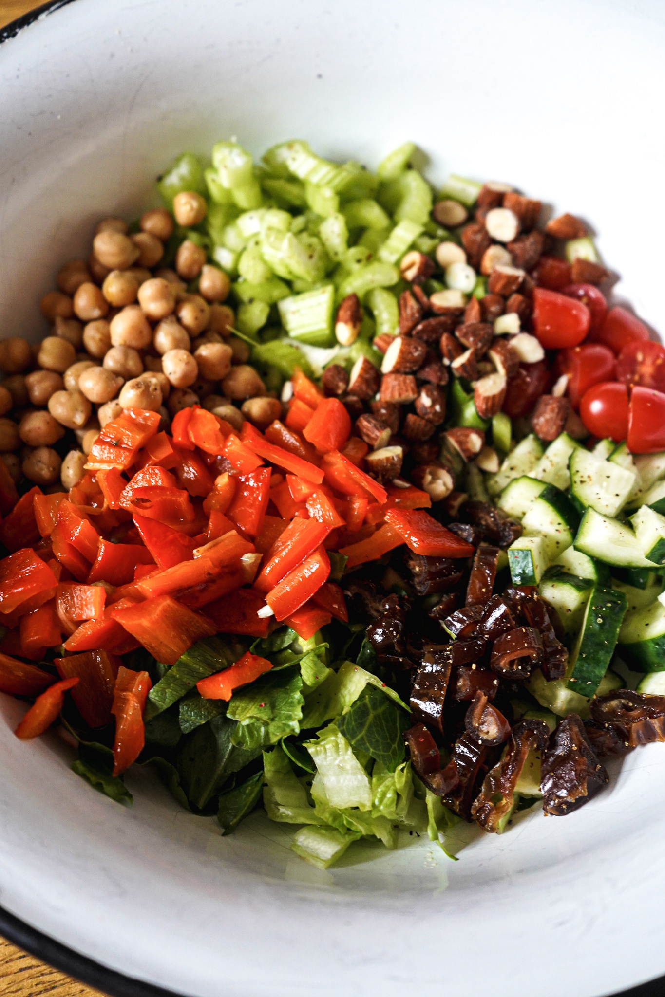Paprika waschen, abtrocknen, halbieren und entkernen. Die Hälften mit der Hautseite nach oben auf einem Backpapier in den Ofen schieben (mittlere Stufe, 180 Grad, ca. 7-10 Minuten). Alle folgenden Zutaten werden nach und nach in eine große Salatschüssel gegeben. Salat waschen, halbieren, Strunk entfernen, vierteln und in kleine Stücke schneiden. Gurke waschen, halbieren, vierteln und in kleine Stücke schneiden. Sellerie waschen, olle Enden oder Blätter abschneiden. Die Stangen längs halbieren und dann quer in kleine Stücke schneiden. Tomaten waschen und quer halbieren, nicht längs. Das Wasser der Kichererbsen abgießen und abtropfen lassen. Datteln quer in kleine Stücke schneiden. Nach der Paprika schauen: Sobald die Haut oben dunkel wird, ist sie fertig gegart. Frühlingszwiebeln waschen, säubern, längs halbieren und in kleine Ringe schneiden. Avocado häuten, halbieren, vierteln und quer in kleine Würfel schneiden.