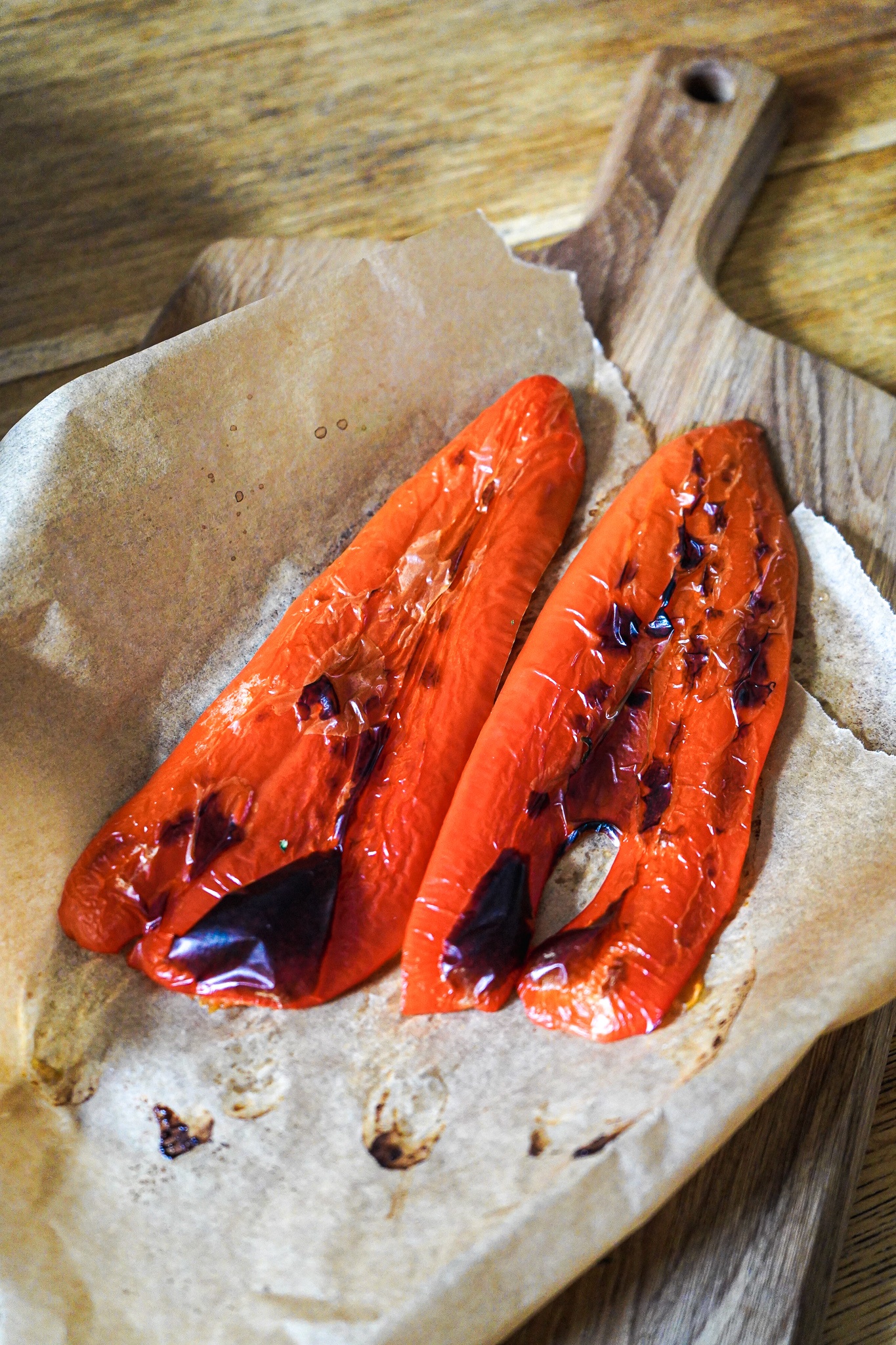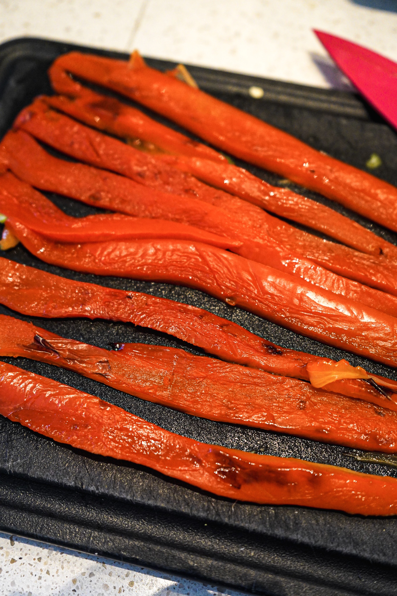 Die Paprika aus dem Ofen holen und kurz abkühlen lassen. Mit einem Messer die Haut abziehen, ähnlich als würde man einen Fisch filetieren. Die Haut entsorgen. Die Paprikafilets, so nenne ich sie jetzt einfach mal, in Längsstreifen und dann kleine Stücke schneiden. Zu dem anderen Gemüse in der Schüssel geben.