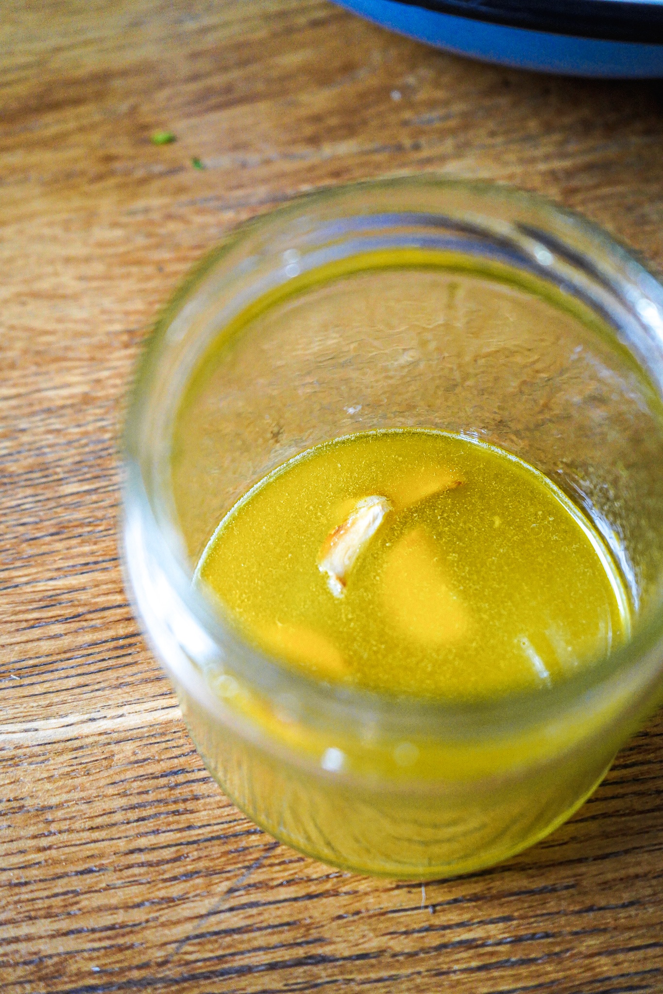Für das Dressing 3 EL Weißweinessig in ein Marmeladenglas geben. 1 EL Wasser, 1 EL Agavensirup, 3 EL Olivenöl hinzufügen, ein paar Flocken Meersalz und fünf Knoblauchchips hinzugeben. Deckel verschließen und kräftig schütteln. Kurz ziehen lassen.