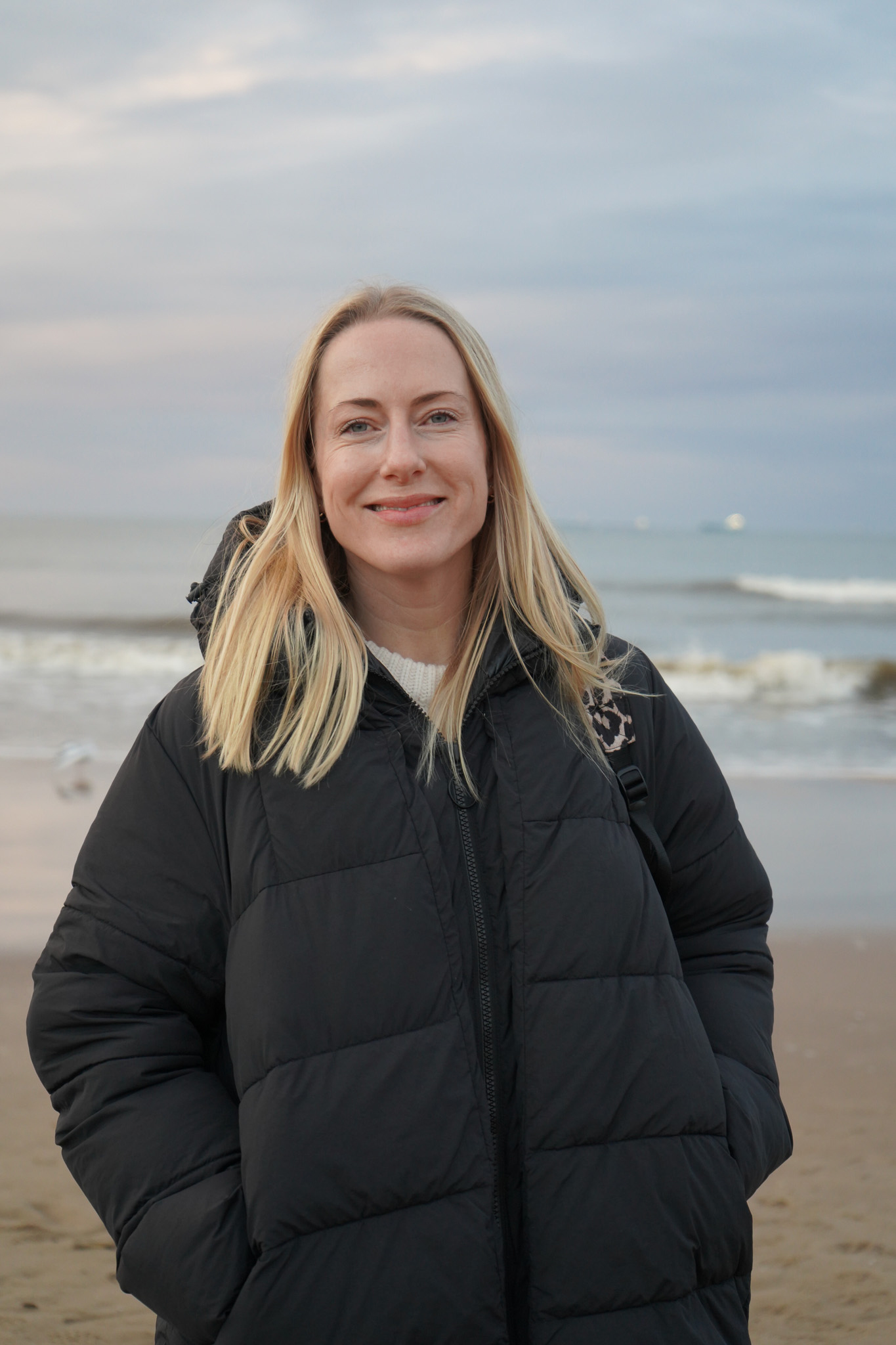 An meinem Grinsen sieht man: Am Meer bin ich glücklich, selbst im Winter. Der Blick in die Weite, der Rhythmus der Wellen, der helle Sand unter den Füßen und besonders das silbrige Licht der Ostsee – hier kann ich durchatmen und merke, dass alles, was sonst so in meinem Leben passiert nicht so wild bzw. machbar ist.