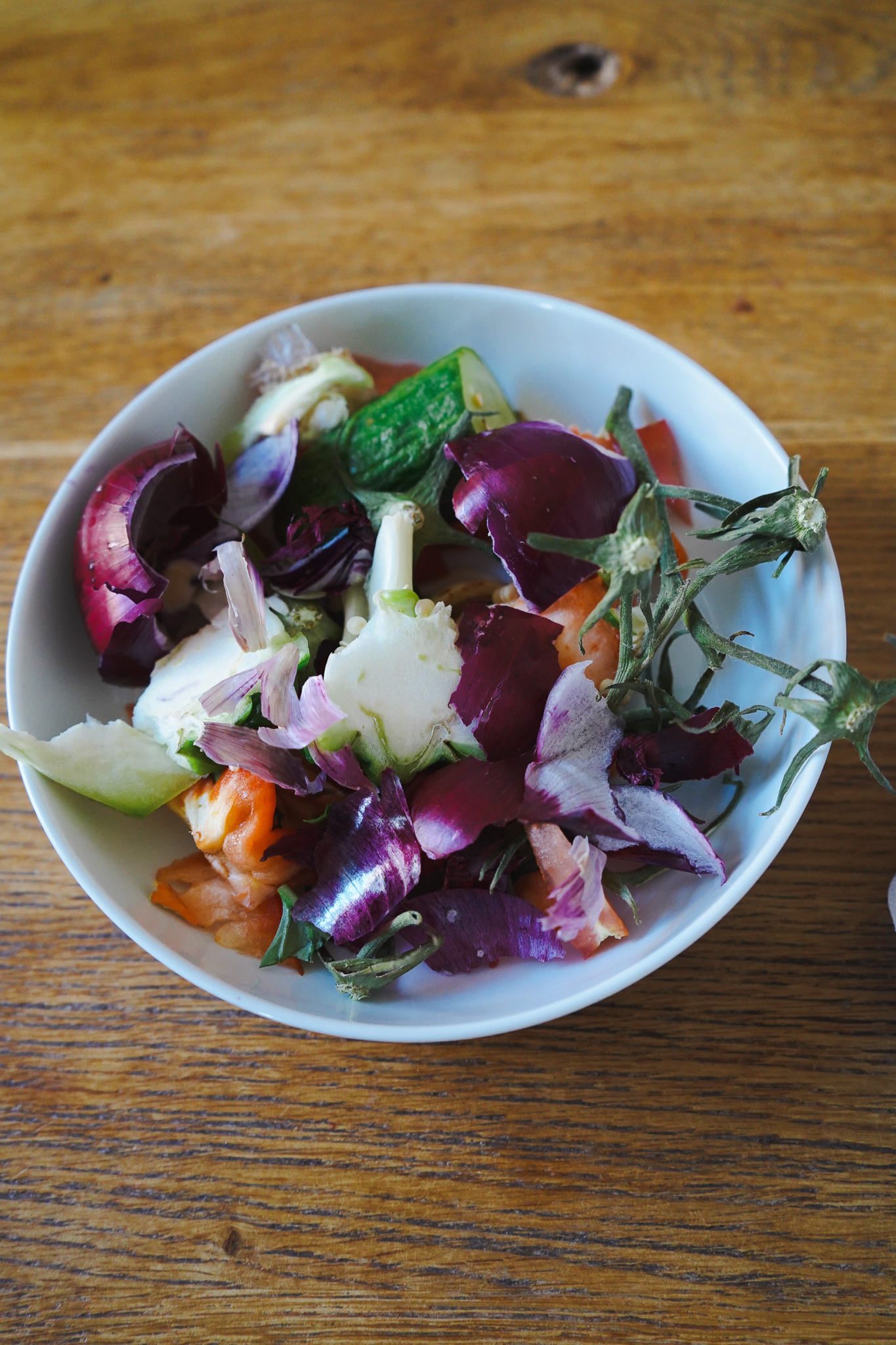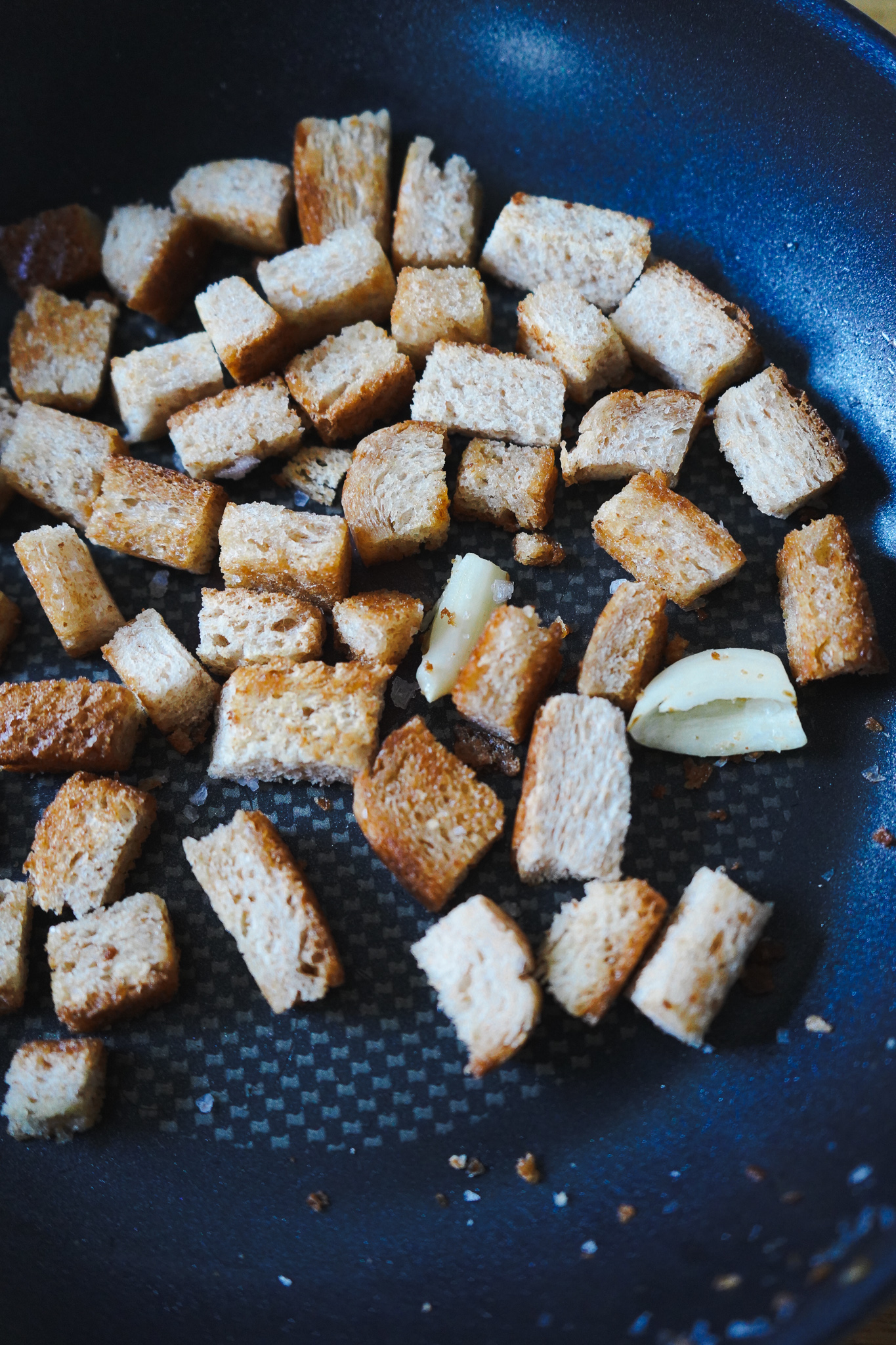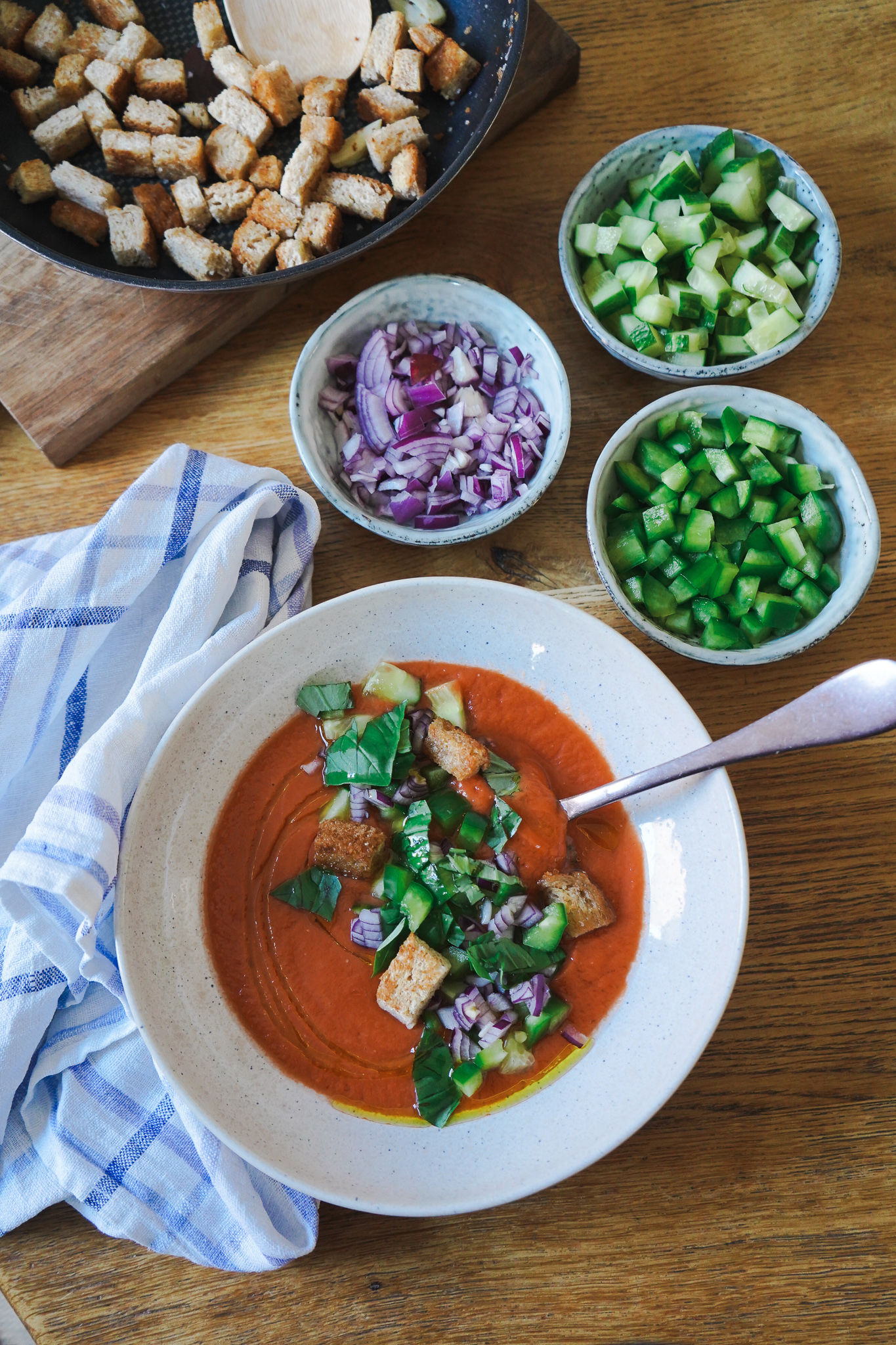 Gurke und grüne Paprika waschen. Paprika entkernen. Rote Zwiebel häuten. Alles in feine Würfel schneiden. In einer Pfanne 2 EL Rapsöl erhitzen. Die Brotrinde in Bröckchen schneiden und in der Pfanne anrösten. Mit Salz und Pfeffer würzen und zum Schluss für 2 Minuten eine geschälte und zerdrückte Knoblauchzehe mit in die Pfanne geben. Fertig sind die homemade Croutons, die garantiert besser schmecken, als die Fertig-Dinger aus der Tüte!