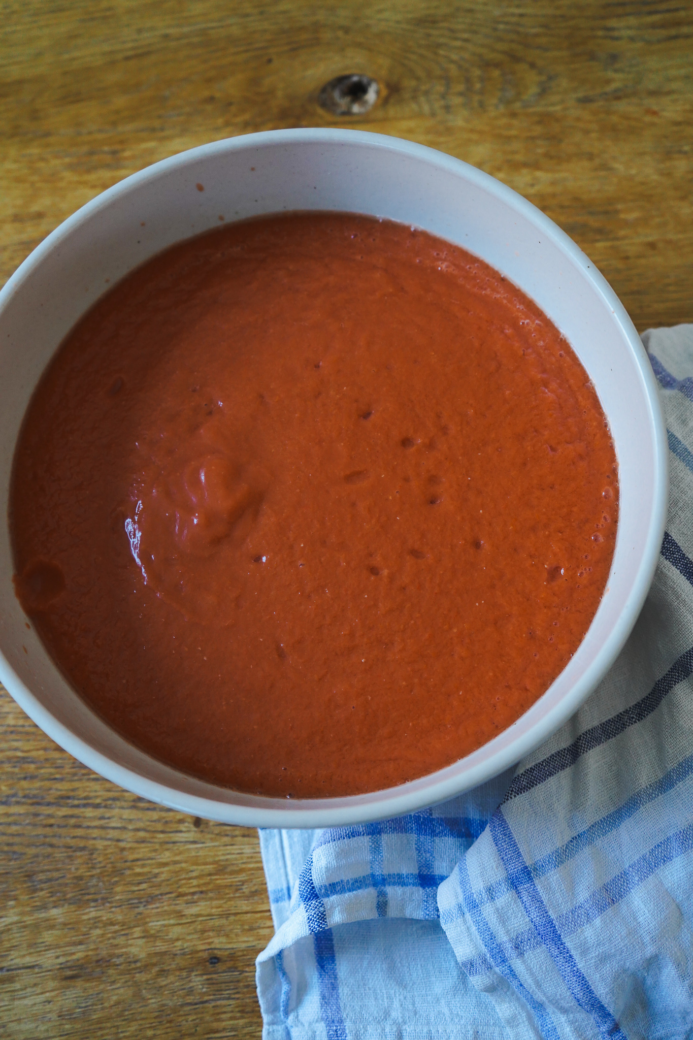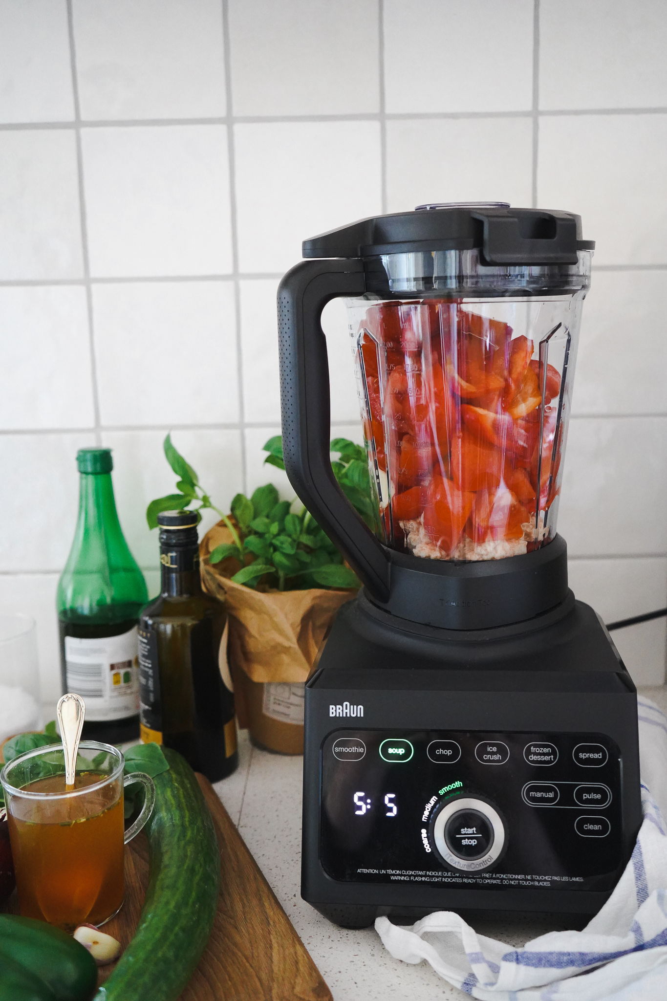 Eine Knoblauchzehe schälen. Zusammen mit Tomaten, passierten Tomaten, roter Paprika und Brühe in den Blender geben. Salz, Pfeffer, Essig, Agavendicksaft und Öl hinzufügen. iTexture Control Funktion auf Suppe und „fein“ stellen. Ab geht die Gazpacho! Nach 1 Minute ist alles fertig.