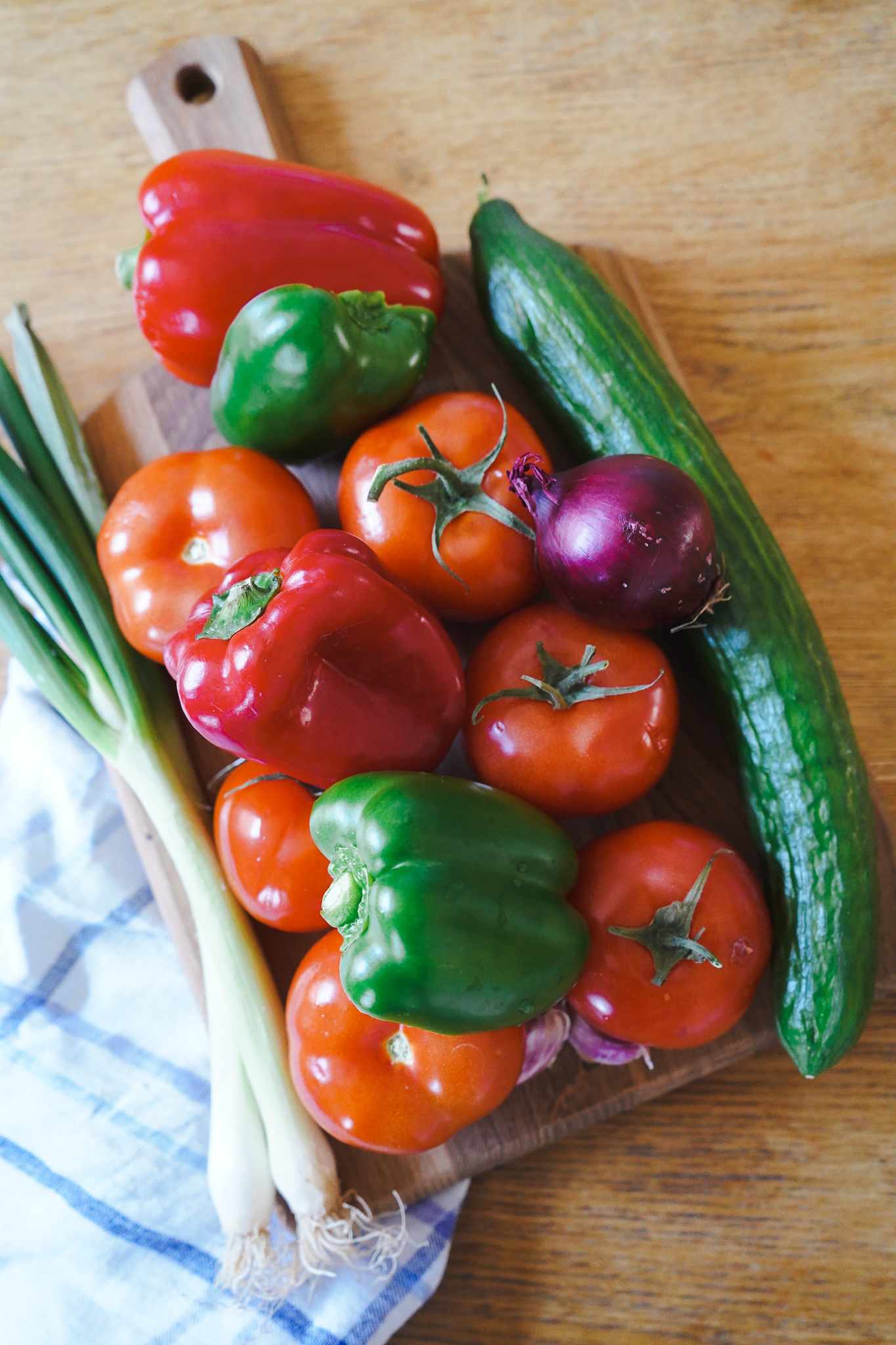 Die Rinde des Toastbrots abschneiden und beiseite stellen. Nicht wegschmeißen! Die Brotscheiben in Wasser einweichen. Tomaten waschen, den Strunk entfernen und in Viertel schneiden. Das muss nicht perfekt sein, ich häute die Tomaten noch nicht mal – die Solinger Klingen des Mixers bekommen wirklich alles klein. Rote Paprika waschen, entkernen und grob zerkleinern.