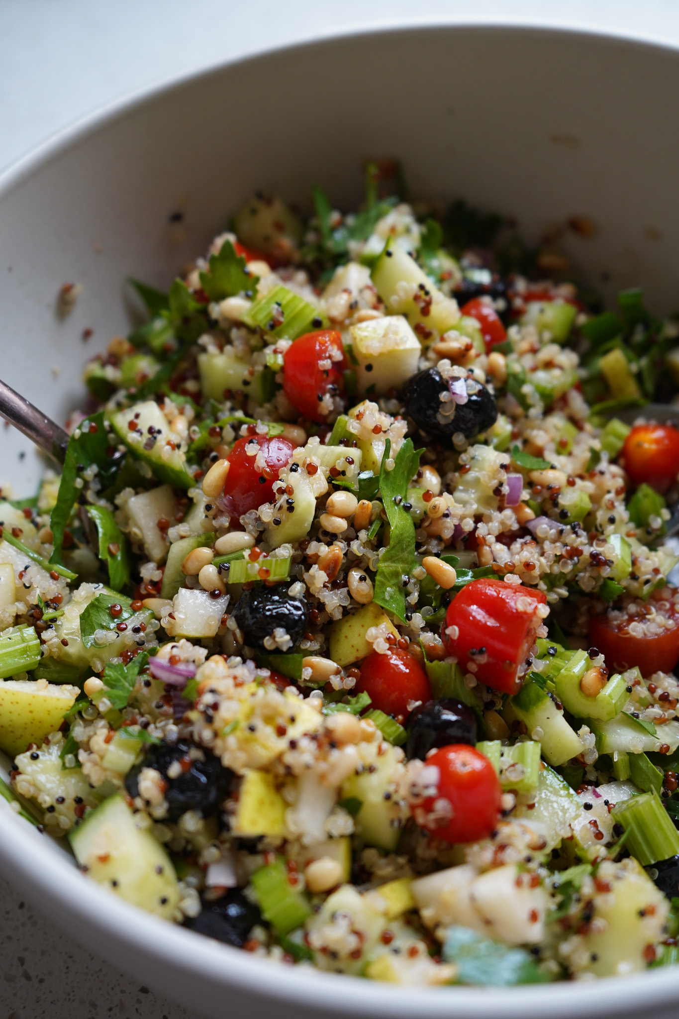 Quinoa (vor)kochen. Obst, Gemüse und Kräuter waschen und klein schneiden. So wie ihr das mögt! Ich halte kleine Stücke für besser. Pinienkerne vorsichtig in einer beschichteten Pfanne anrösten. Alle Zutaten mischen. Mit Essig, Salz, Pfeffer und Öl abschmecken. Wer mag: Oliven dazu.