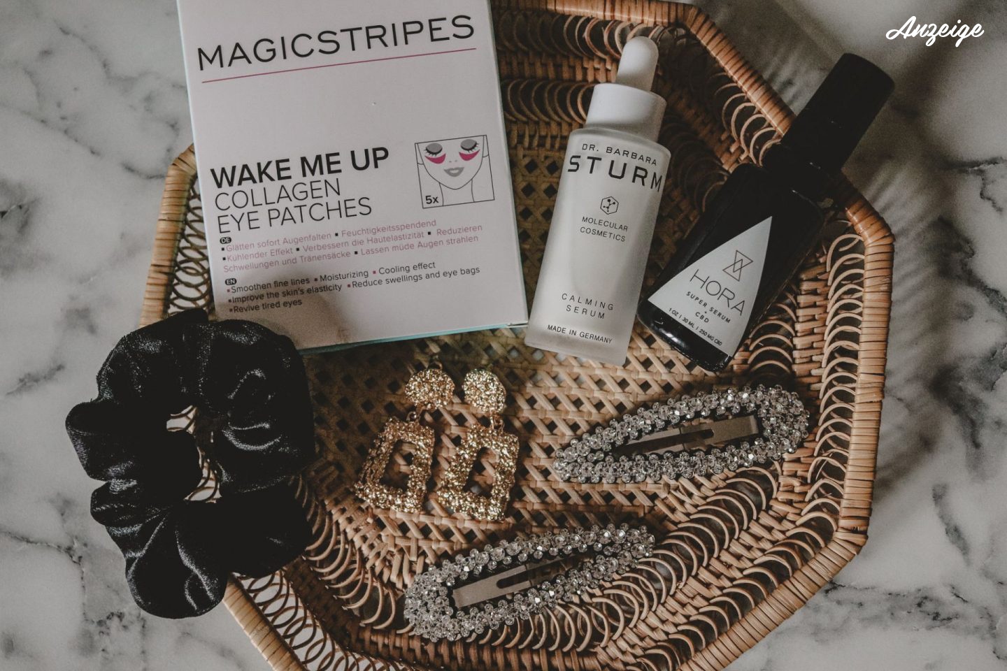 Collagen Eye Patches: Magicstripes, CDB Serum: Hora Super Serum via The Chillery, Calming Serum: Dr. Barbara Sturm, Scrunchie: H&M, Haarspangen: H&M, Ohrringe: H&M