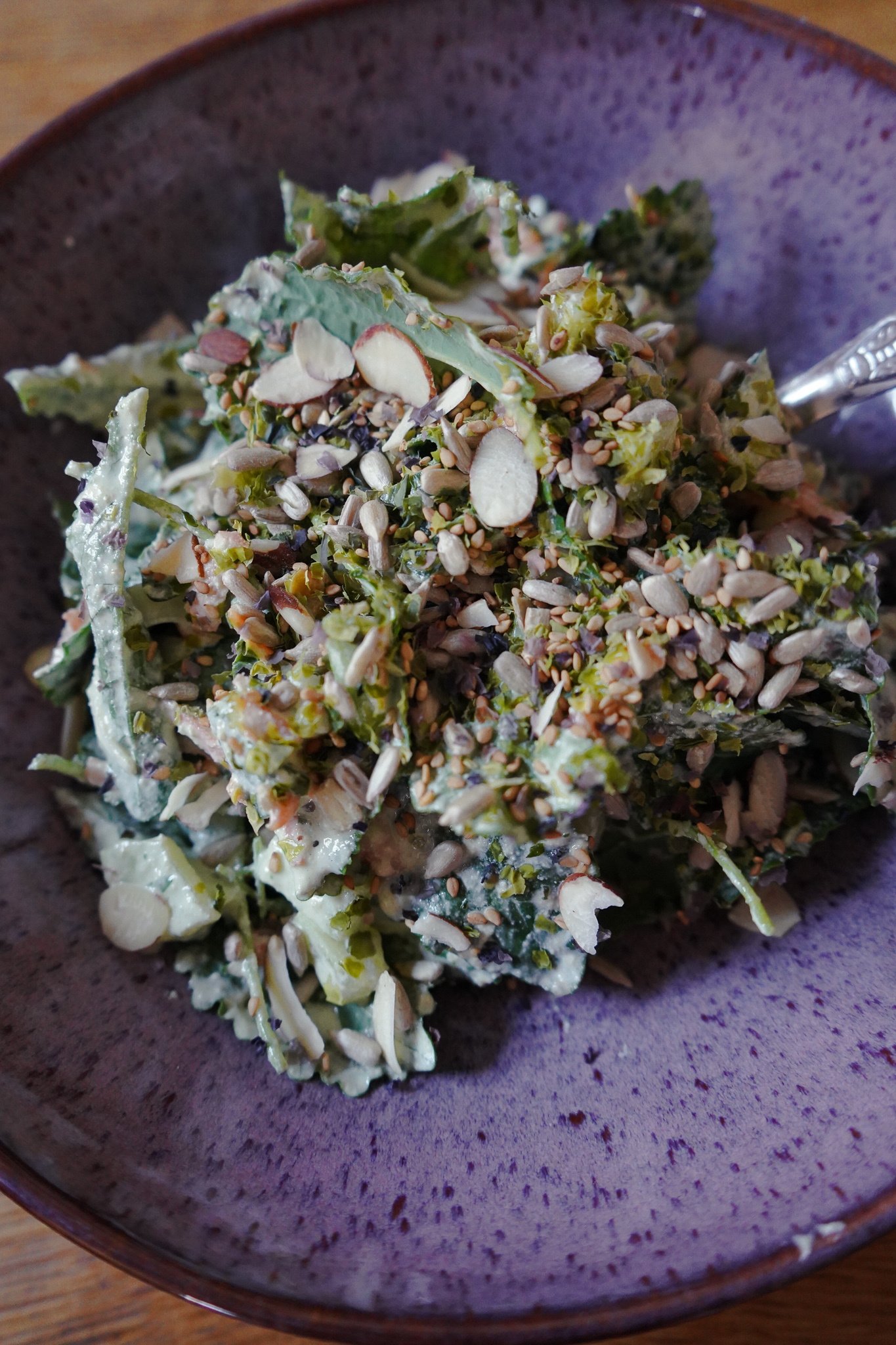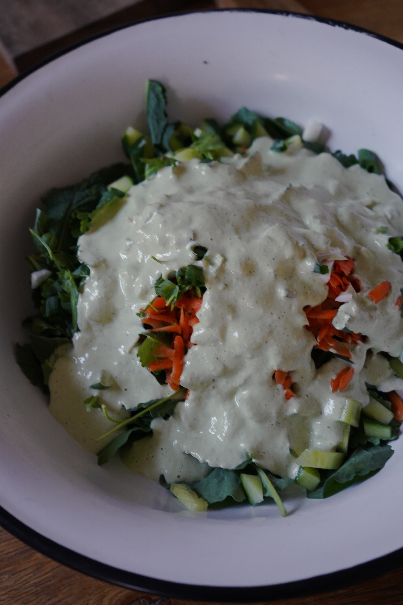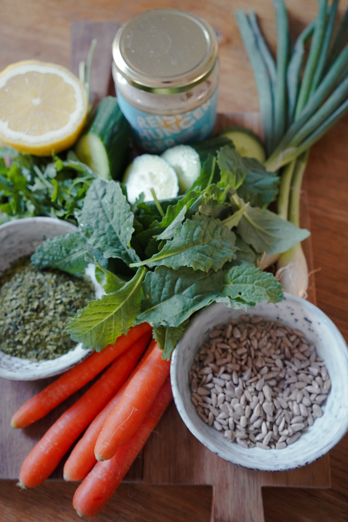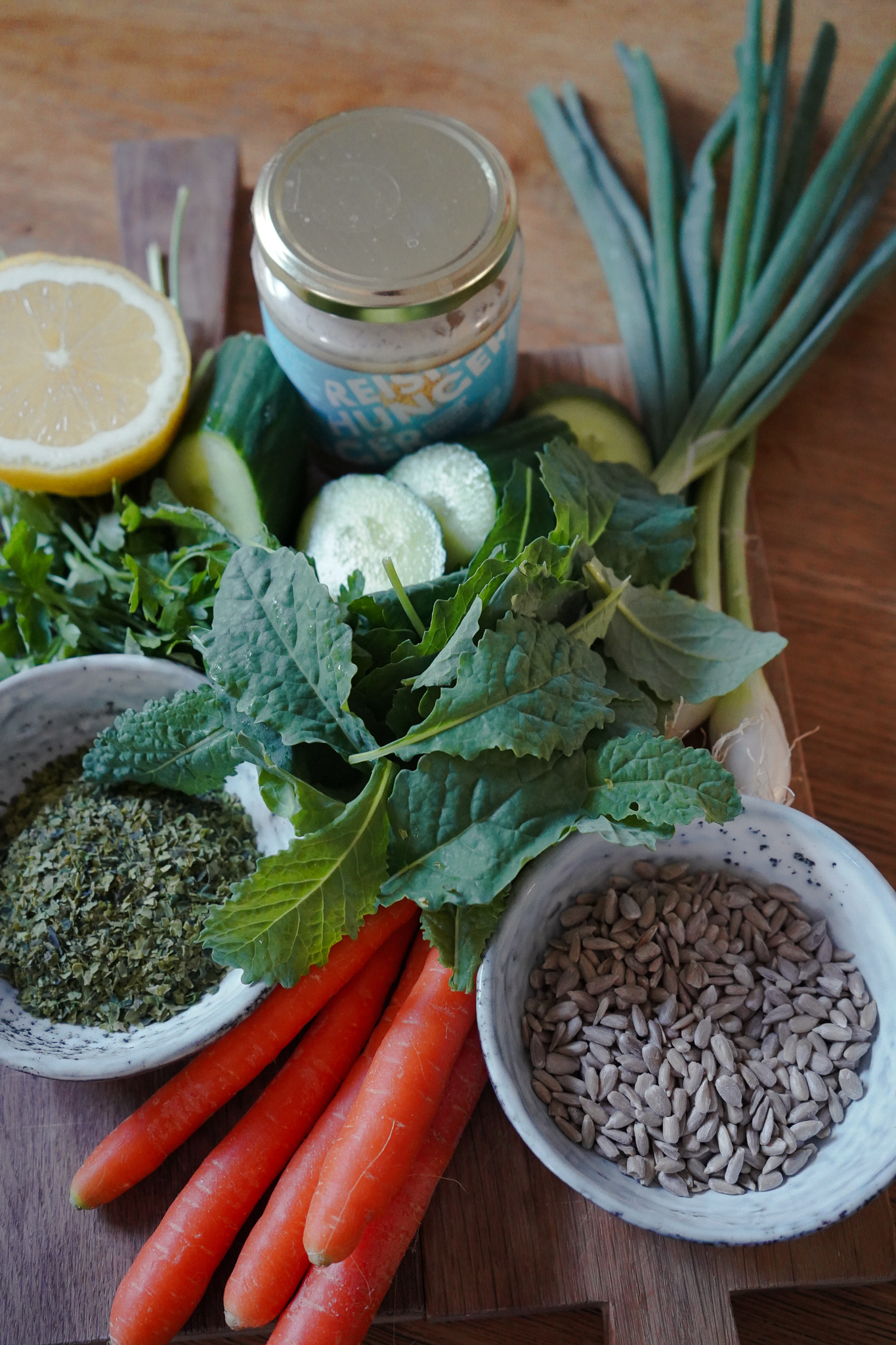 Das Rezept für den „I am Pure“-Salat stammt aus dem Gratitude Café in Los Angeles. Die Zutaten sind in deutschen Supermärkten leider noch rar, deshalb musste mir Flori den Kale (junger Grünkohl) aus dem Großhandel mitbringen. (TK-Ware geht gar nicht!) Ihr könnt aber auch Rucola und Babyspinat mischen. Die Hauptsache ist: Es kommt viel Grünzeug auf den Teller. Dazu gesellen sich knackige Gurken, Möhren und ein cremiges Nuss-Kern-Kräuter-Dressing. Es ist gewissermaßen ein veganer Caesar Salad ohne Hühnchen, Parmesan und Croûtons. Das Gericht macht aber ebenfalls satt und glücklich, versprochen.