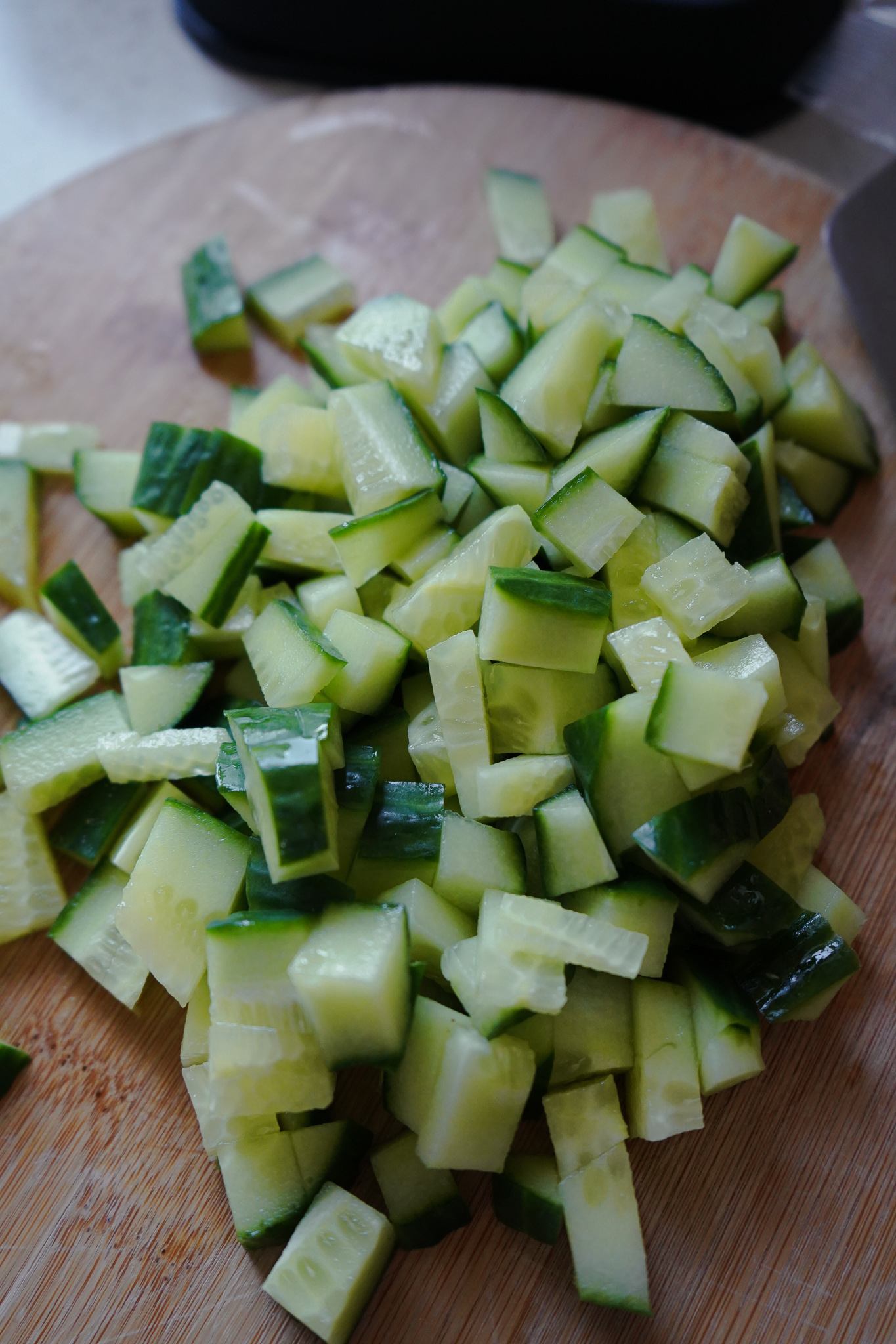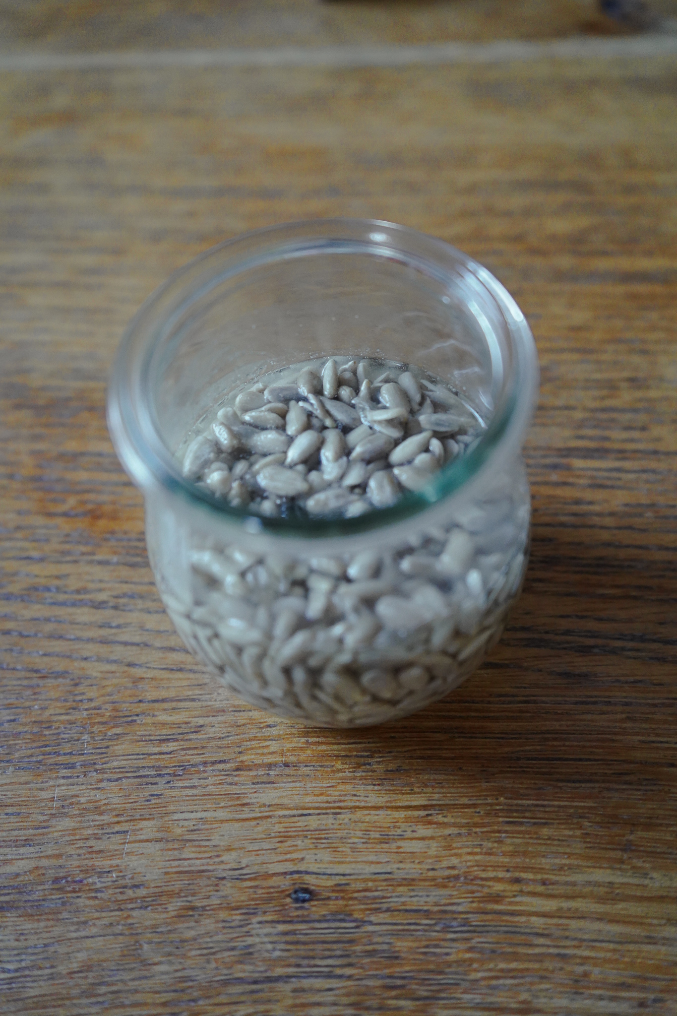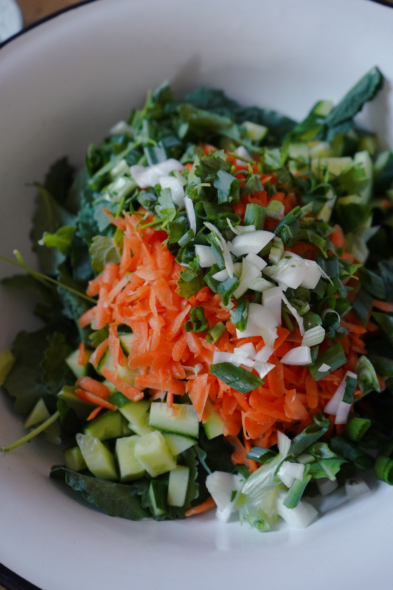 3 von 5 EL Sonnenblumenkernen in Wasser einweichen. Gurken waschen, Möhren schälen. Gurke in kleine Würfel schneiden. Möhre fein reiben oder raspeln. Frühlingszwiebeln waschen und klein schneiden. Kräuter ebenfalls waschen und trocken tupfen. Kale und Salate lesen und in eine große Schüssel geben. Gurke, Möhre und Frühlingszwiebeln hinzugeben.