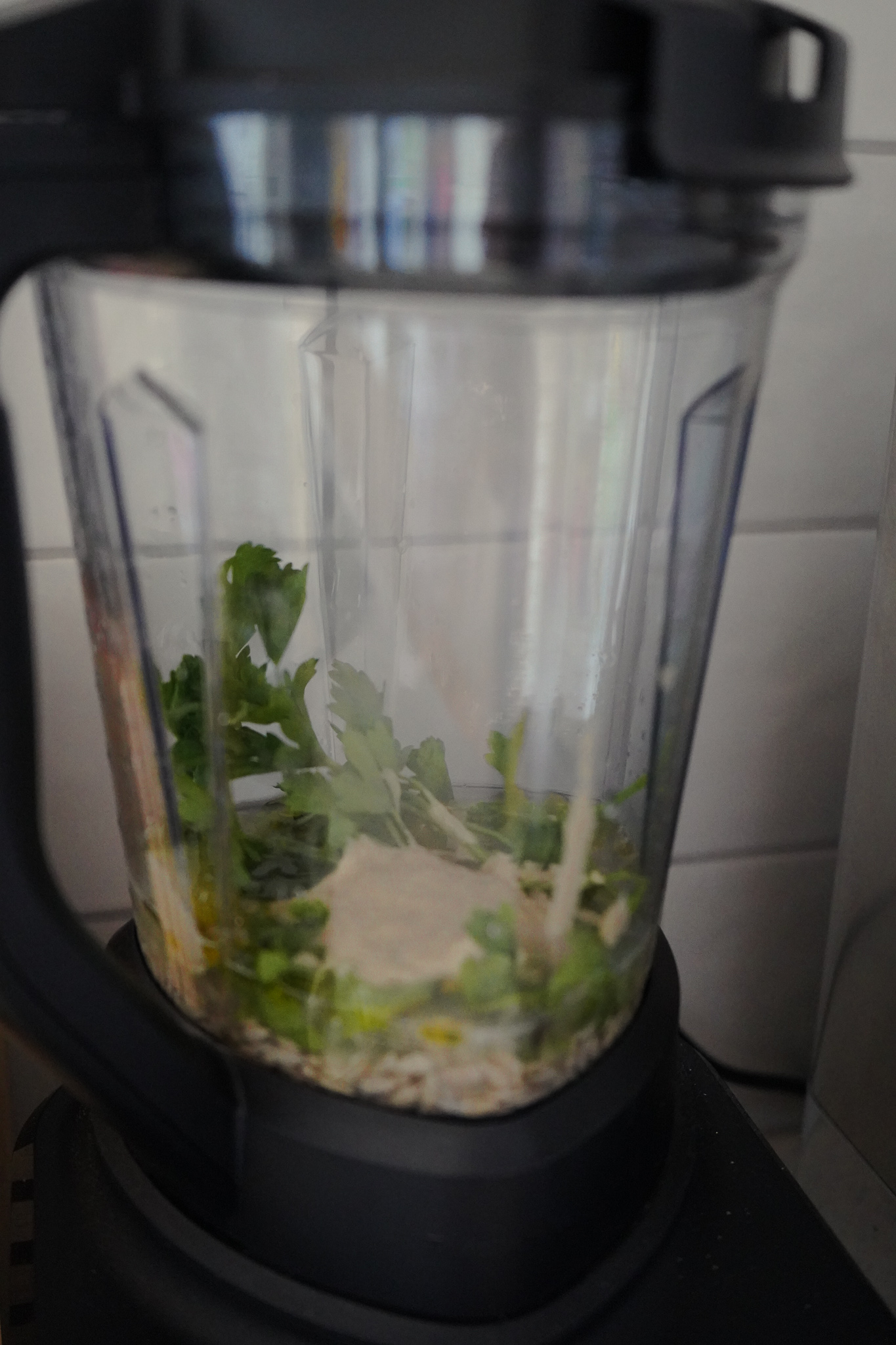 Eingeweichte Sonnenblumenkerne in einen Standmixer geben. Knoblauch, Tahini, Zitronensaft, Salz und Olivenöl dazugeben. Kräuterblättchen ggf. von den Stielen abzupfen und hinzugeben. Alles kurz mixen. Die Kräuter sollten noch erkennbar sein. Abschmecken. Sollte das Dressing am Rand kleben, ein wenig Wasser hinzugeben.