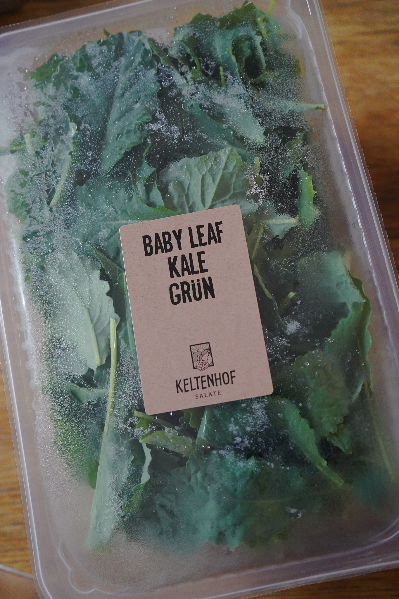 - 1 Packung Kale (Alternative: Rucola-Babyspinat-Mix oder gemischte Blattsalate)