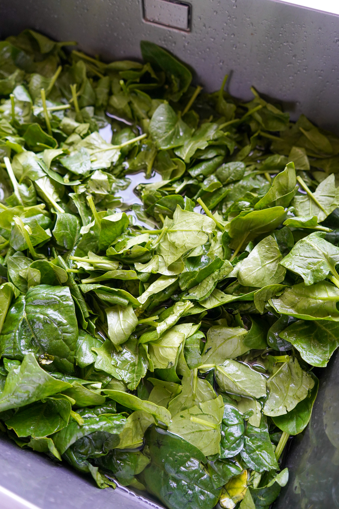 Spinat waschen und lesen. Große Stiele entfernen. Spinat in einem Sieb abtropfen lassen. Der Spinat muss nicht komplett trocken sein. Dann in einen großen Topf geben und bei mittlerer Hitze dämpfen, bis die Blätter zusammenfallen. Wieder in ein Sieb geben und die entstandene Flüssigkeit abtropfen lassen. Die Blätter mit einer Gabel vorsichtig auseinander teilen, damit alles gut ausdampfen und abtropfen kann. Der Spinat soll später auf dem Teller nicht schwimmen!