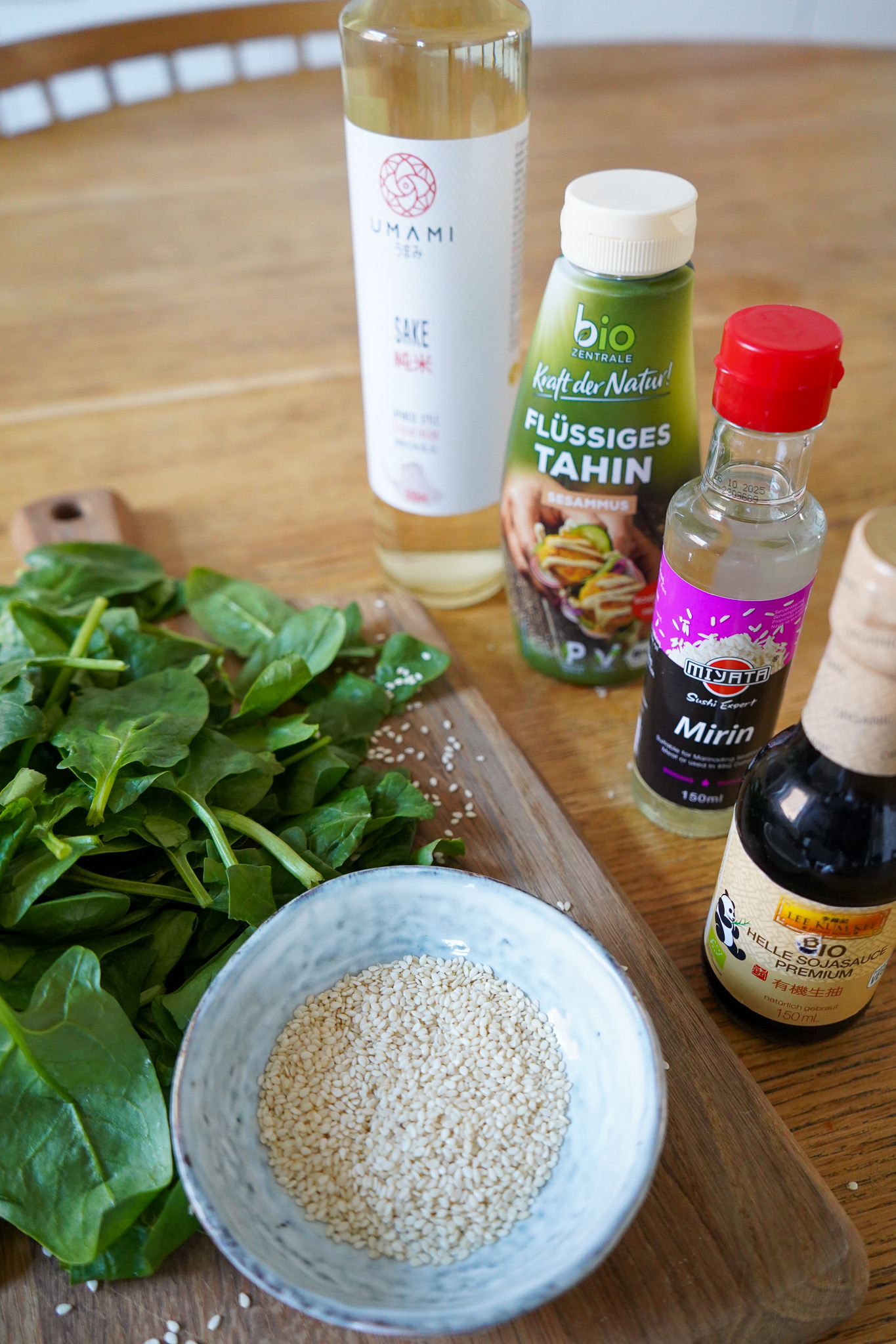 Für das Dressing 4 EL helle Sojasoße, 1 EL Mirin (süßer Reiswein), 1 EL Sake (trockener Reiswein) und 2 EL flüssiges Tahin miteinander verrühren. 1 EL geröstete Sesamsaat unterrühren. Abschmecken. Da der Spinat ohne Salz zubereitet wurde, darf das Dressing salzig sein. Zu salzig? Mehr Tahin. In manchen Rezepten findet man noch die Angabe von Zucker. Ich finde, den braucht es hier aber gar nicht. Sollte euch das Dressing nicht süß genug sein, empfehle ich Reissirup oder Honig.