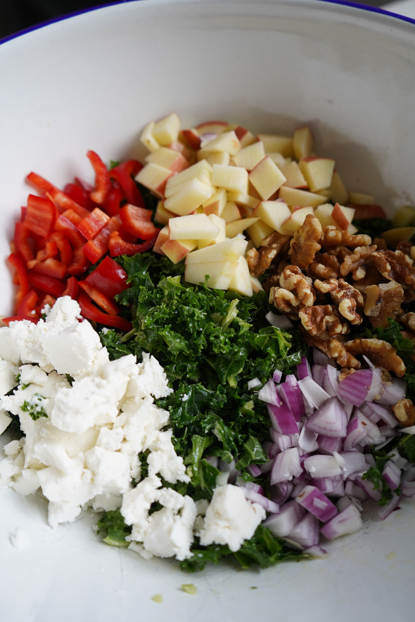 Grünkohl waschen, lesen und trocken schleudern. Ehrlicherweise wasche ich meinen Salat nie. Mit Salz, Zitronensaft und Olivenöl würzen und mit den Händen kneten. Tomaten, Zwiebeln, Paprika und Äpfel in kleine Stücke schneiden. Mit dem Grünkohl vermengen. Mit Salz, Pfeffer und ggf. etwas Balsam Apfelessig abschmecken. Feta und Walnüsse über den Salat zerkrümeln. Vorsichtig alle Zutaten vermengen und servieren. Wenn ihr mehr Süße braucht, könnt ihr noch Cranberries hinzufügen.