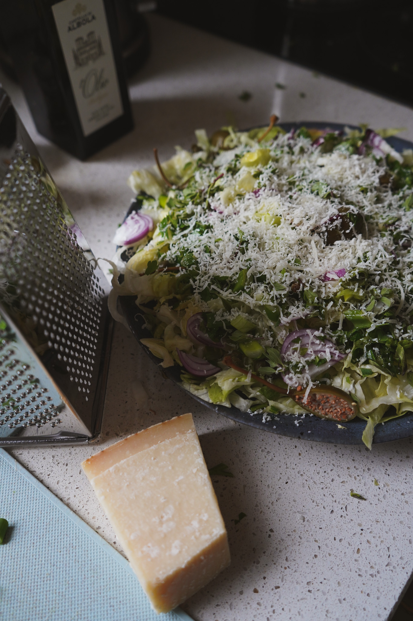 Zwiebelringe und Kapern auf dem Eisbergsalat arrangieren. Parmesan fein reiben und über den Salat geben. Oreganoblättchen von den Stielen zupfen. Petersilie ggf. waschen, trocken tupfen, ebenfalls von den Stielen zupfen und die Blättchen mit einem Wiegemesser oder Schere klein schneiden. Kräuter über den Salat streuen. Meersalz, Essig (gerne mehr, wenn ihr euren Salat, so wie, ich sauer mögt) und bestes Olivenöl darüber geben. Kurz ziehen lassen, dann pfeffern und servieren.