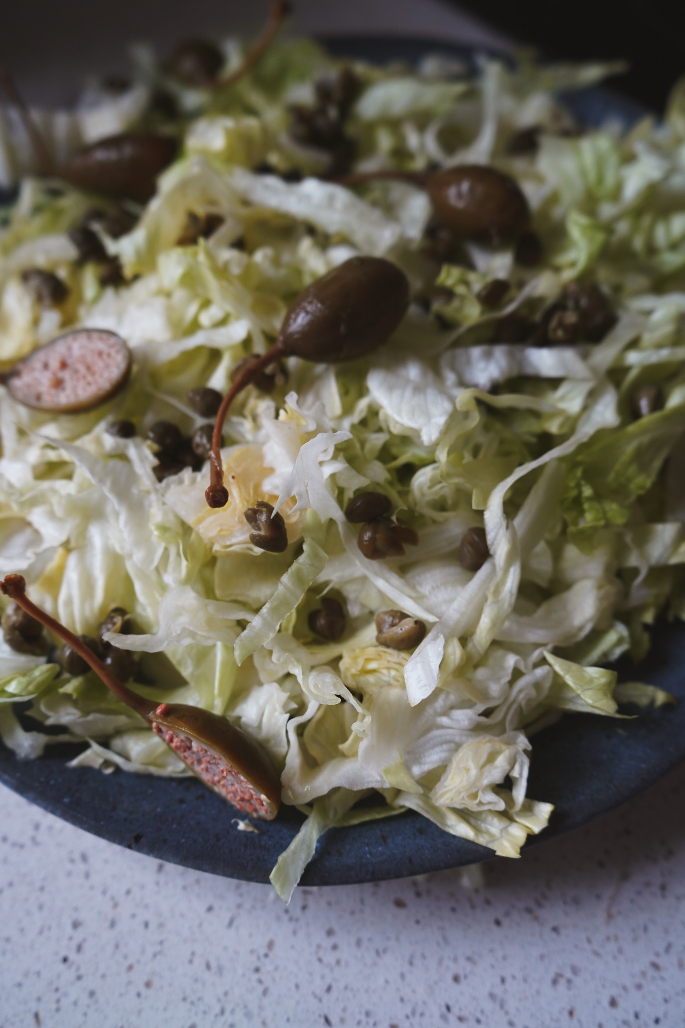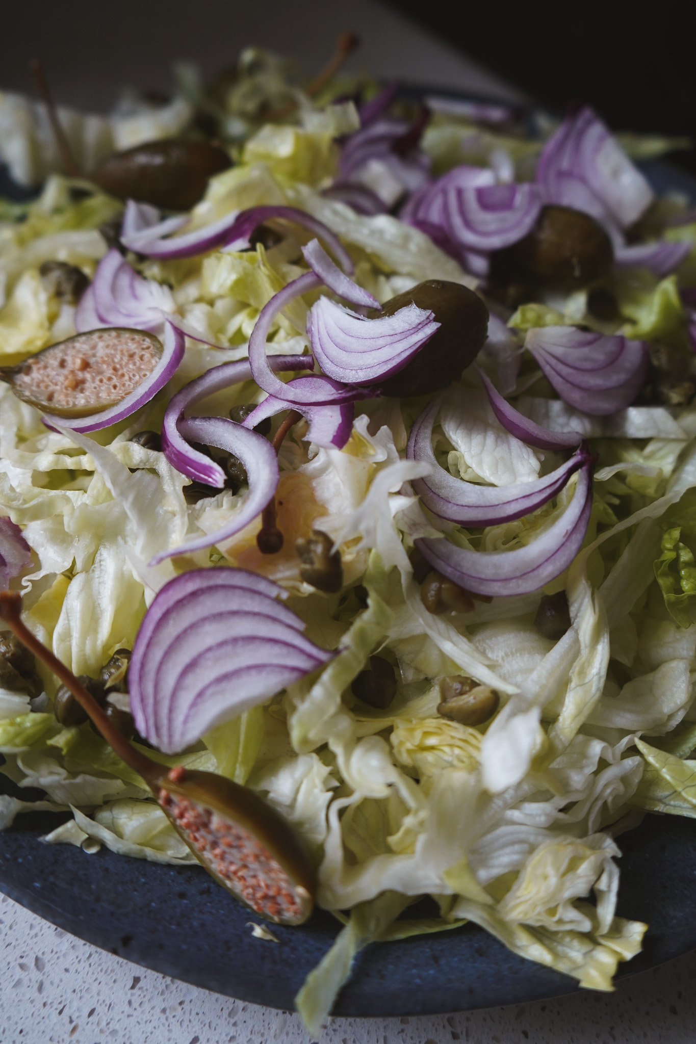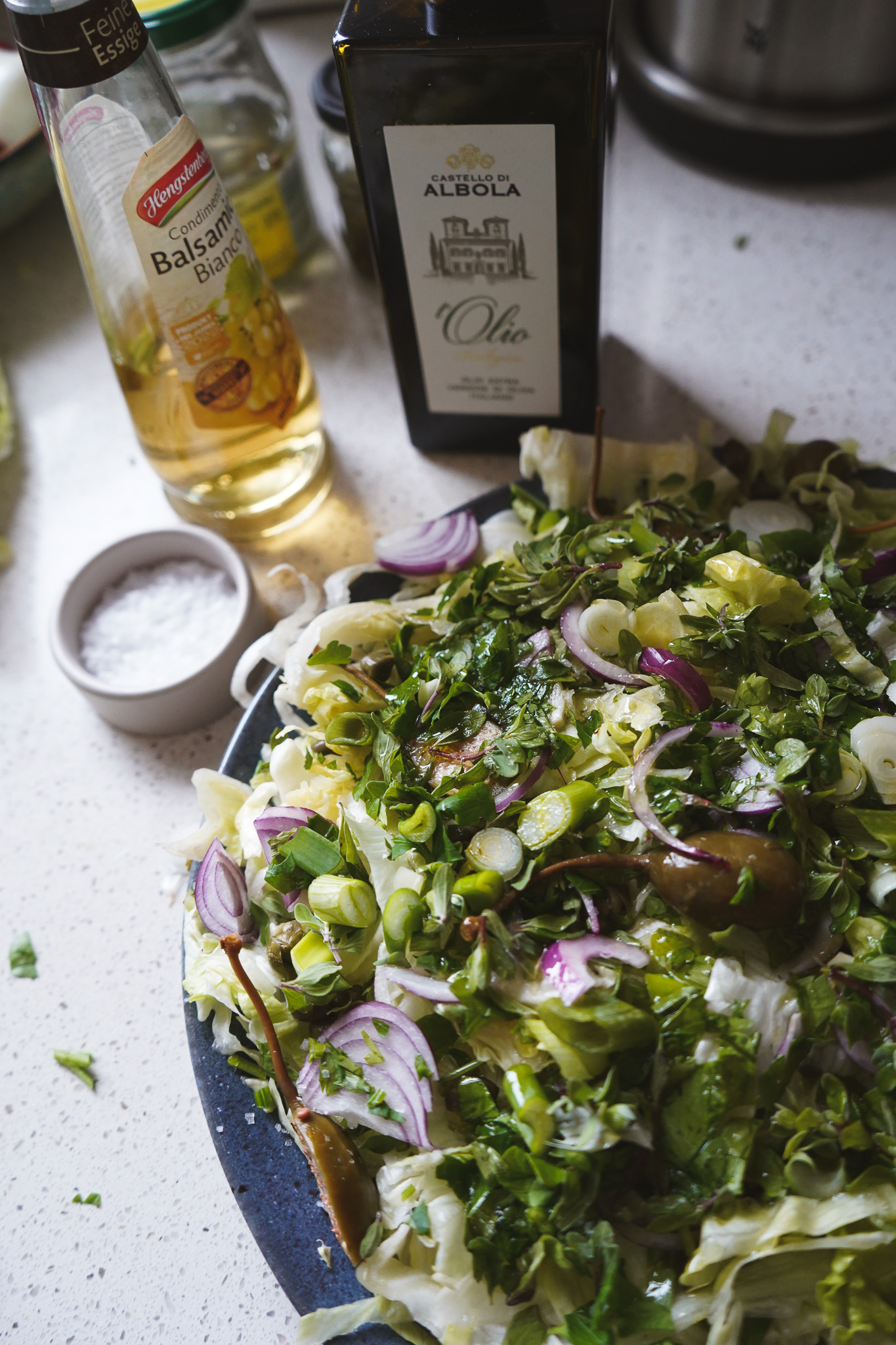Eisbergsalat halbieren, den Rest später verwerten. Mit einem großen Messer den Salat in schmale Streifen schneiden. Diese auf einem großen flachen Teller ausbreiten. Rote Zwiebel häuten und ganz oder halbiert in dünne Scheiben schneiden. Frühlingszwiebel in Ringe schneiden. Kapern abtropfen lassen. Die kleinen Kapern mit einem Stößel andrücken, damit sie nicht wegkullern. Drei Kapernäpfel halbieren.