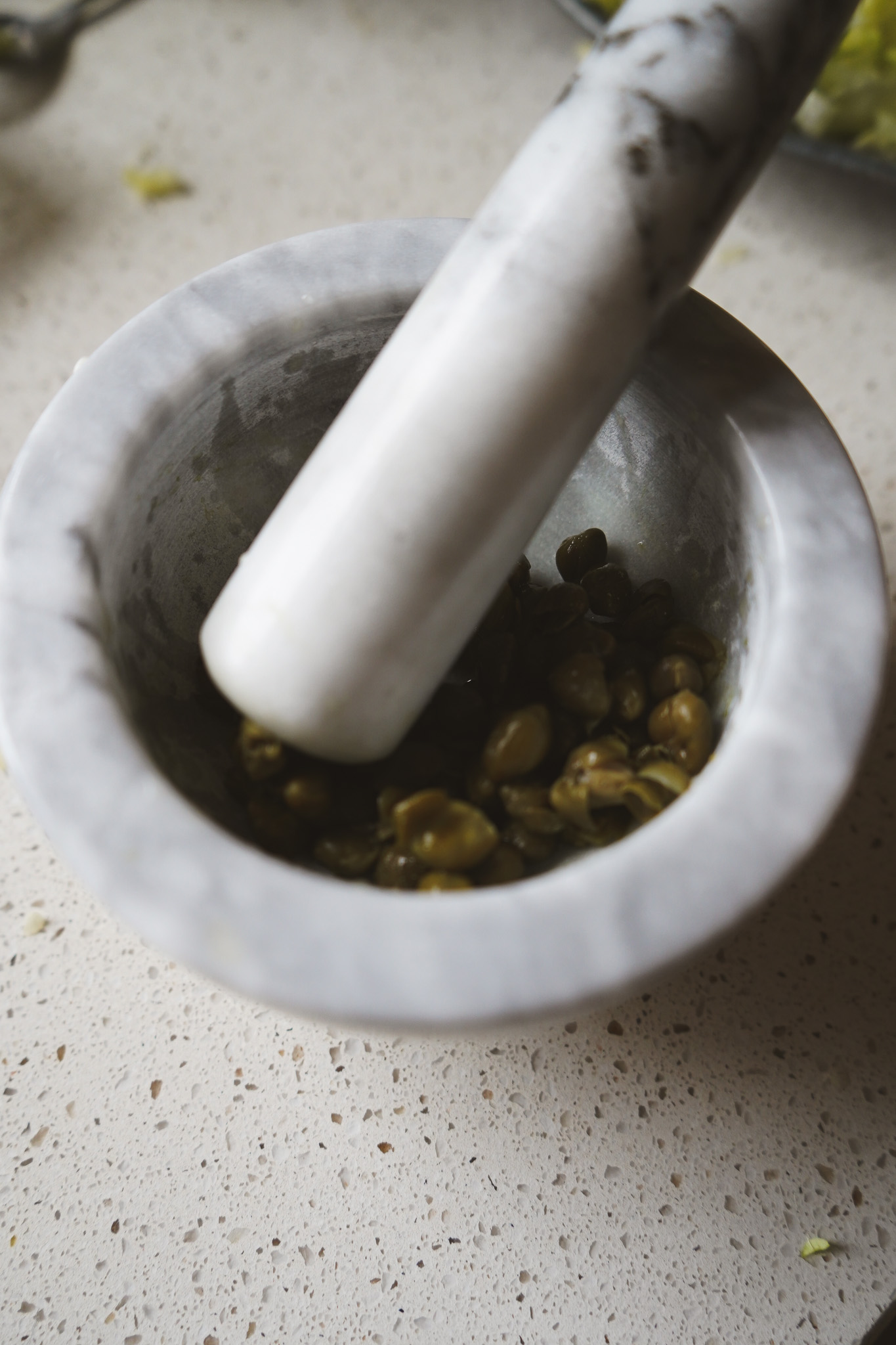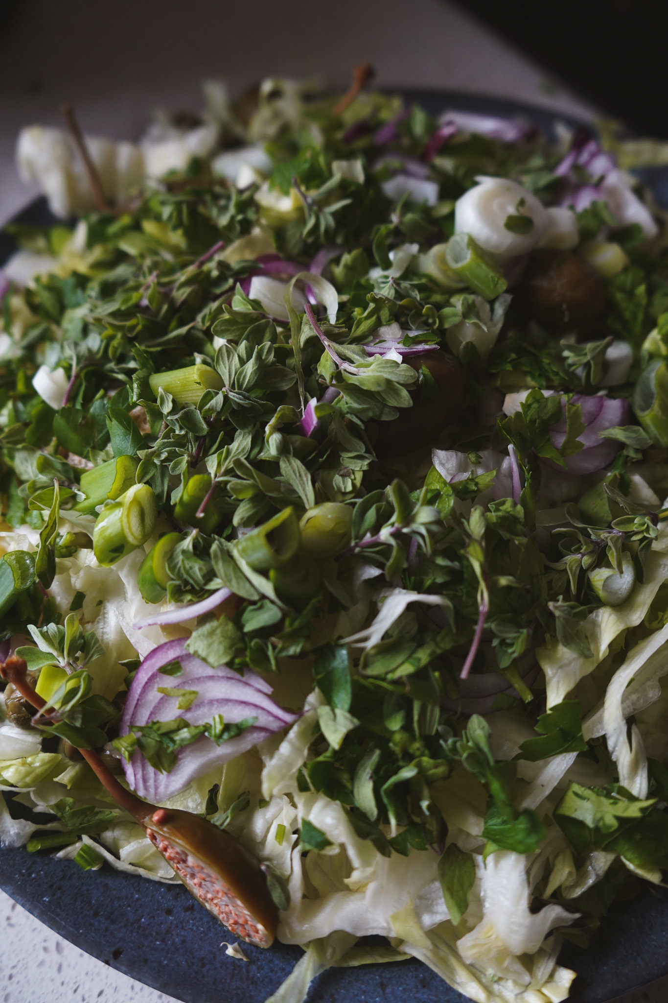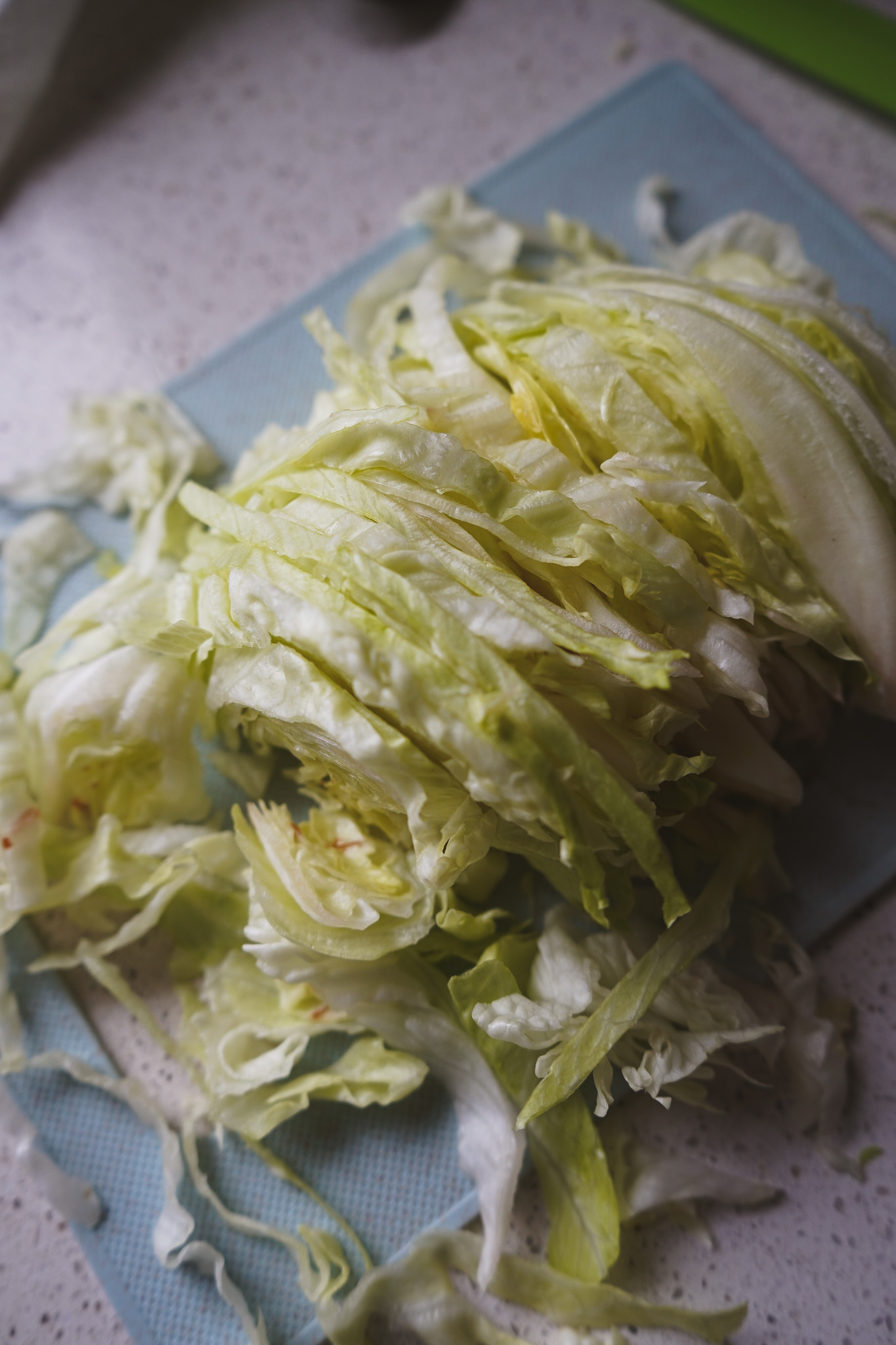 Eisbergsalat halbieren, den Rest später verwerten. Mit einem großen Messer den Salat in schmale Streifen schneiden. Diese auf einem großen flachen Teller ausbreiten. Rote Zwiebel häuten und ganz oder halbiert in dünne Scheiben schneiden. Frühlingszwiebel in Ringe schneiden. Kapern abtropfen lassen. Die kleinen Kapern mit einem Stößel andrücken, damit sie nicht wegkullern. Drei Kapernäpfel halbieren.