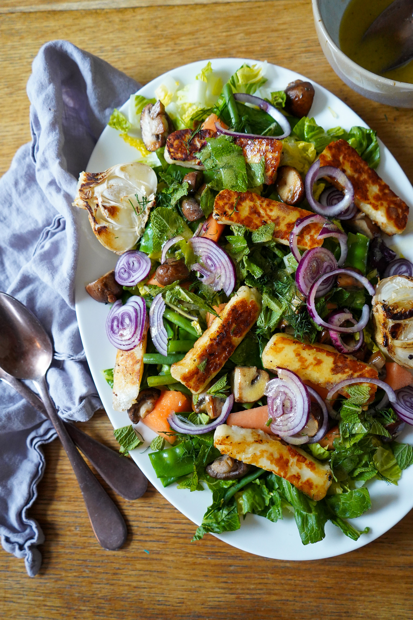 Schöner Salat mit gegrilltem Honig-Halloumi, grünen Bohnen und Melone