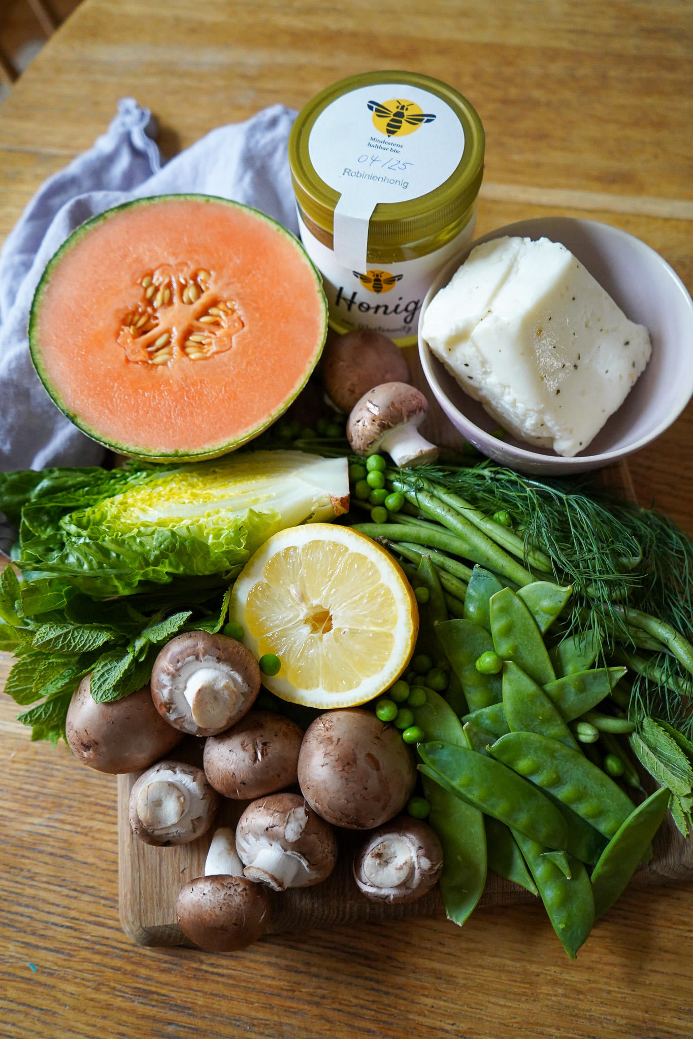 Grüne Bohnen und Zuckerschoten blanchieren, also in Salzwasser bissfest garen und dann mit kaltem Wasser abschrecken. Erbsen TK auftauen lassen. Römersalat halbieren, viertel und in Stückchen schneiden. Melone halbieren, die eine Seite beiseitelegen. Die anderen entkernen, halbieren, vierteln und in Spalten schneiden. Schale entfernen und das Fruchtfleisch in mittelgroße Würfel schneiden. Das wird kein Wurstsalat, was bedeutet: Später soll ein schöner Kontrast zwischen langen Bohnen, kleinen Erbsen und Melonenwürfeln entstehen. Rote Zwiebel in dünne Ringe schneiden. Kräuter von den Stielen zupfen und klein schneiden oder rupfen.