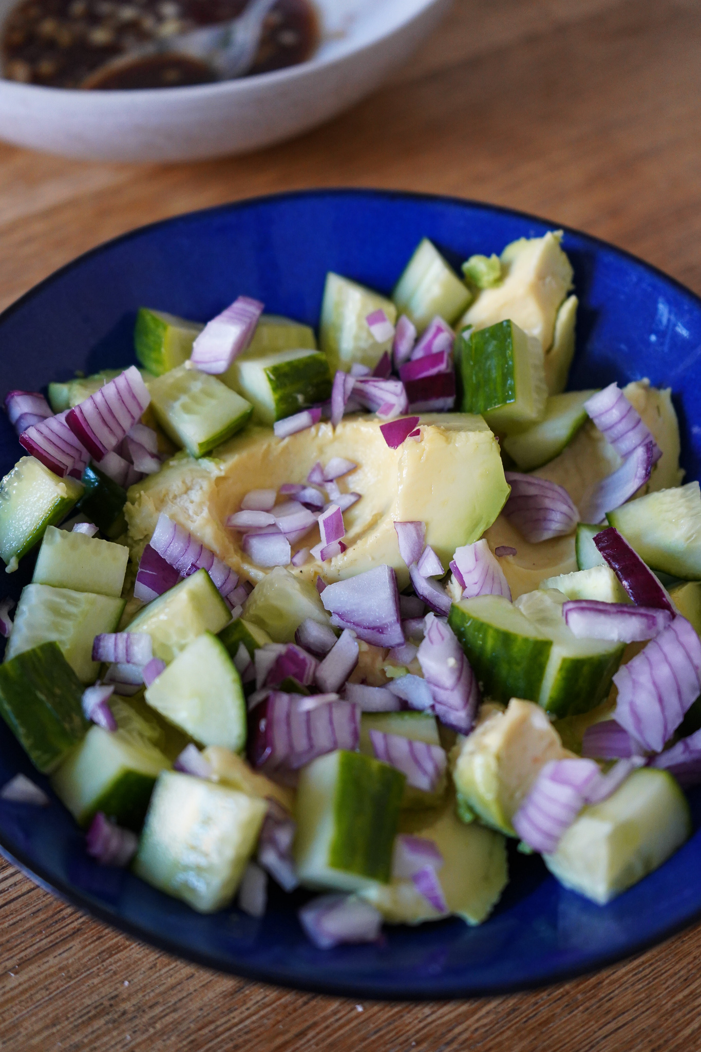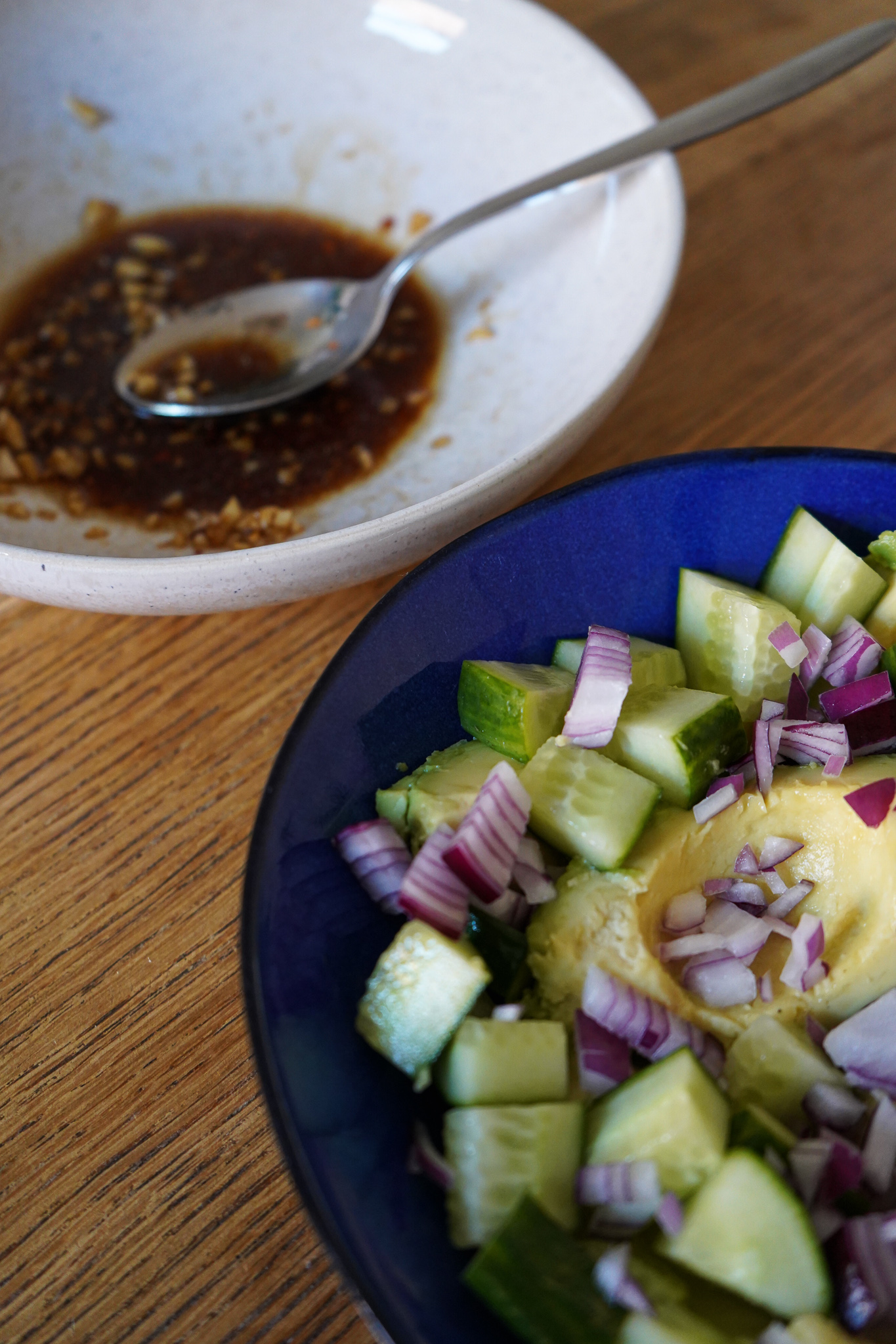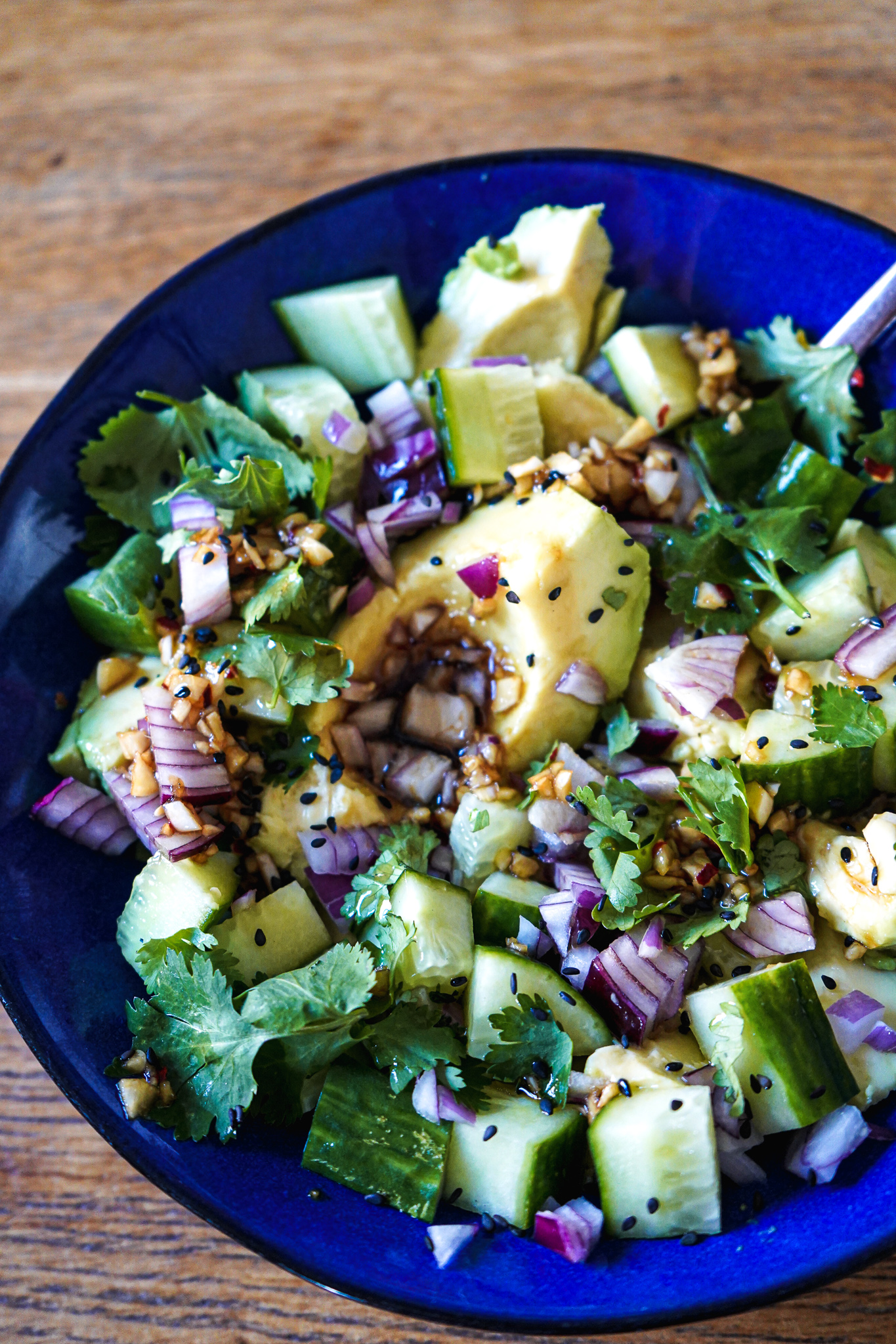 Die einzige Herausforderung, die es gibt: reife und schöne Avocados zu finden. Meine waren zwar reif, aber auch ein wenig matschig. Aber geschmeckt haben sie trotzdem, denn das Dressing ist einfach die Wucht. Vor allem dann, wenn ihr geröstetes Sesamöl und ein bisschen Chili hinzugebt.