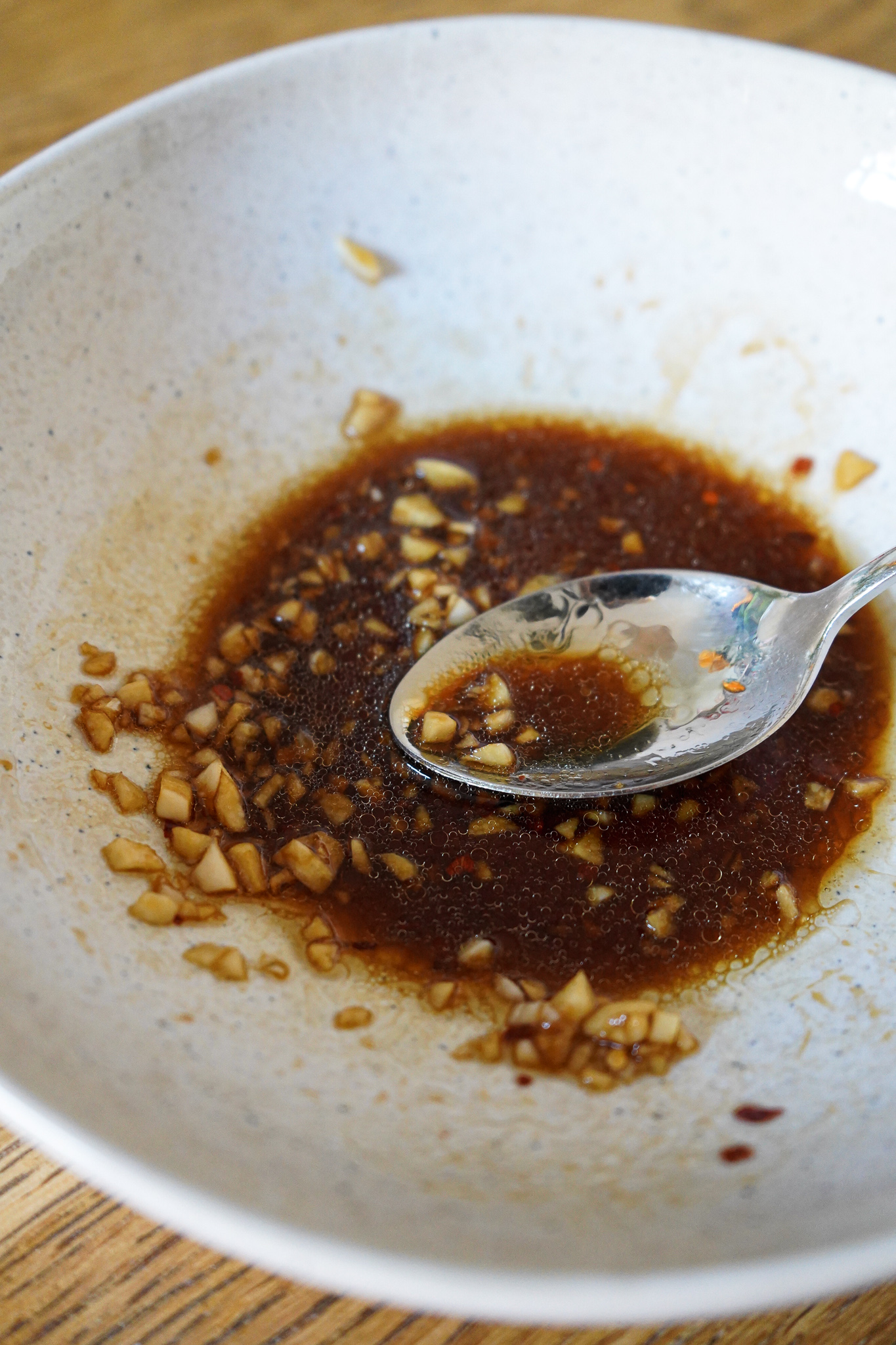 Knoblauch sehr fein hacken oder quetschen. Mit Sojasoße, Reisessig, Sesamöl und ggf. Chiliflocken in einer Schüssel vermengen. Minimal salzen. Abschmecken. Zu scharf oder sojasoßig? Dann gerne ein wenig Agaven- oder Kokosblütensirup dazu geben. Dressing dann beiseite stellen.