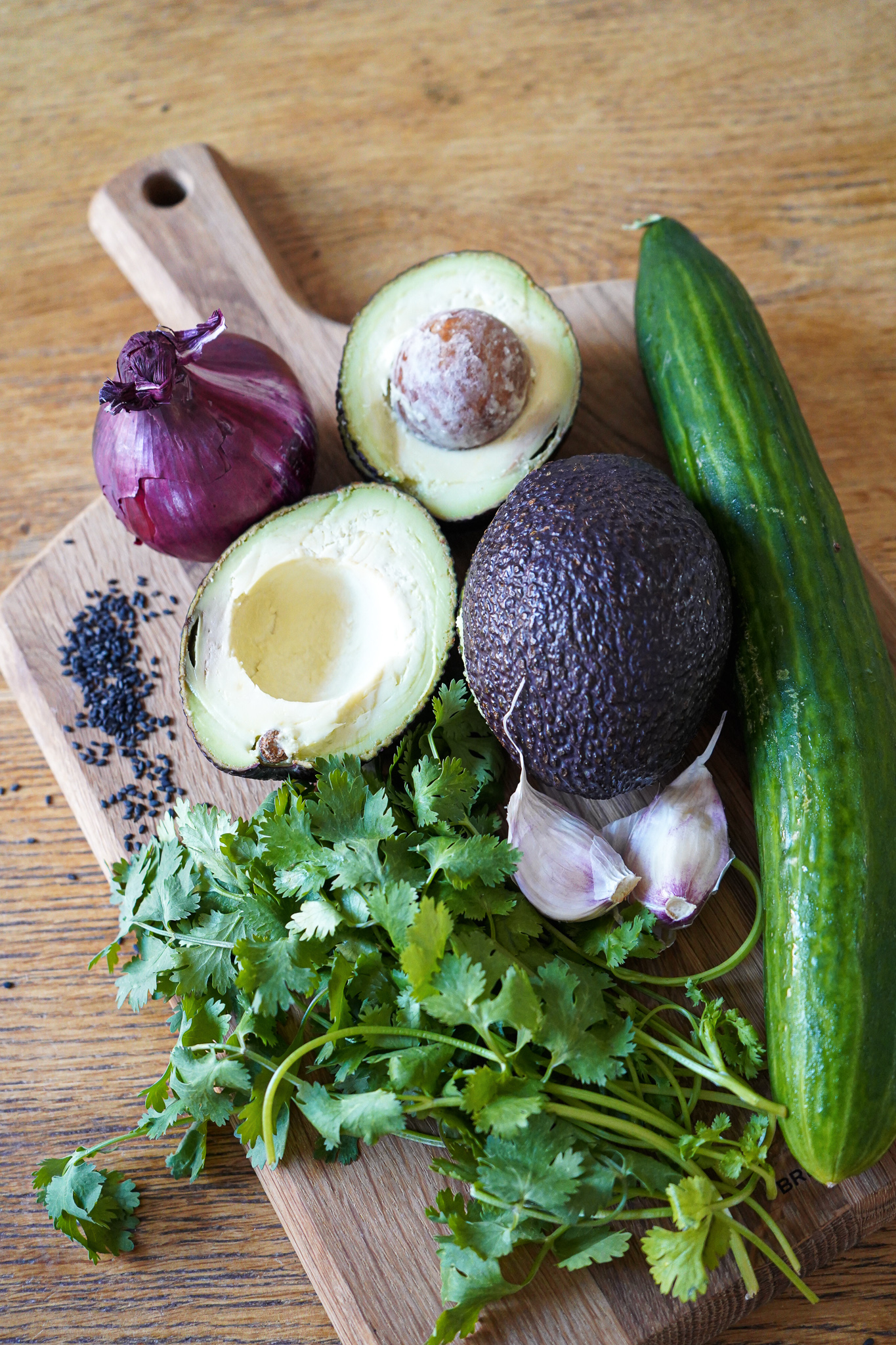 Zwiebeln schälen und klein schneiden. Gurke waschen und würfeln. Avocado halbieren und schälen. Die Avocados in einer Schüssel wie Schiffchen anrichten. Mit Gurken und Zwiebeln bestreuen. Koriander darüber zupfen. Dressing mit einem Löffel über das Gemüse geben. In den Avocados sollten sich kleine Dressing-Pools bilden. Mit Sesam bestreuen und wer mag: noch mehr Koriander.