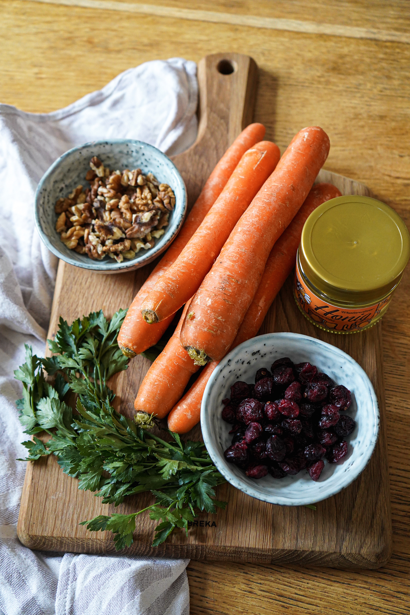 Möhren schälen und in Scheiben hobeln. Wichtig: Die Scheiben sollten dünn sein, aber nicht zu labberig. Ein wenig salzen. Cranberrys und Walnüsse dazu geben. Petersilie von den dicken Stielen zupfen und grob hacken. Kurz beiseite stellen. In einer kleinen Schale den Honig mit Essig, Salz und Olivenöl verrühren. Abschmecken.