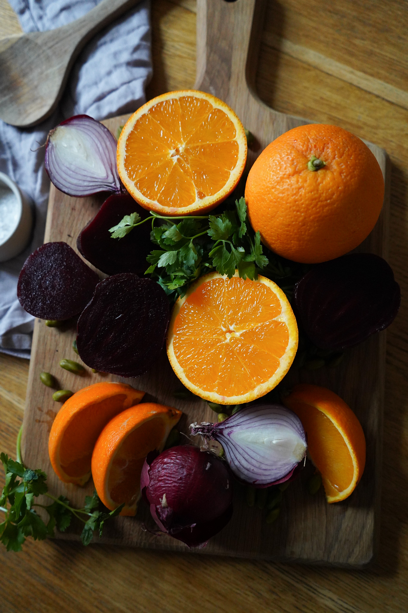Rote Bete und Zwiebel klein würfeln. Orange waschen. Mit einer feinen Reibe 2 EL Orangenschale für das Dressing gewinnen. Orangen dann schälen. Dafür am besten die beiden Pole der Frucht kappen, die eine flache Seite auf einem Brettchen aufsetzen. Schale rundherum abschneiden. Auch die weiße Haut entfernen. Die Orangen in nicht zu dünne Scheiben schneiden. Den Saft dabei auffangen. Wenn das nicht reicht, eine weitere 1/2 Orange auspressen. Auf einer Servierplatte und flachen Teller anrichten. Rote Bete und Zwiebelwürfel darüber geben. Für das Dressing Orangensaft, Orangenschale, Apfelessig, Meersalz und Olivenöl verrühren. Über den Salat geben. Pfeffern und 10 Minuten ziehen lassen. In der Zeit in einer Pfanne ohne Öl die Pistazien leicht anrösten. Über den Salat geben und mit reichlich Petersilie garnieren.