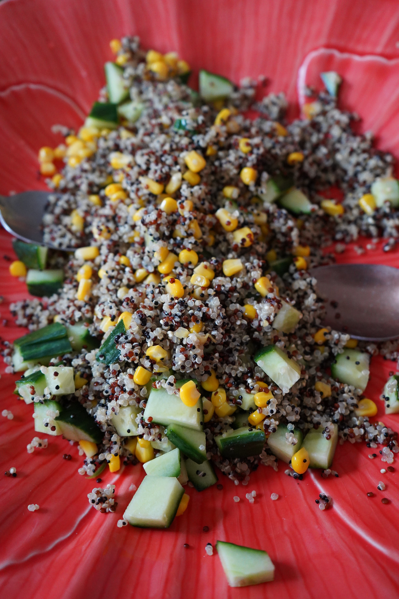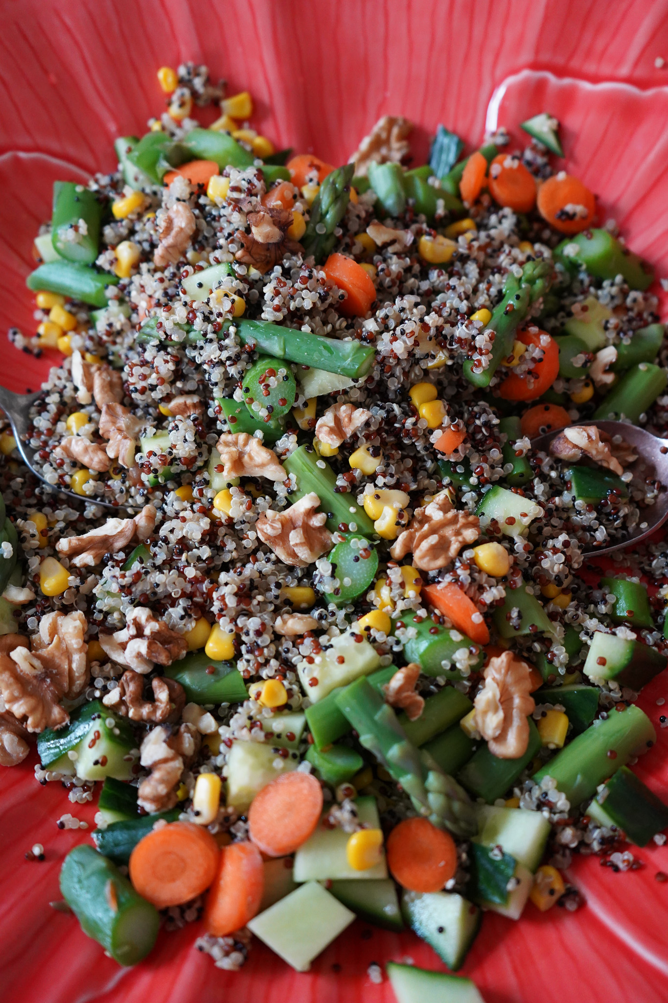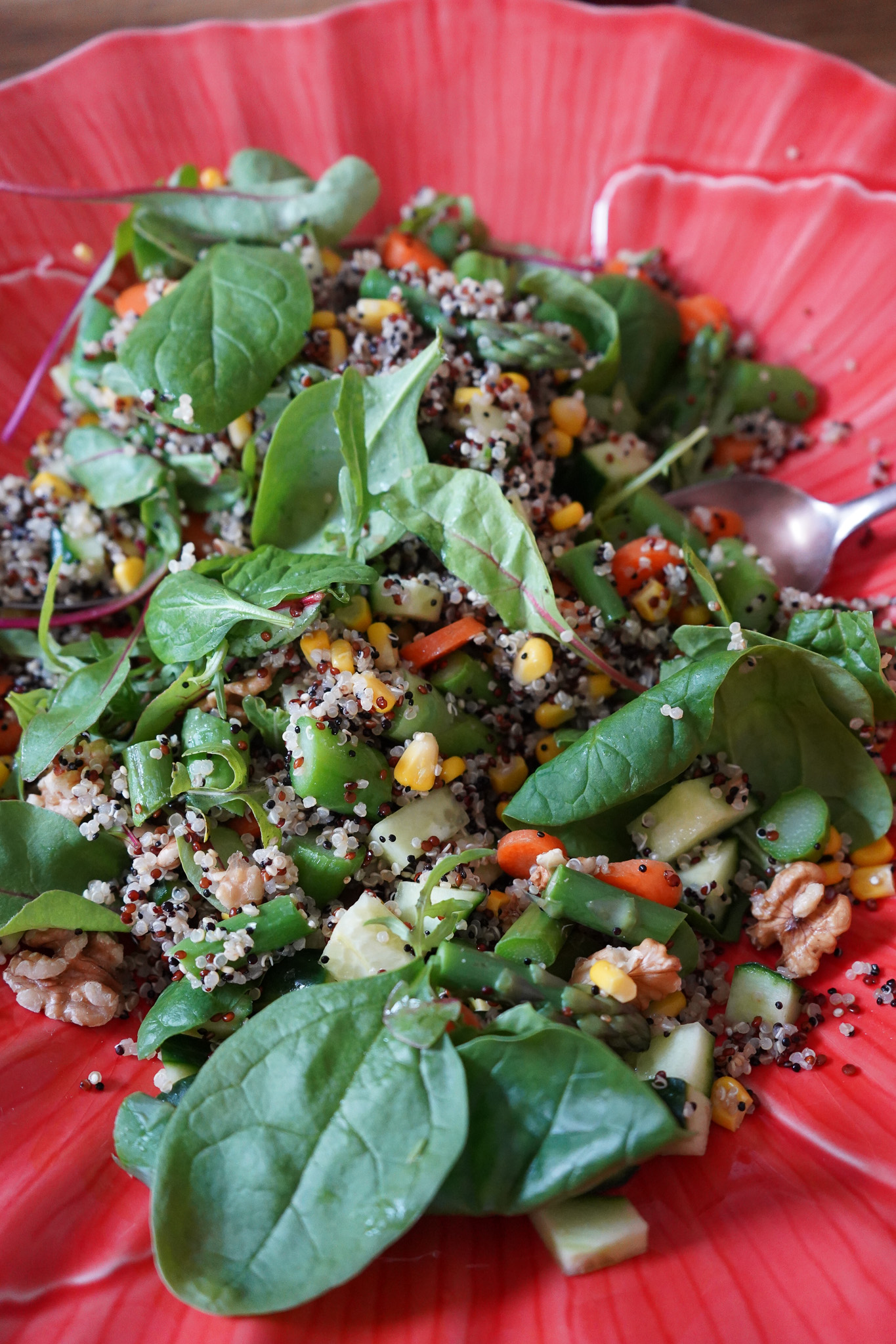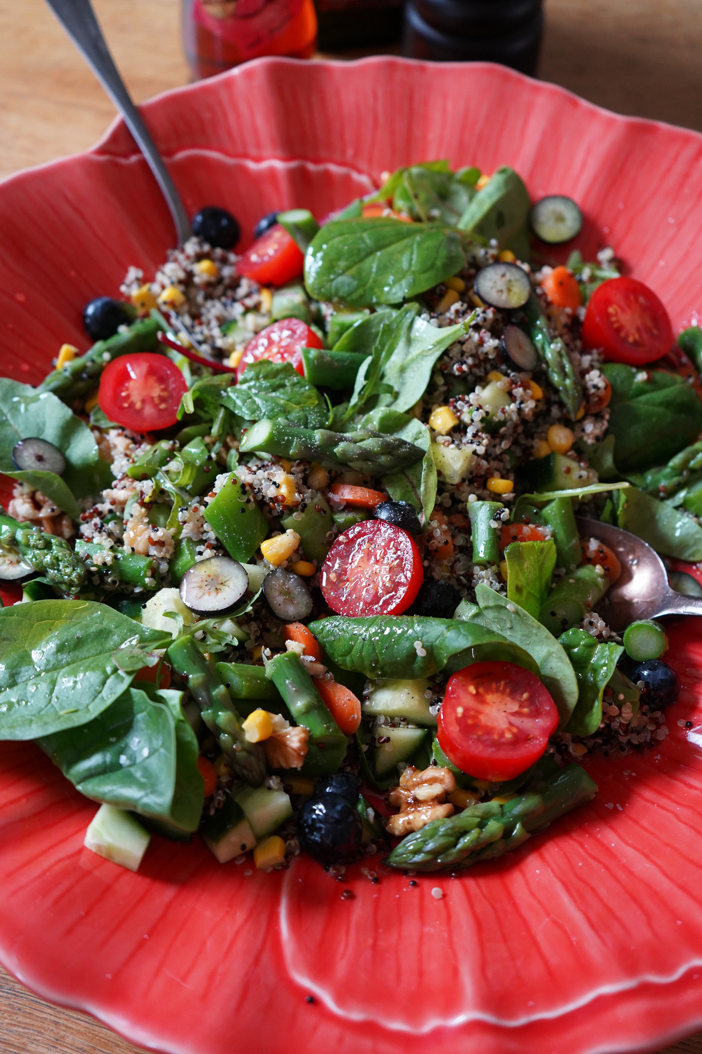 Römersalat halbieren, vierteln und in schmale Streifen schneiden. Blattsalate ggf. waschen und olle Blätter aussortieren. Dann geht’s schon ans Anrichten! Quinoa auf einem großen flachen Teller oder Schüssel ausbreiten. Meine Mohn-Schüssel stammt aus Portugal. Spargel, Möhren, Gurken, Mais und Walnüsse dazu geben und alles vorsichtig miteinander vermischen. Hier schon mal salzen, ein Schwenker Essig darüber geben. Blattsalate ebenfalls vorsichtig untermischen. Tomaten und Blaubeeren auf den Salat setzen. Noch mal alles salzen, Essig darüber schwenken und zum Schluss einen großen Schlenker Olivenöl. Je besser als Öl, desto besser schmeckt der Salat. Wer mag, geht noch mit der Pfeffermühle über den Salat. Fertig, lecker!