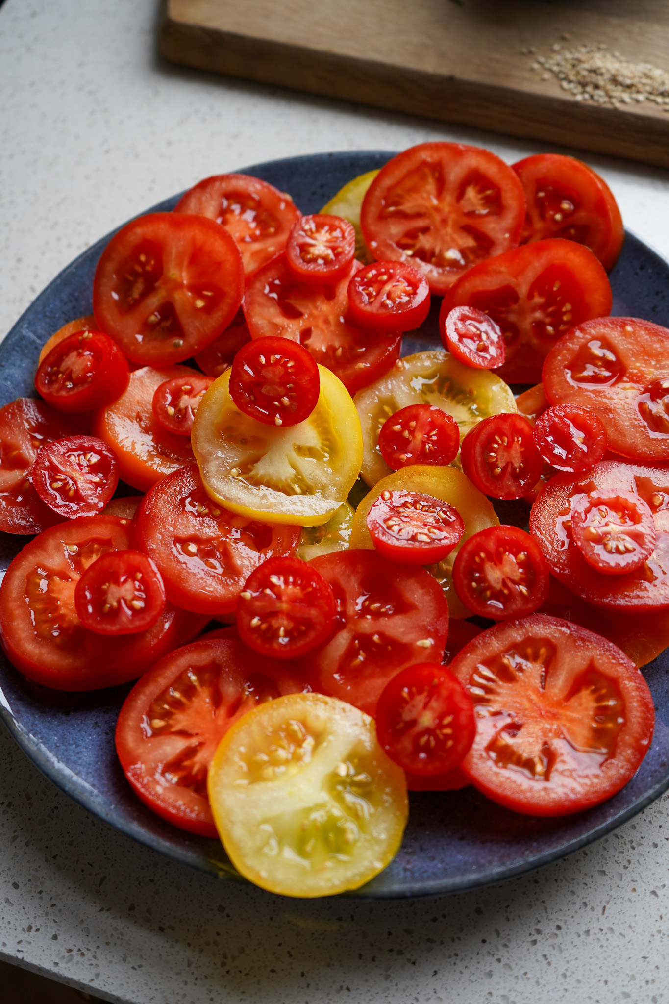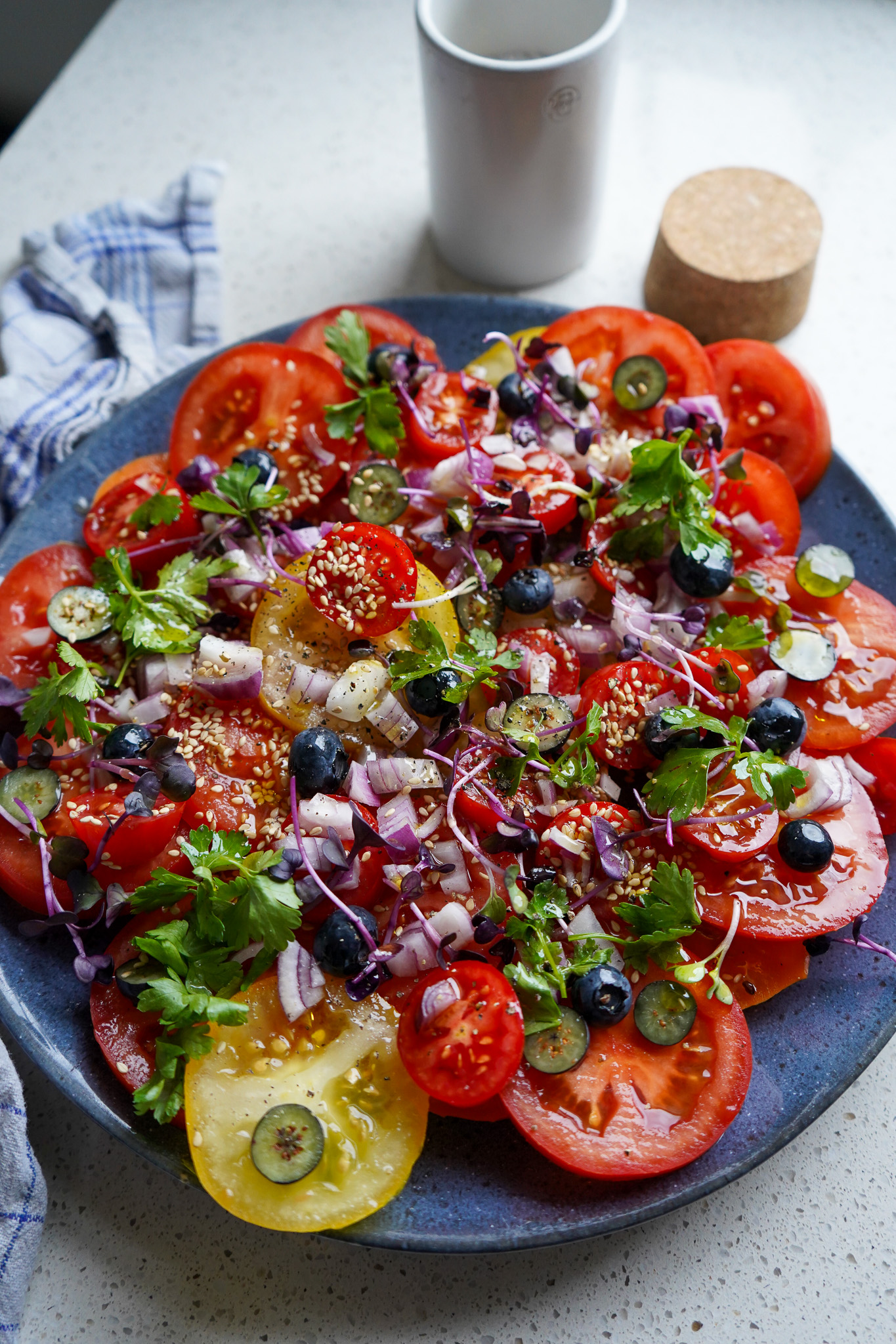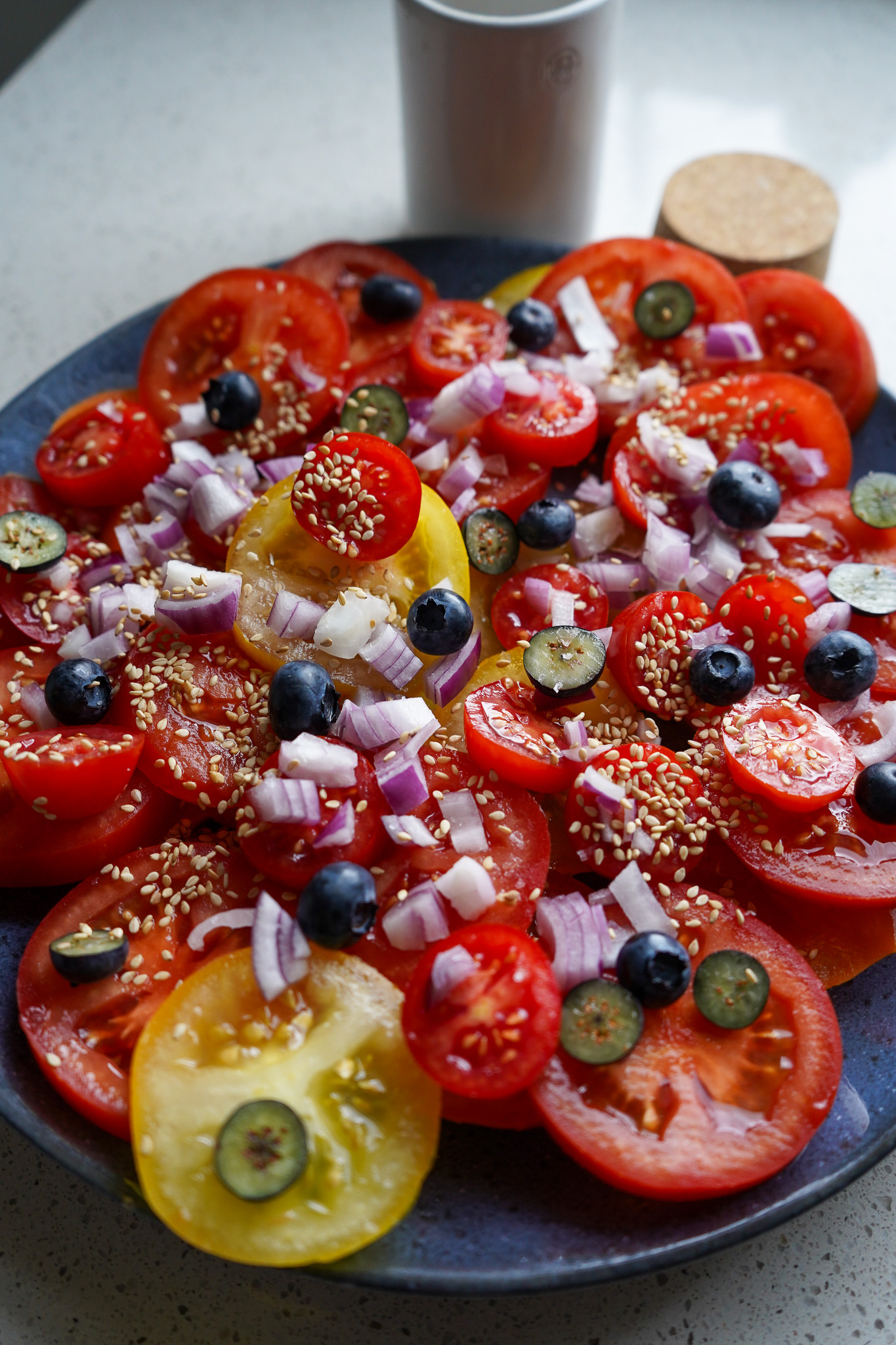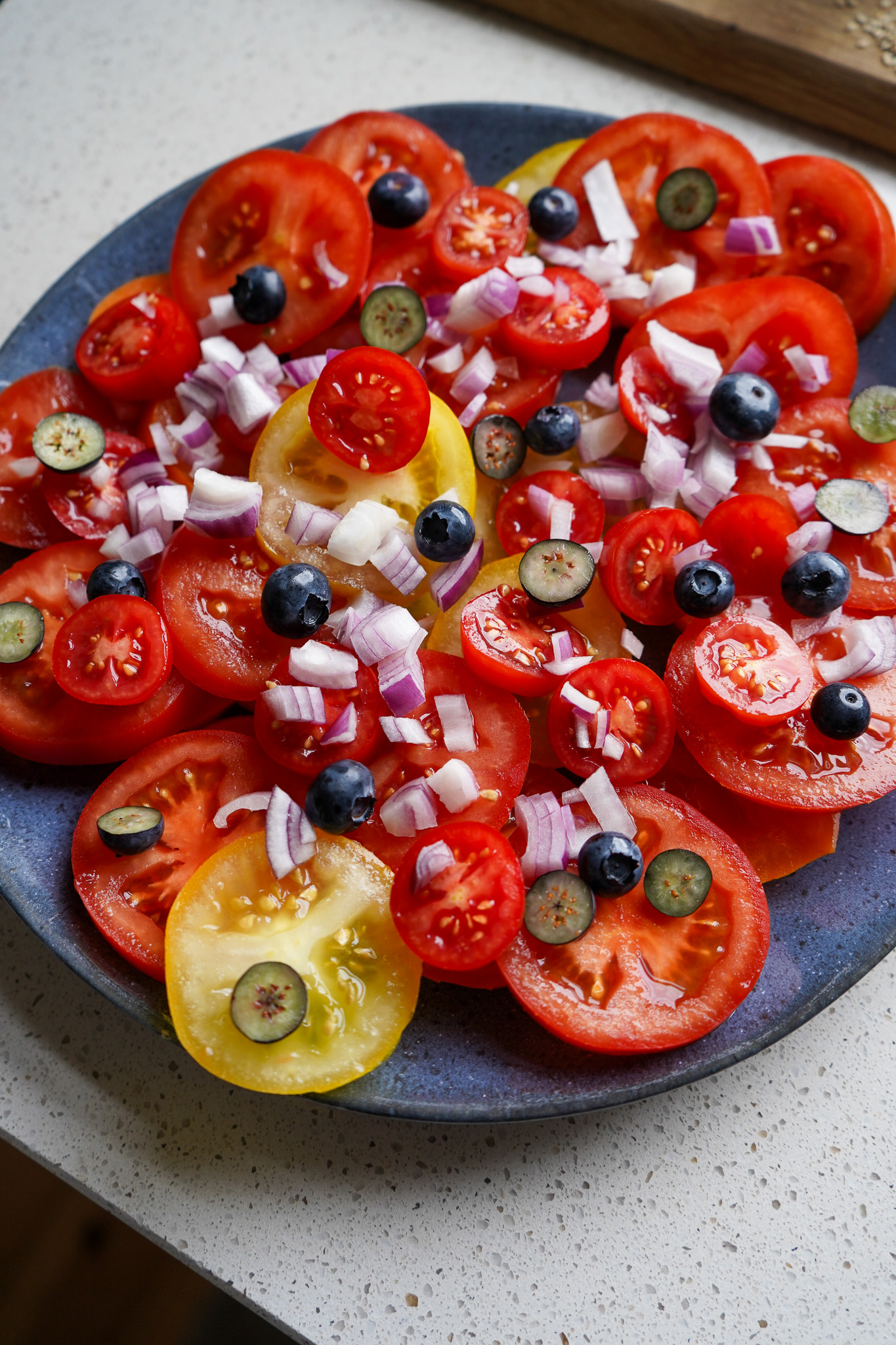 Dieser Salat schreit „Sommer!“ Alle Zutaten sind schnell bereit und der Salat eignet sich als Mittagessen oder als Beilage zum Grillen. Ich esse fast täglich Tomaten und Blaubeeren und kann nicht genug davon bekommen. Wichtig für die Zutaten ist die Anrichtung auf einem flachen Teller. Also bitte nicht alles in eine Schüssel kippen und die Stars dabei zermatschen. Die brauchen eine Bühne und das ist am besten ein kontrastreicher Teller!