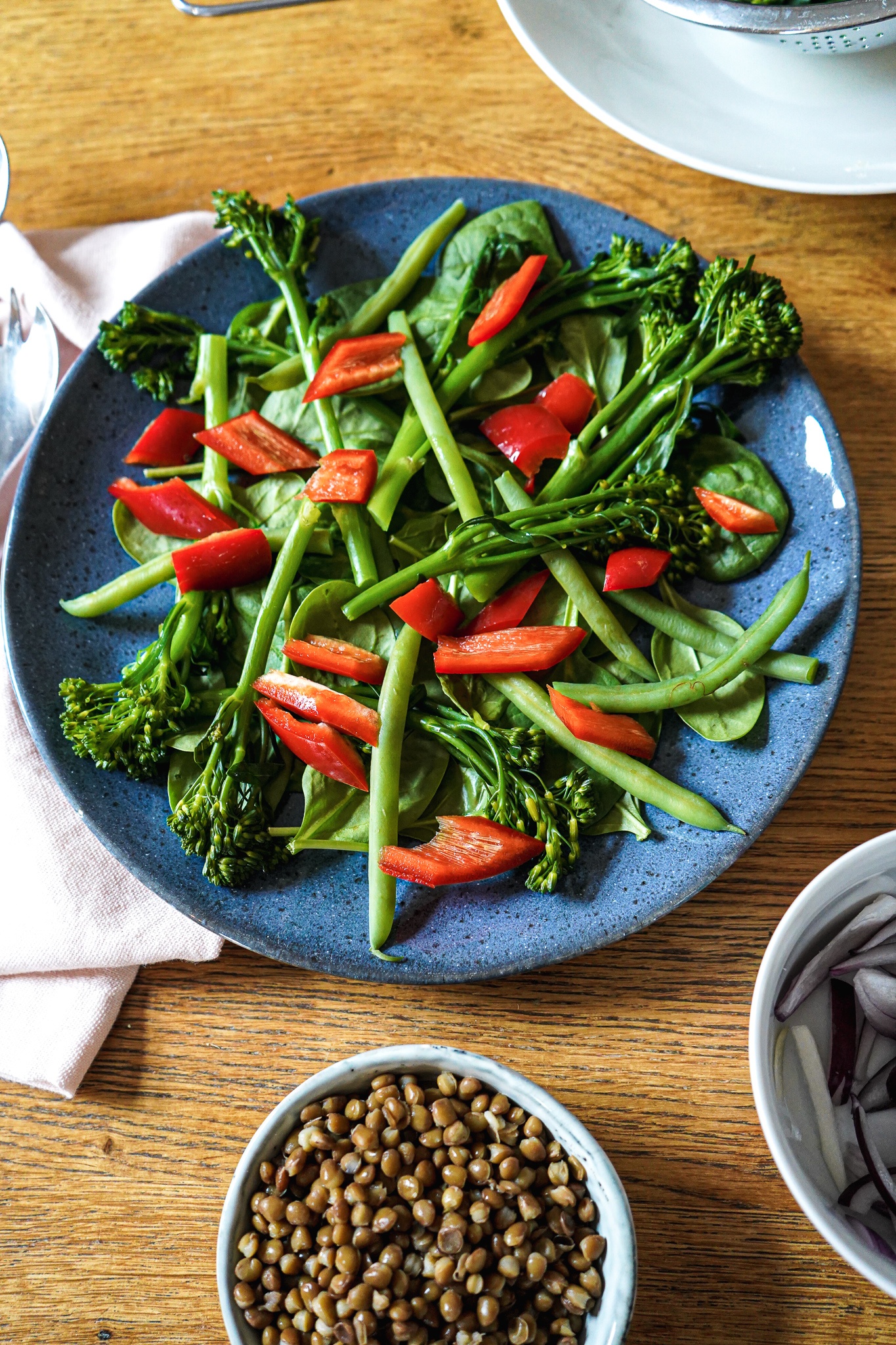 Paprika und Brokkoli waschen und abtropfen lassen. Linsen in ein Sieb geben, mit Wasser abspülen und ebenfalls abtropfen lassen. In einem großen Topf Wasser mit 1 EL Speisesalz (zum Kochen müssen es keine Meersalzflocken sein, finde ich) erhitzen. Wenn das Wasser kocht, den Brokkoli für ca. 5 Minuten kochen. Sobald er bissfest gegart ist, den Brokkoli kalt abspülen, abtropfen lassen und beiseite stellen. Das Gleiche mit den Grünen Bohnen machen. Man kann auch beide Sorten in einen Topf schmeißen, aber die Bohnen könnten etwas länger als der Brokkoli brauchen.