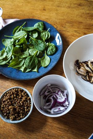 Linsen vorsichtig auf den Blattsalaten verteilen. Paprika und Zwiebeln darüber dekorieren. Es soll hübsch aussehen! Dann kommen die Pilze dazu. Mit einem Esslöffel das Dressing über das Gemüse träufeln. Mit Sesam bestreuen und servieren.