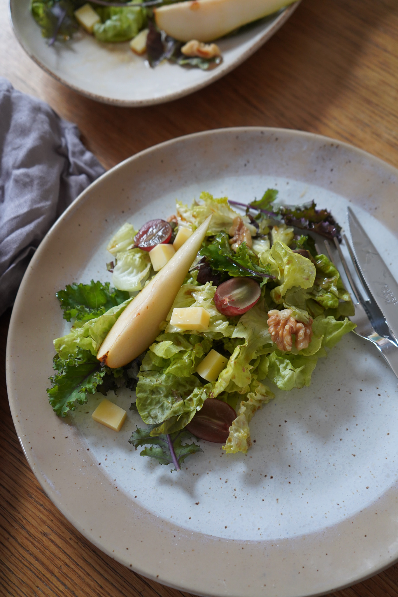 Birnen, Käse, Trauben und Nüsse auf dem Salat verteilen. Sofort servieren. Ich versuche nach fast zwei Wochen Italien und einem langen Sommer gerade auf Alkohol zu verzichten, aber ein Gläschen Weißwein wäre dazu sicher nicht schlecht.