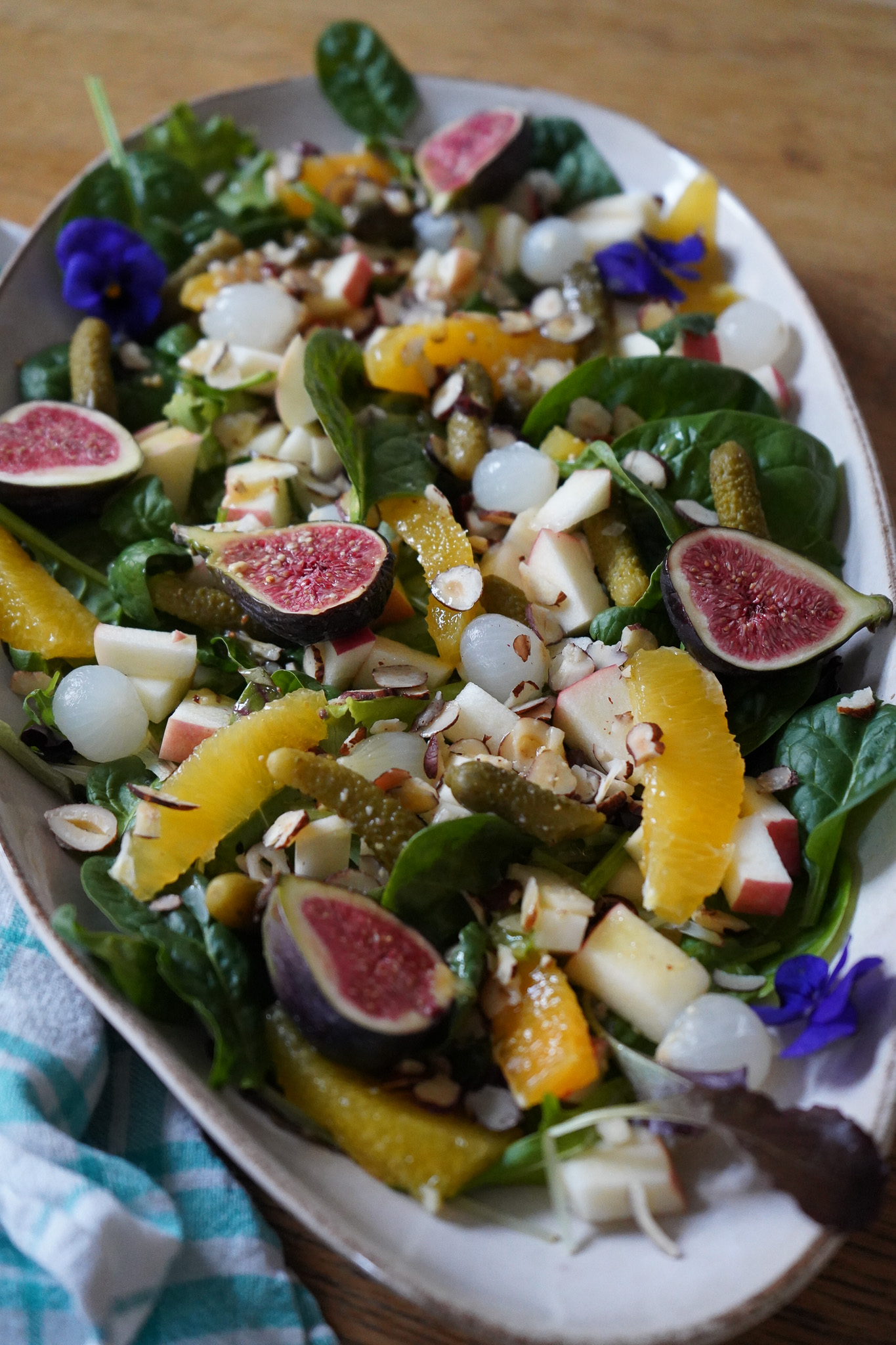 Heiligabend habe ich für meine Familie einen ähnlichen Salat gemacht und alle waren begeistert, deshalb ist das ab sofort ein neuer Standard. Ich mag an diesem schönen Salat, dass darin das Beste der kalten Jahreszeit zusammen auf den Teller kommt: Zitrusfrüchte, dunkle Blattsalate, Feigen, Nüsse und Äpfel. Und eben zwei Zutaten, die beim Fondue oder Raclette immer dabei sein müssen, aber seit 50 Jahren in der gleichen Art serviert werden, nämlich nackig und einsam als Beilage: kleine Zwiebeln und saure Gurken.